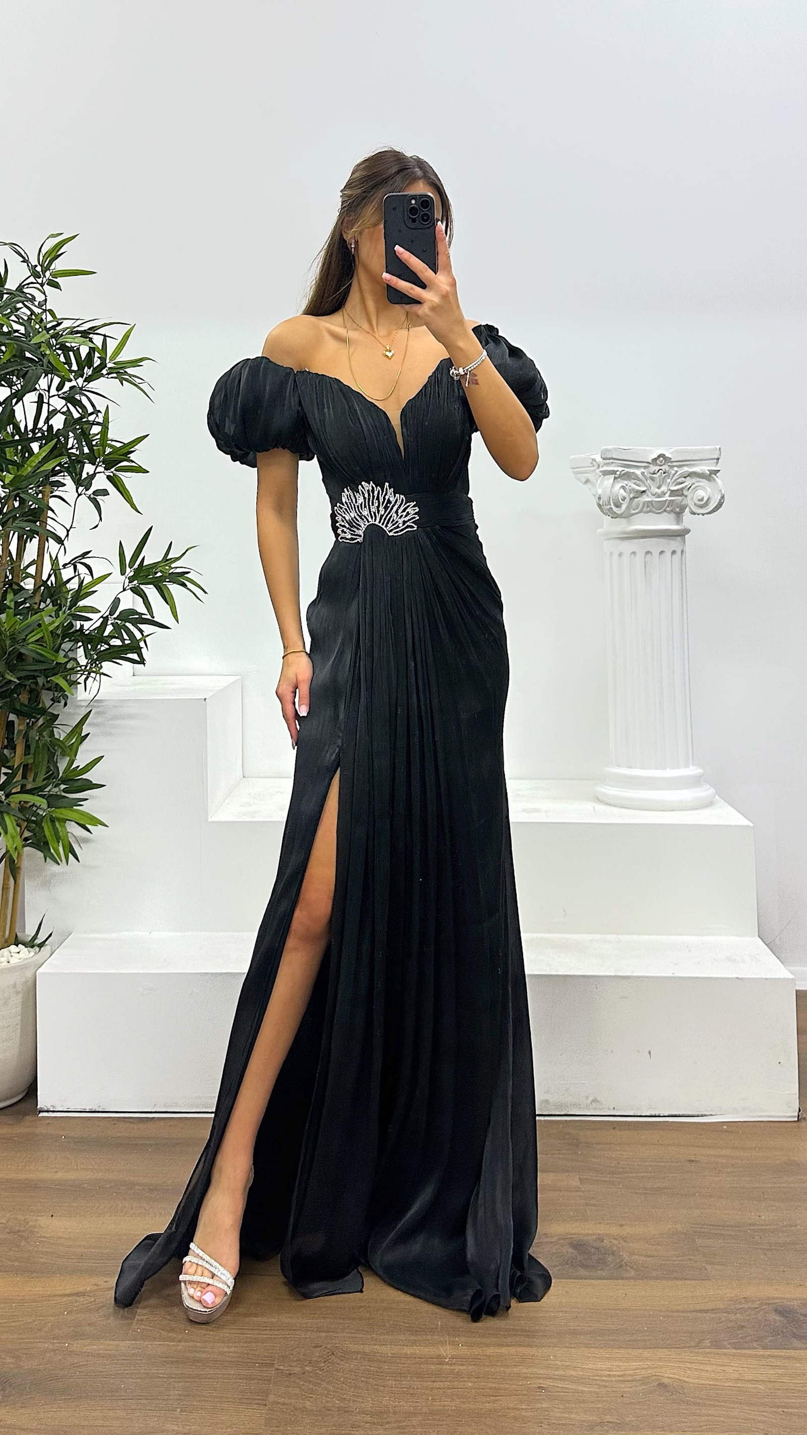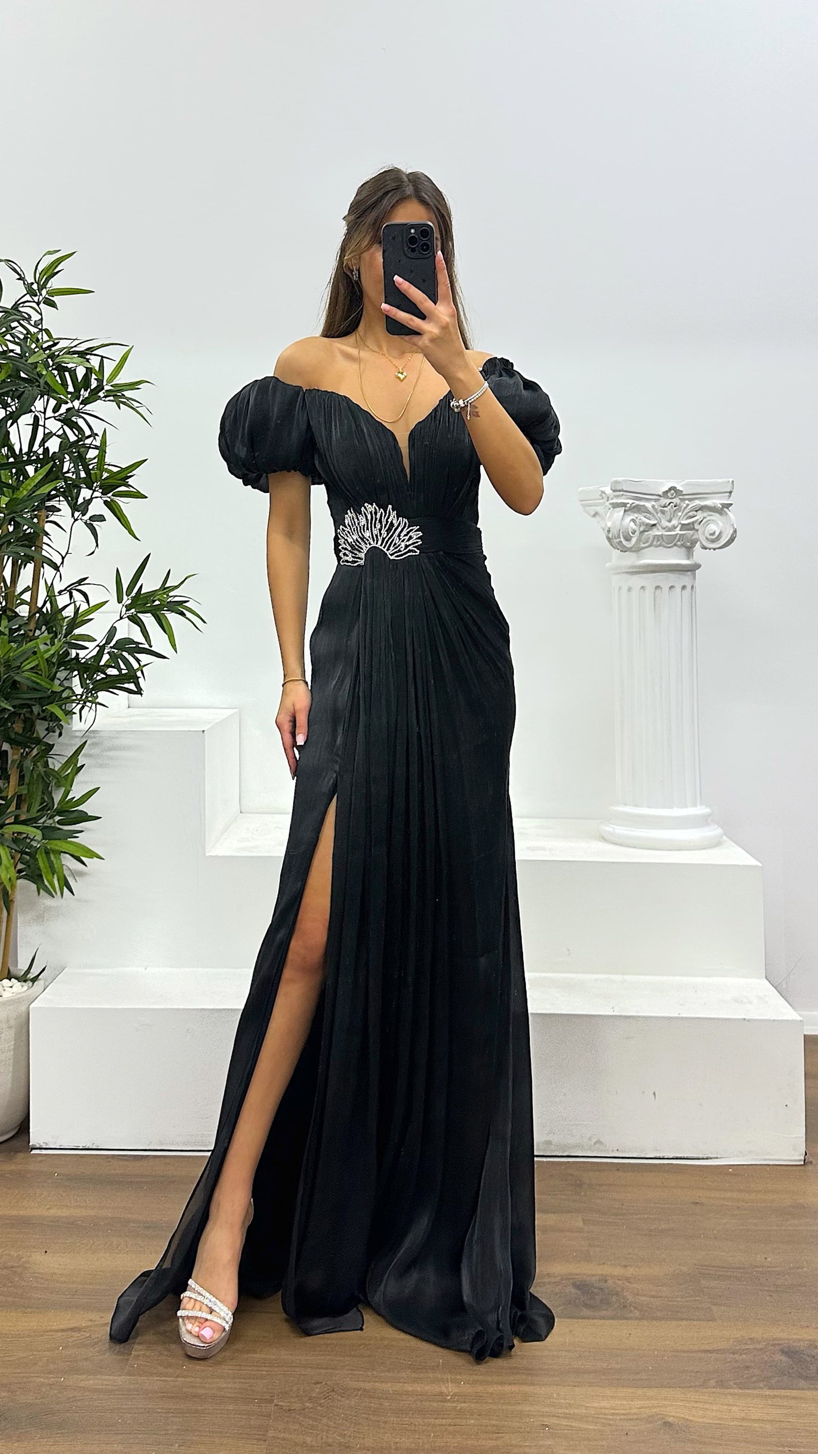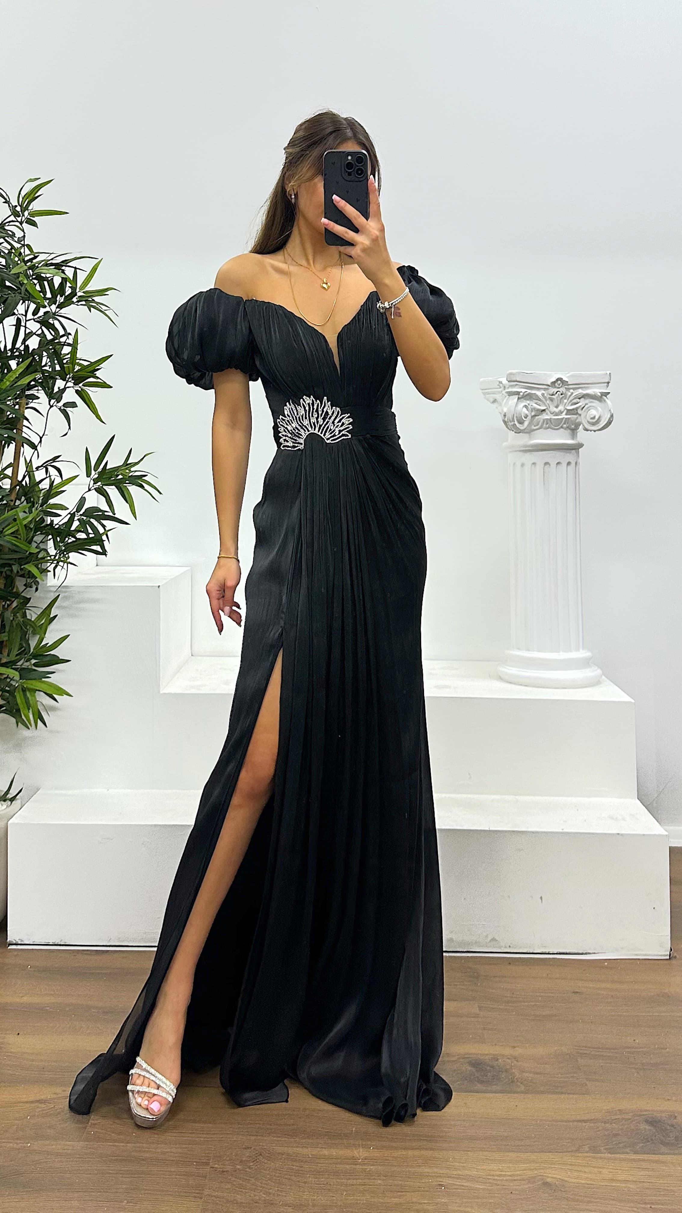 Balon kol taş detay abiye elbise