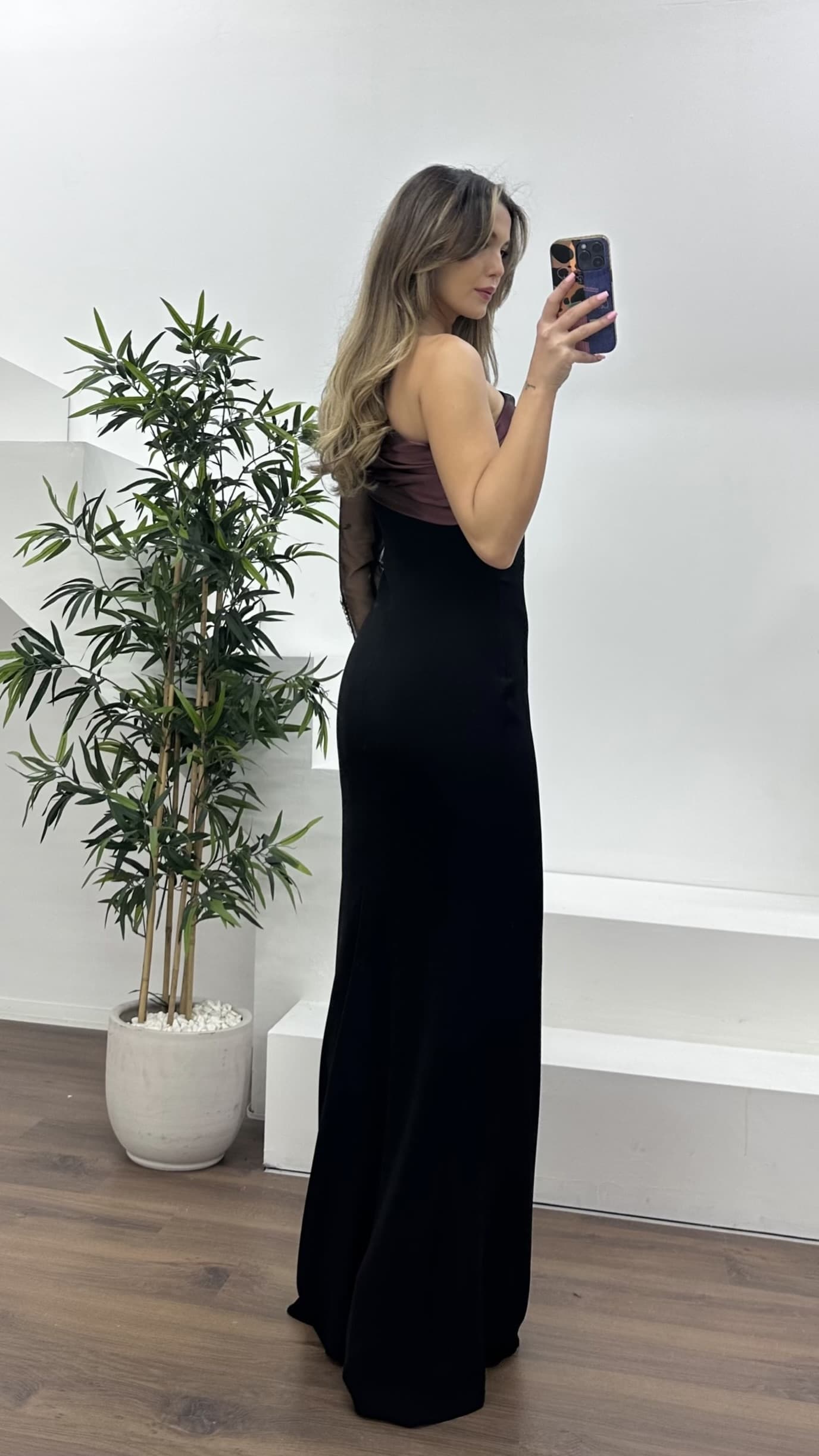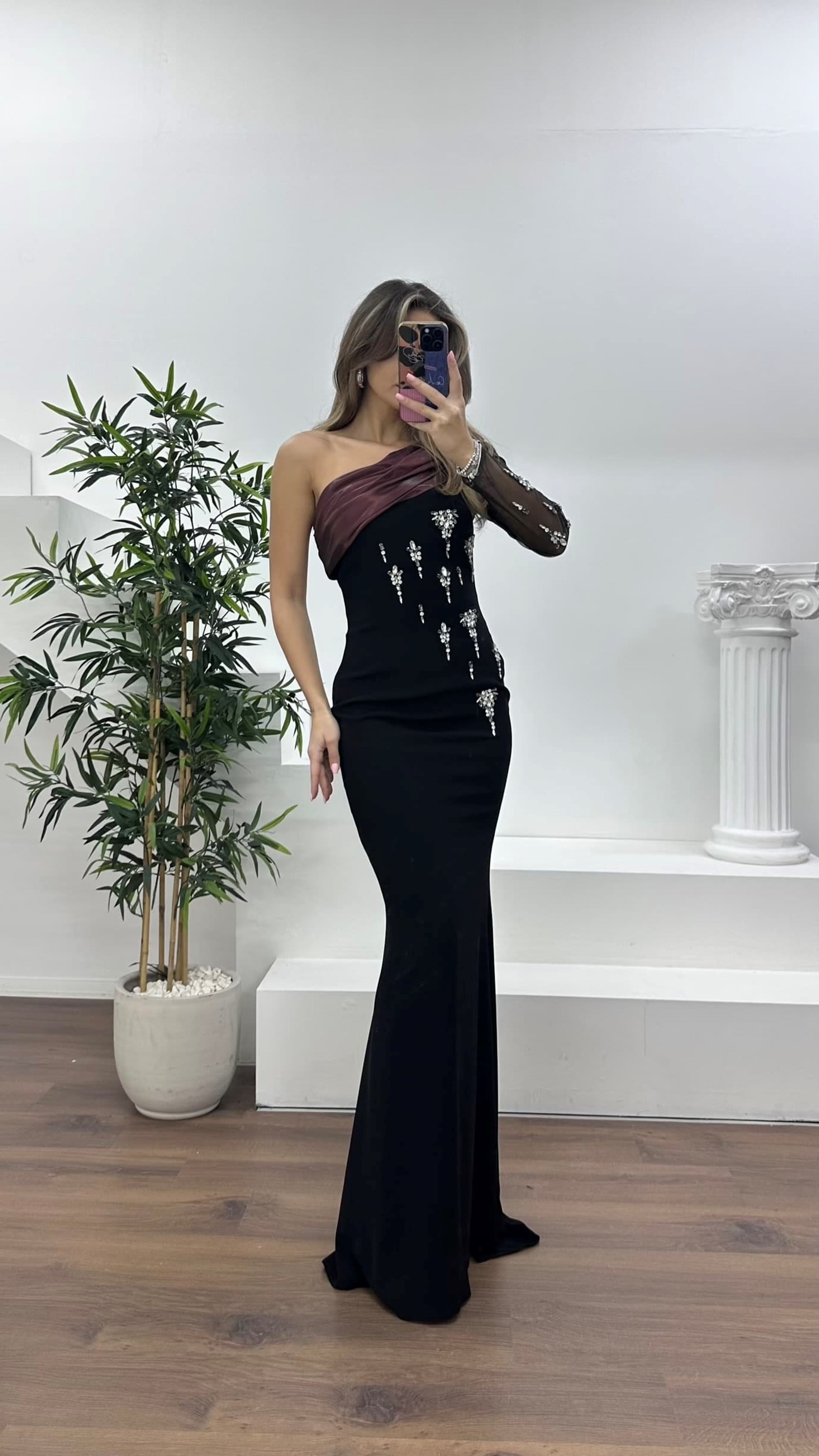 Siyah-Bordo Drapeli Taş İşlemeli Kalem Abiye Elbise