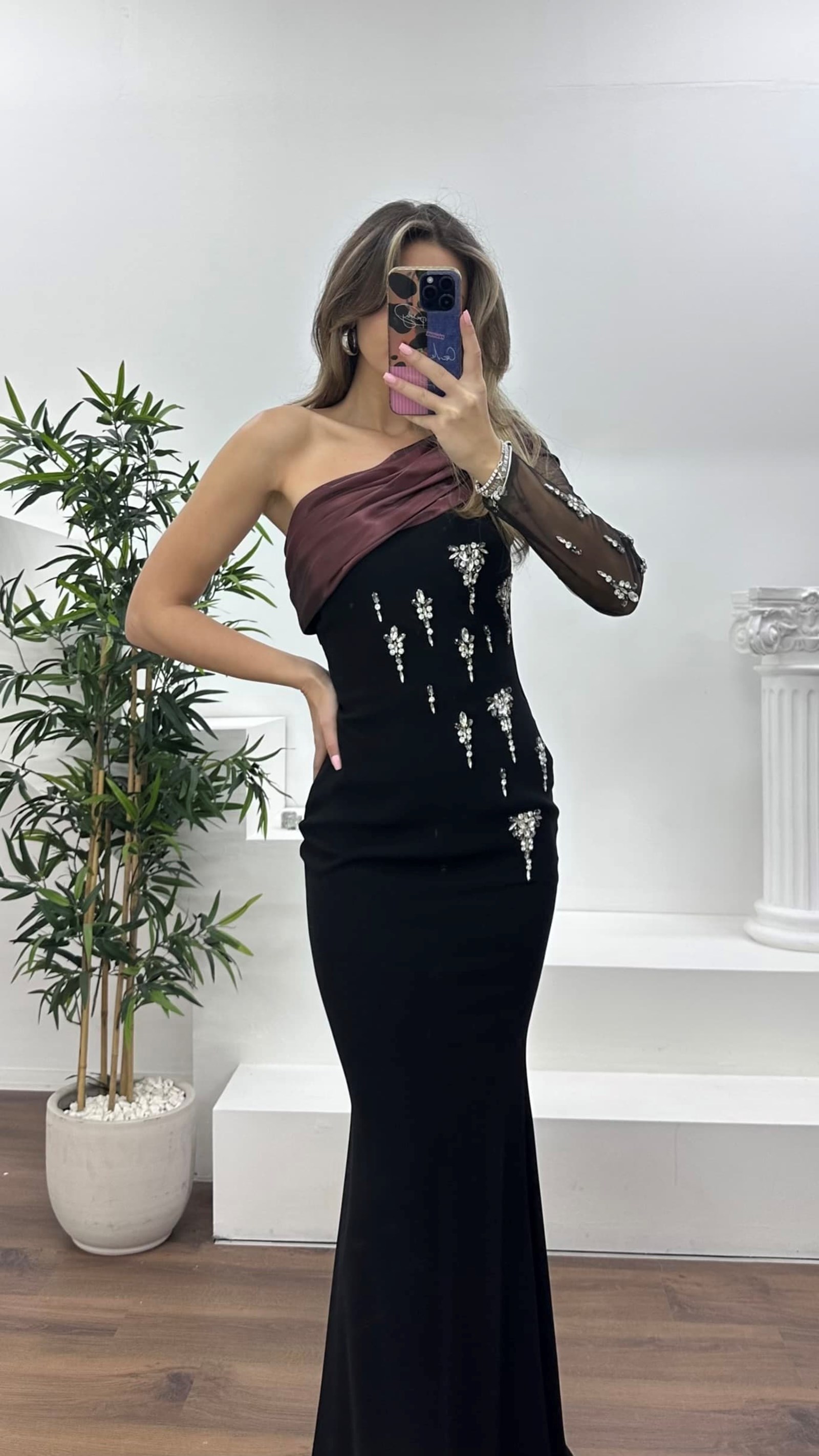 • Siyah-Bordo Drapeli Taş İşlemeli Kalem Abiye Elbise