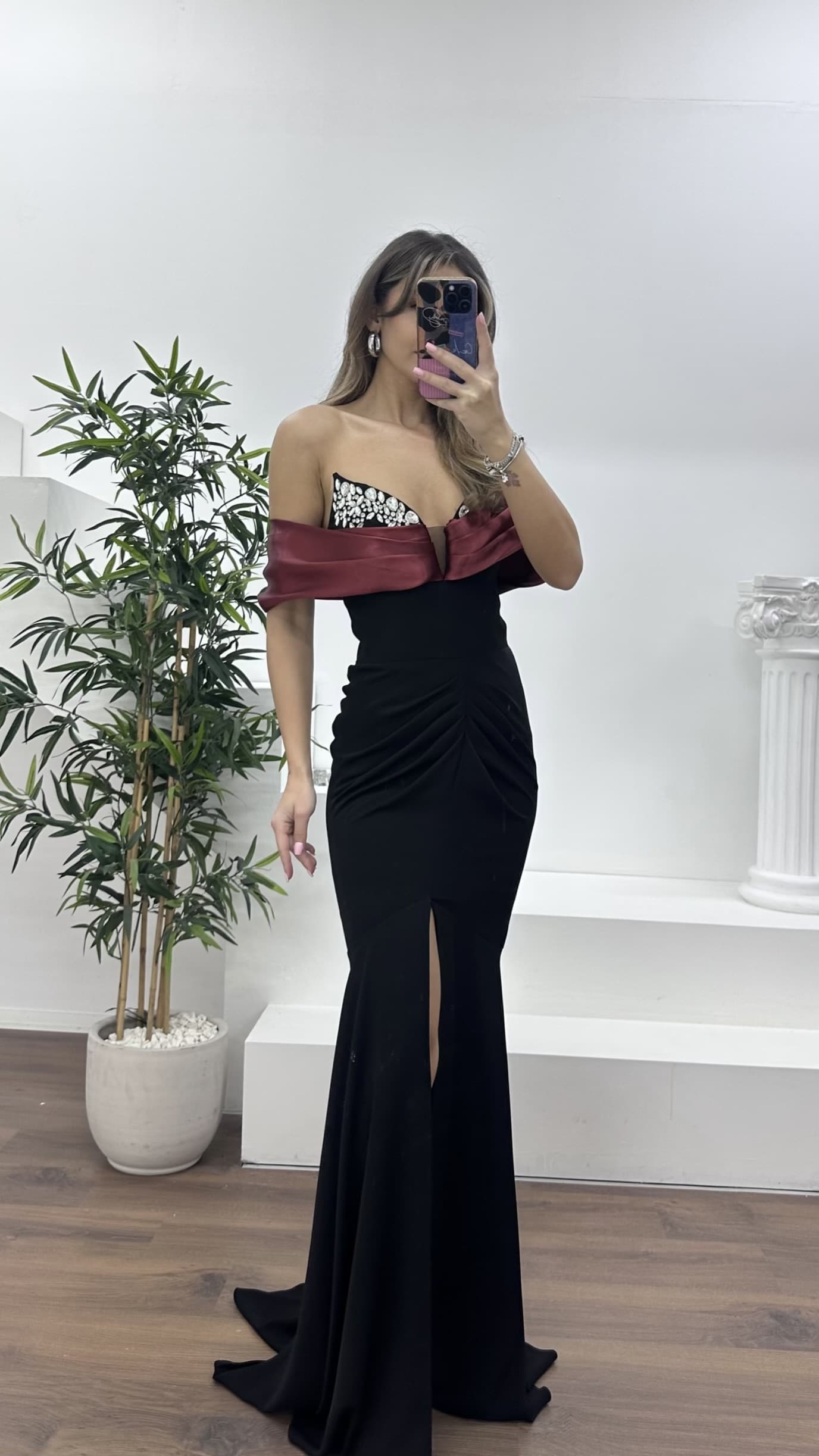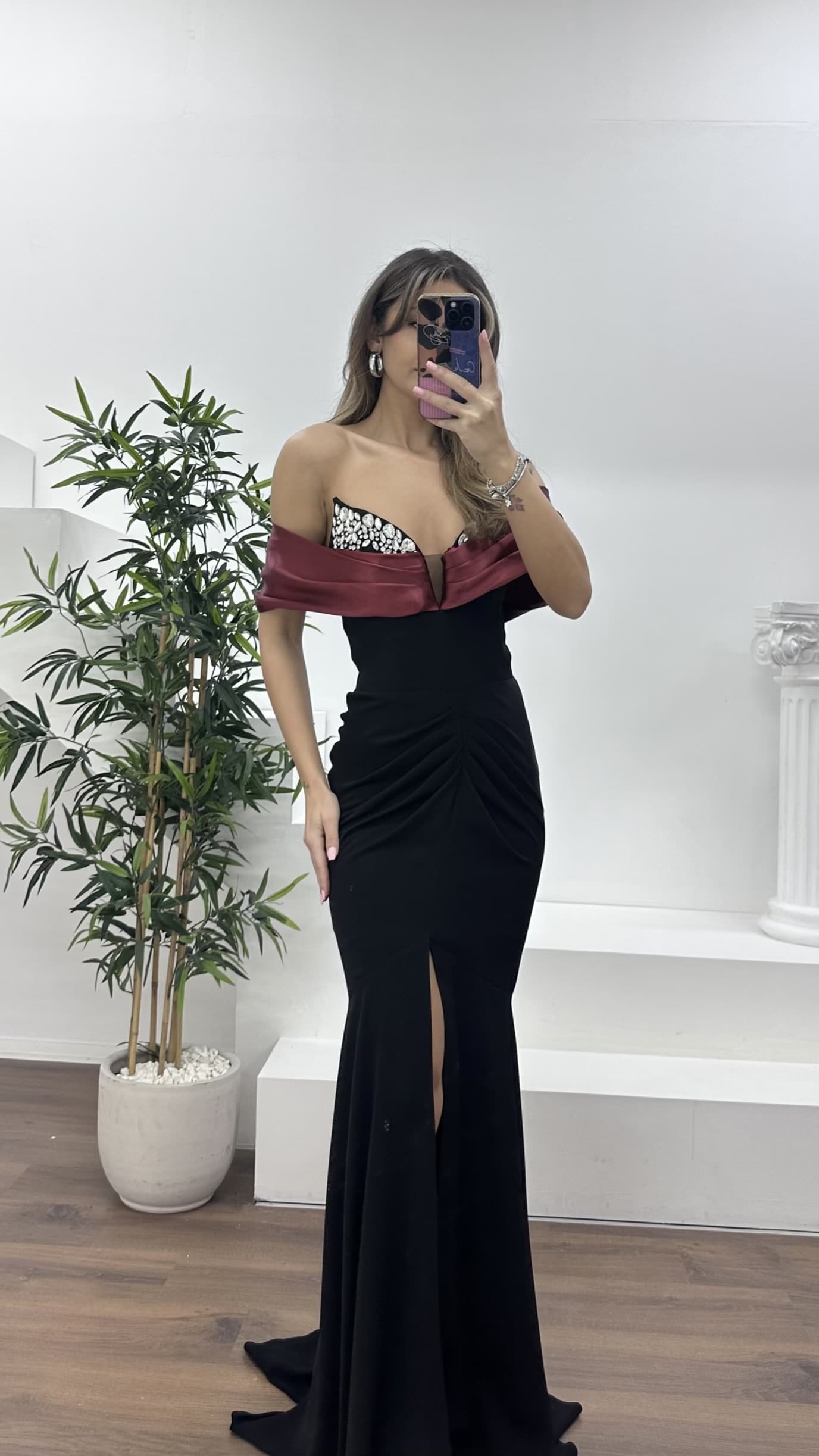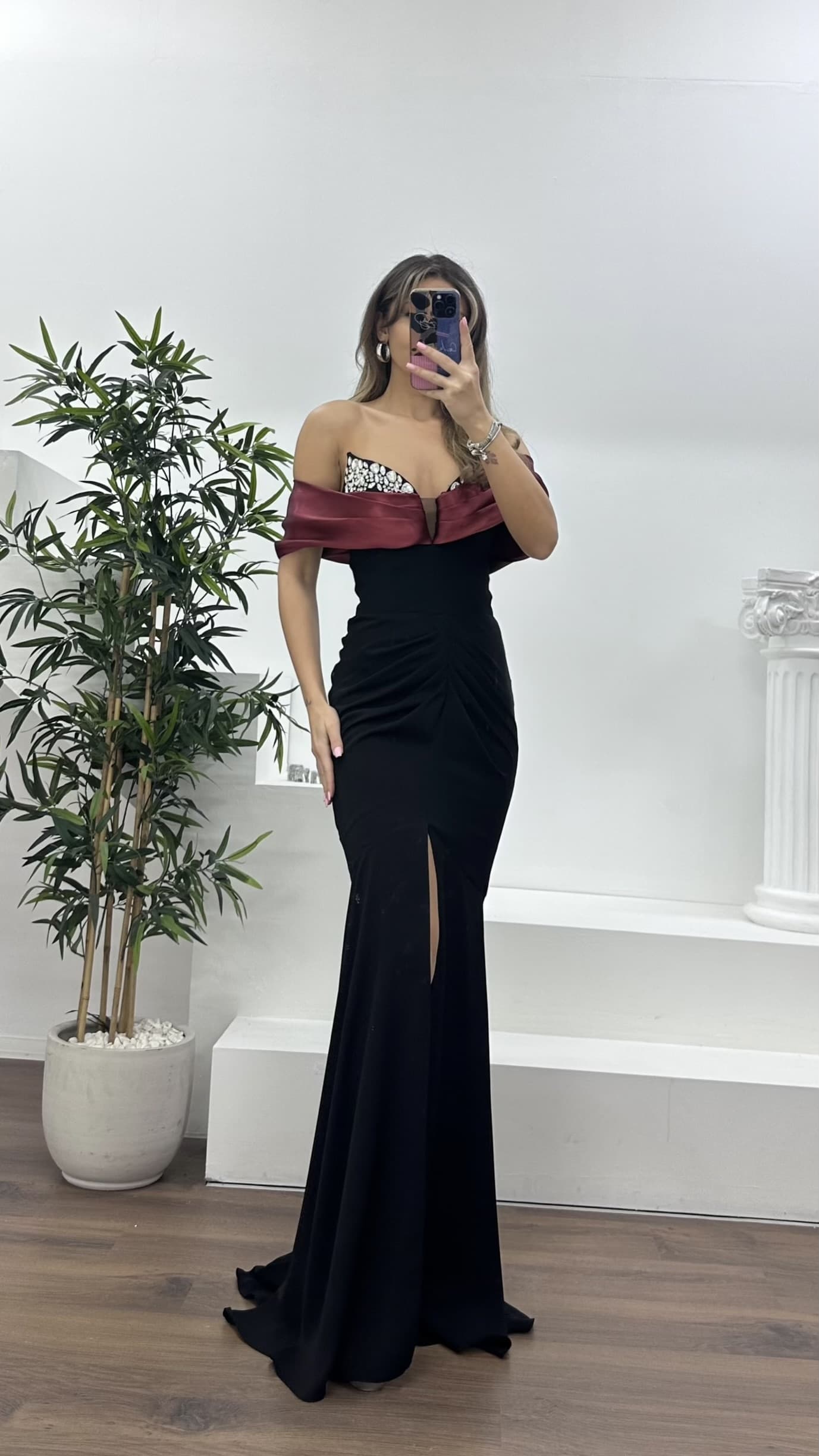 • Siyah-Bordo Straplez Yaka, Dökümlü Yan Kol Detaylı Abiye Elbise