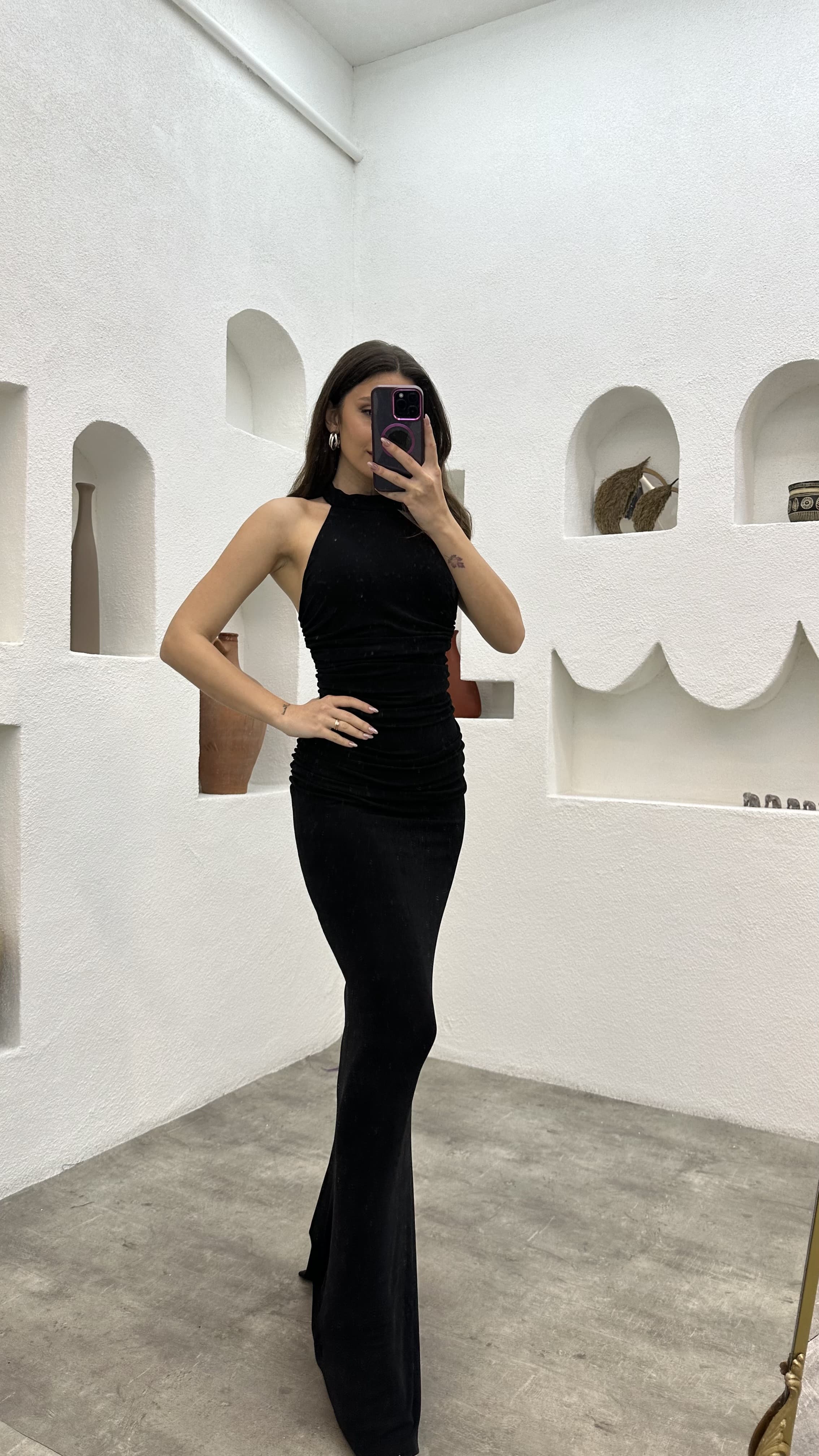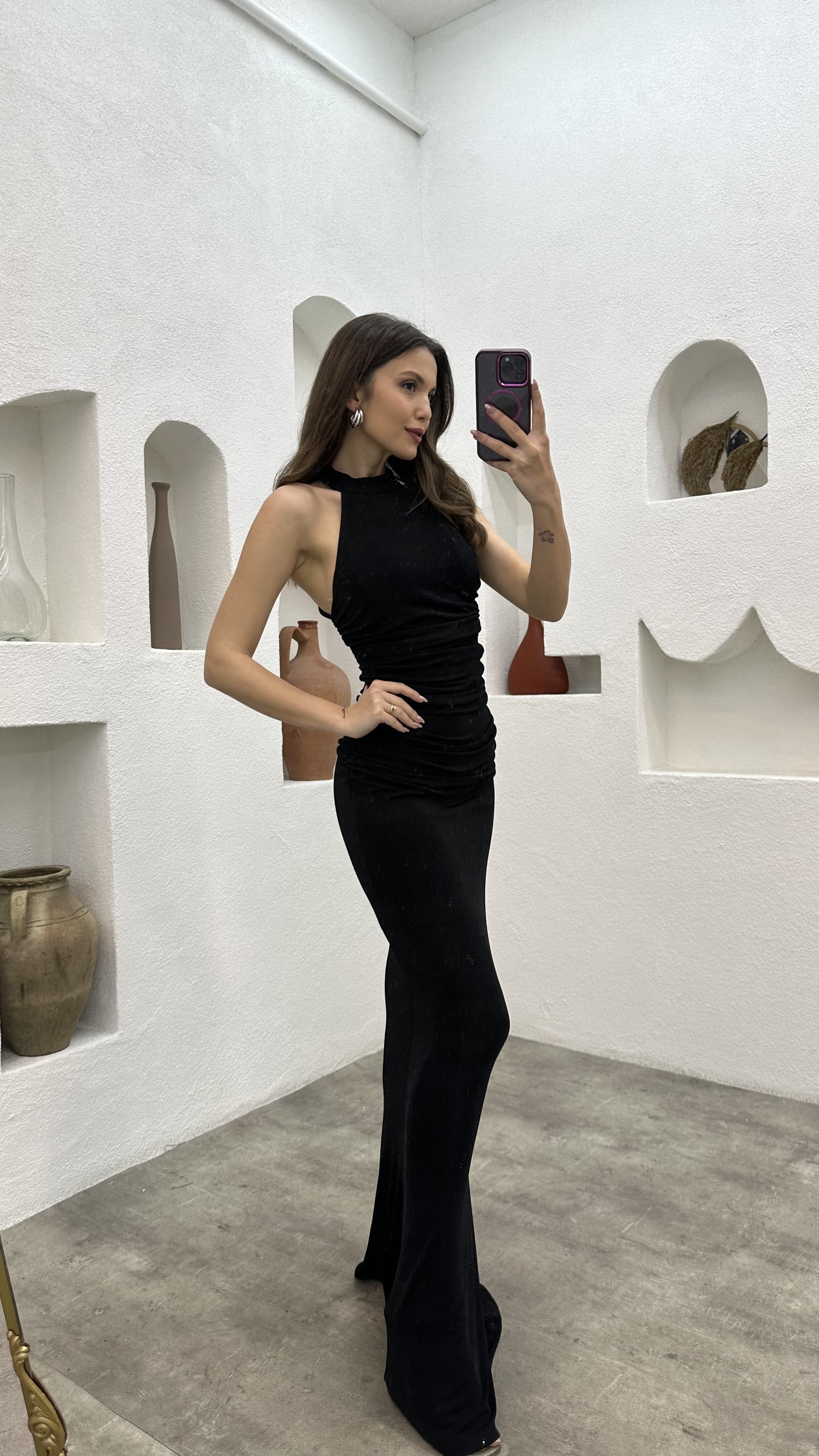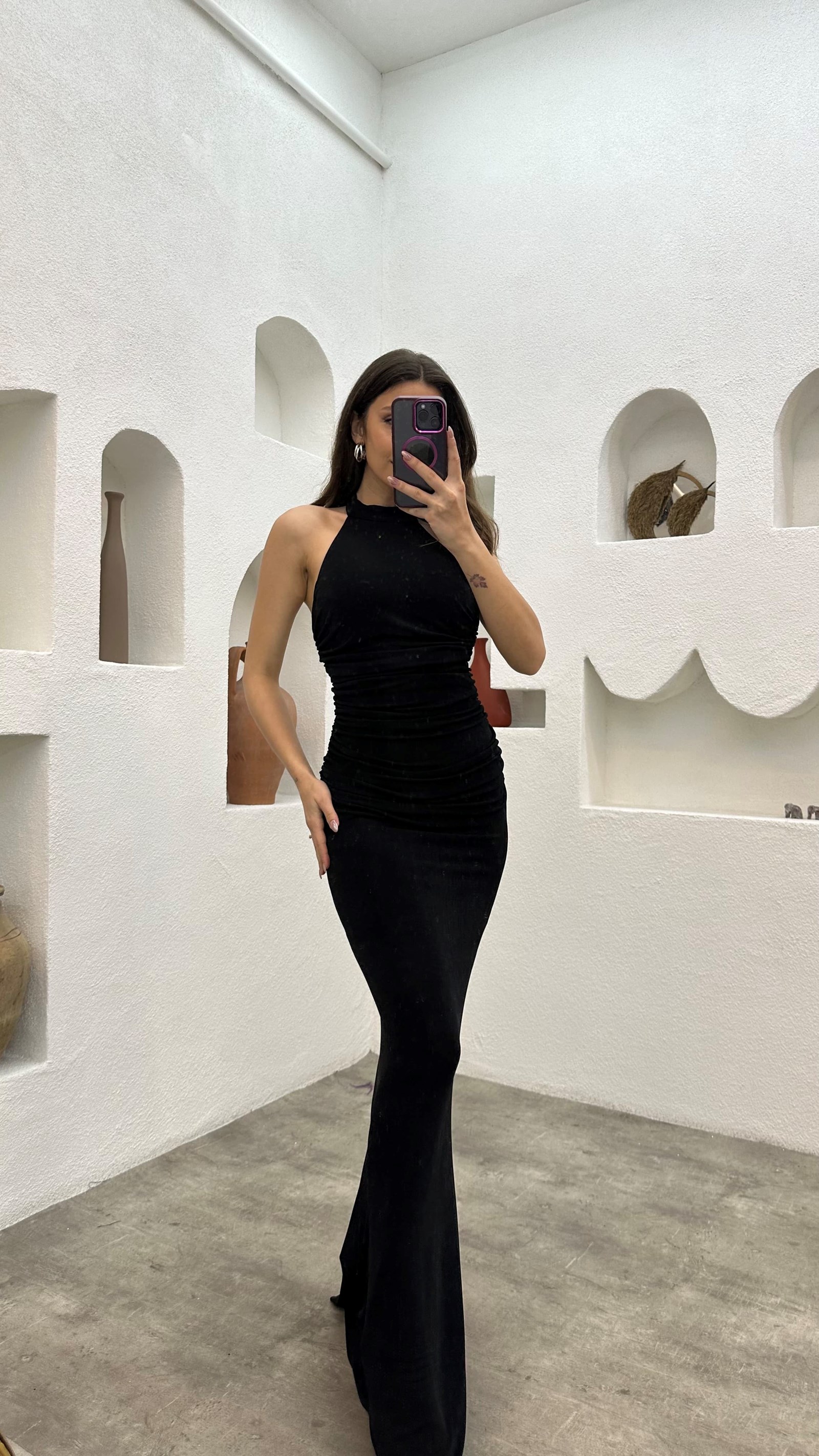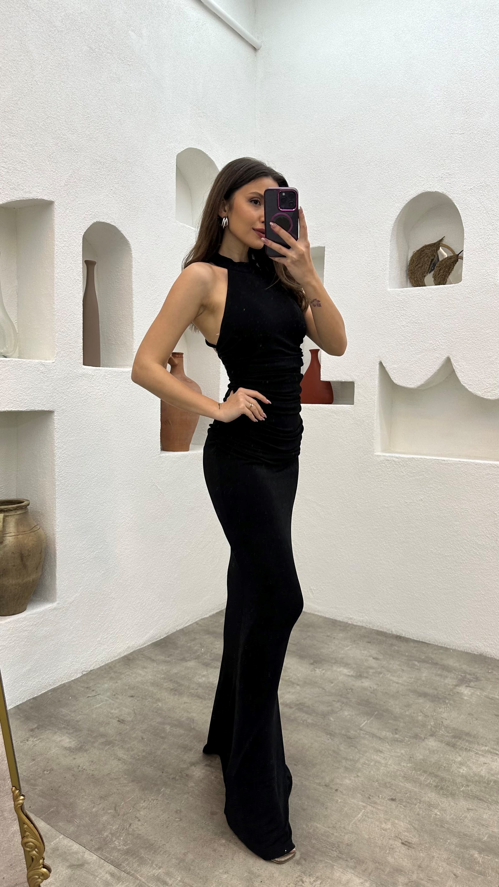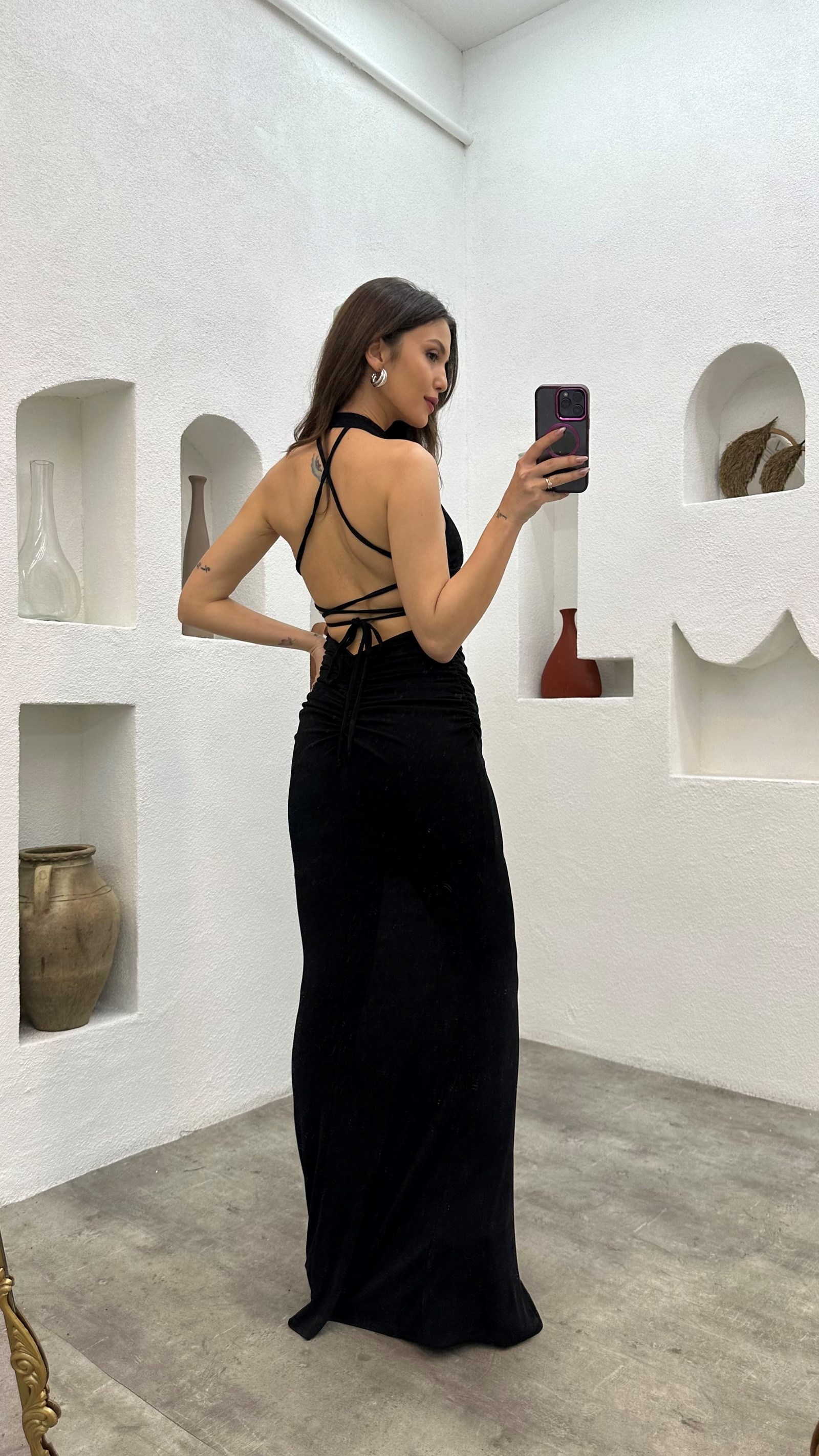 Siyah Boyun Detay Yırtmaçlı Elbise
