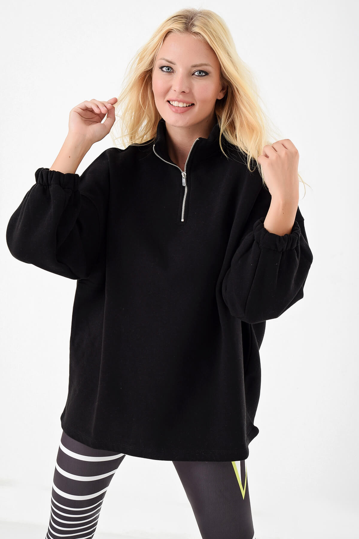 Siyah Dik Yaka Fermuarli Sweatshirt