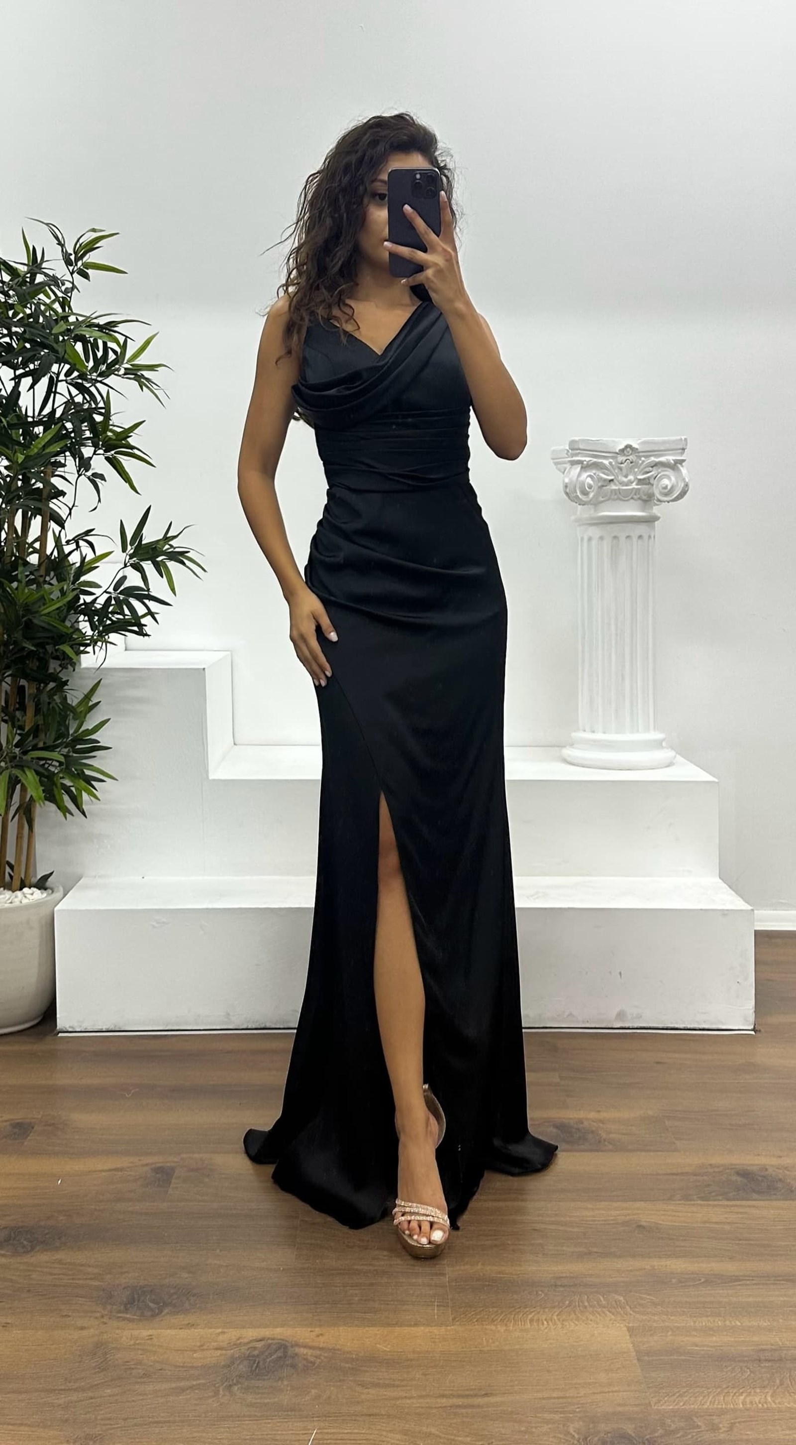 Ürün 36-42 bedene kadar uyumlu, göğüs pedli, astarlı, sırt capraz ip ve fermuar kapamalı, yırtmaçlı, drapeli abiye olarak tasarlanmıştır.