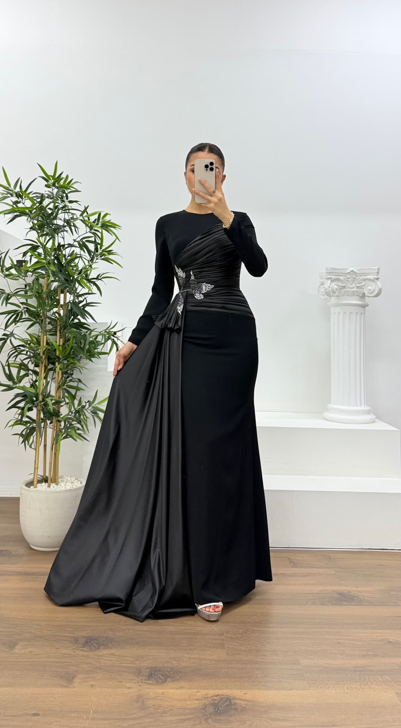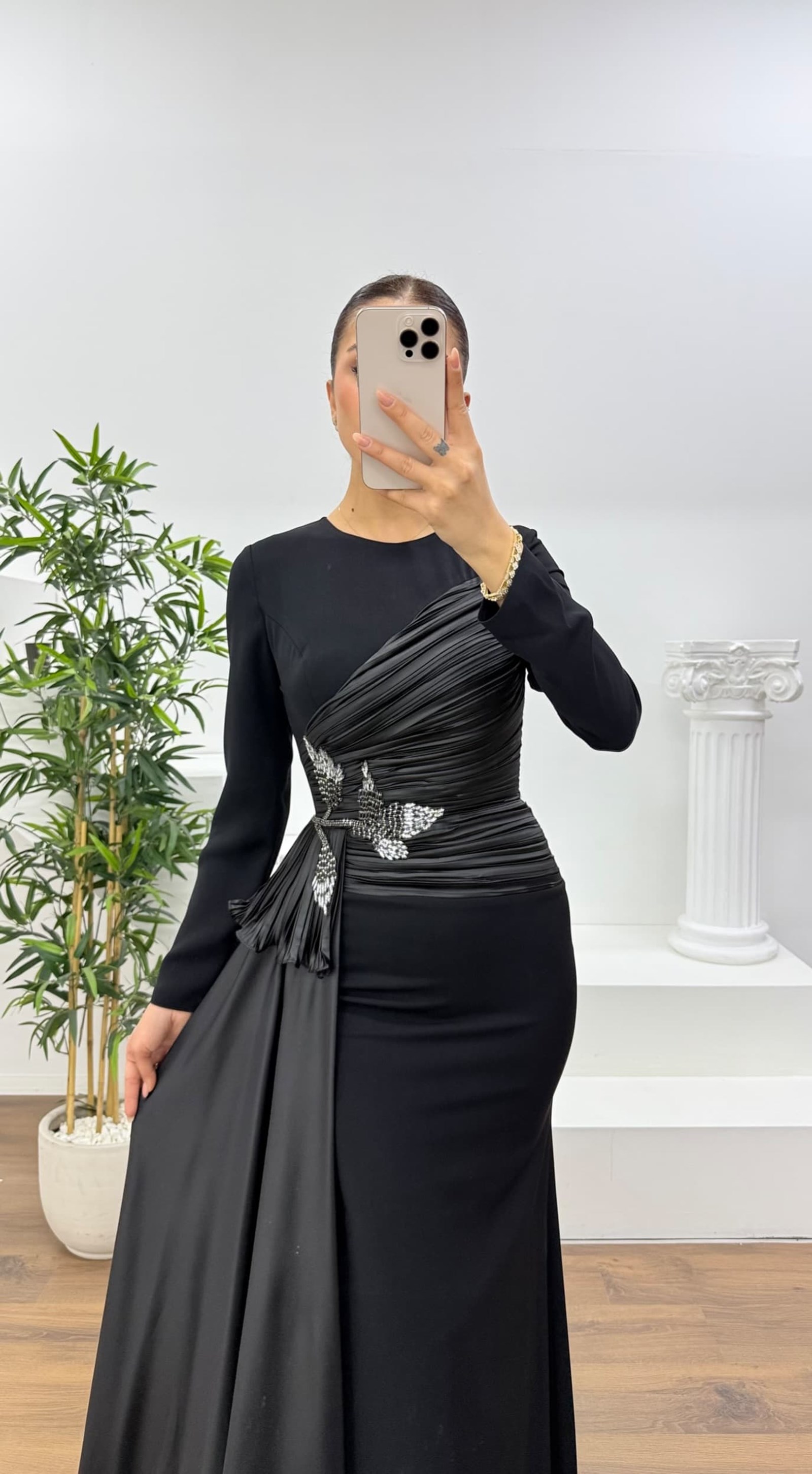 Drapeli ve yaprak motifli tesettür abiye elbise