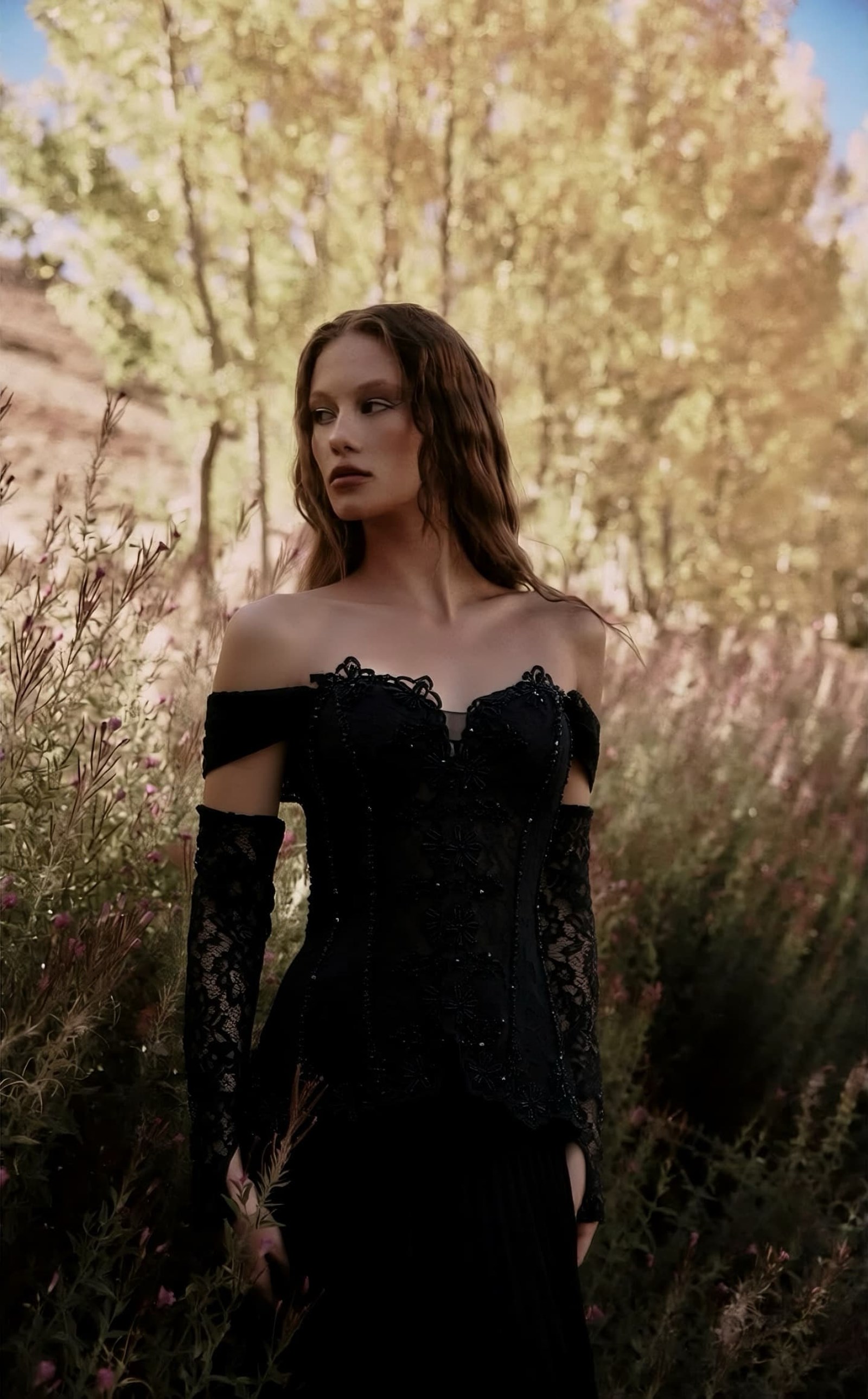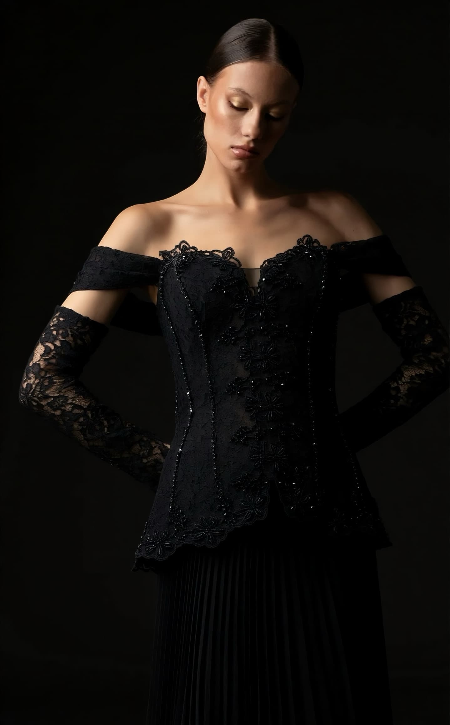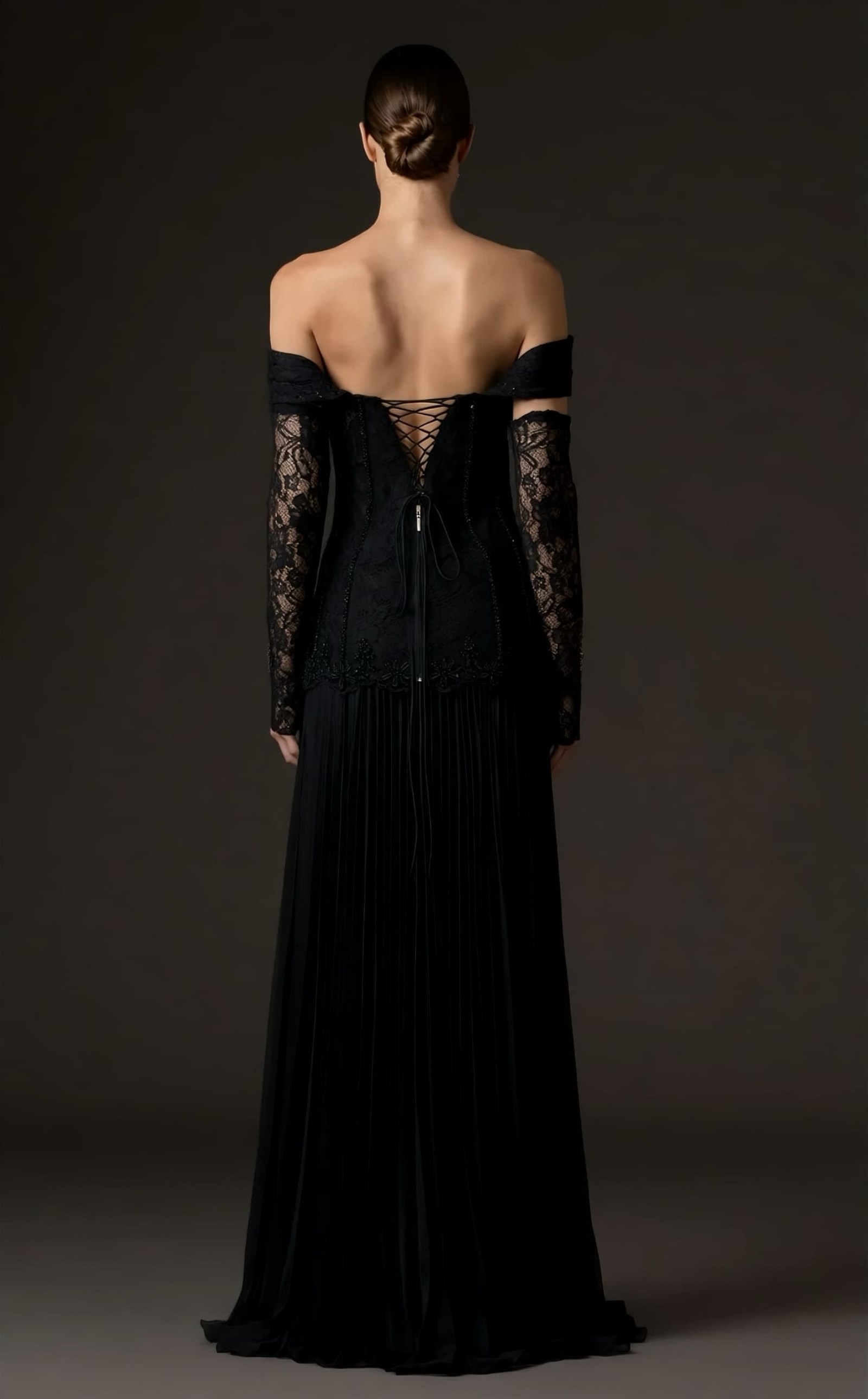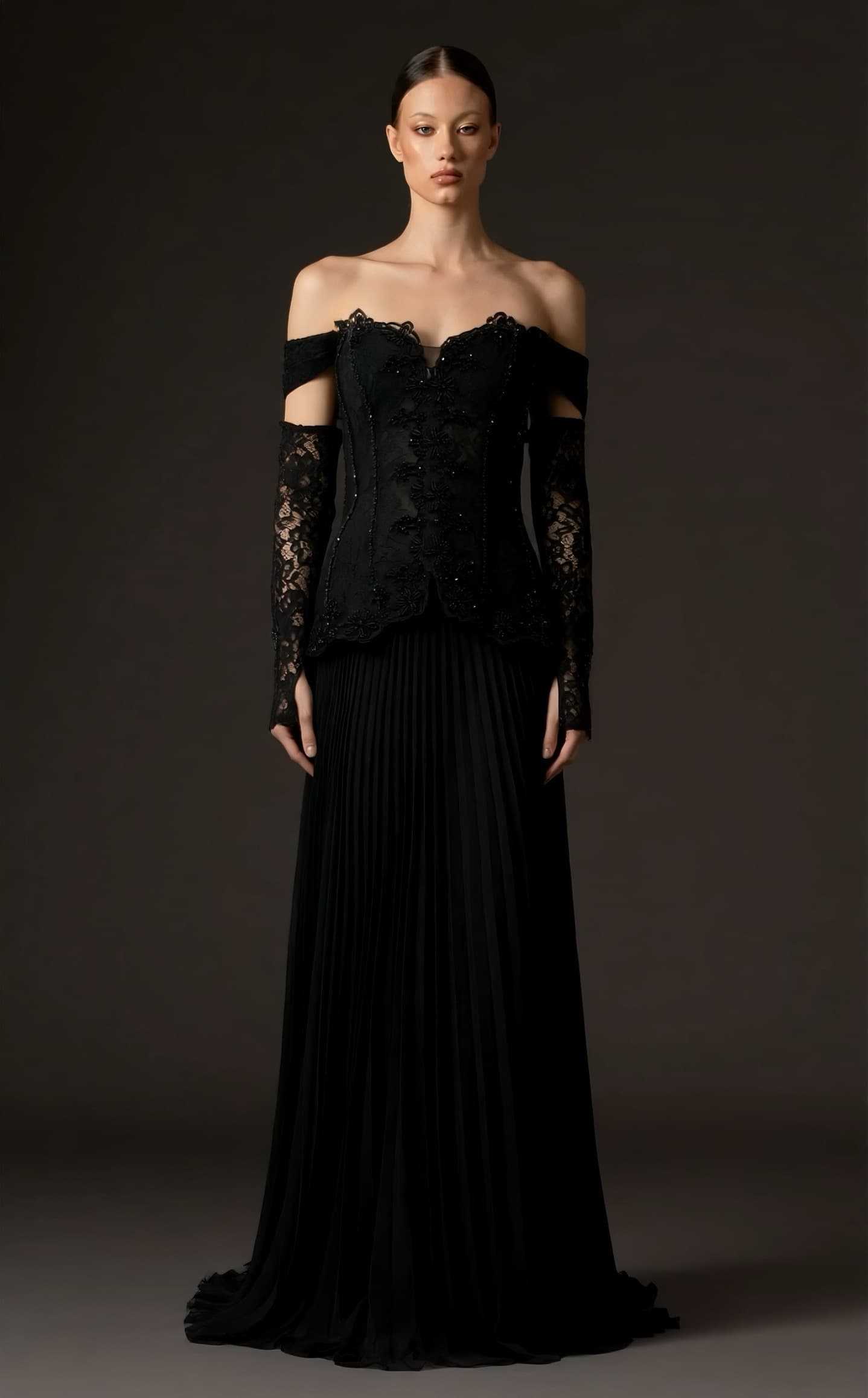 • Siyah Düşük Omuzlu Pileli Abiye Elbise