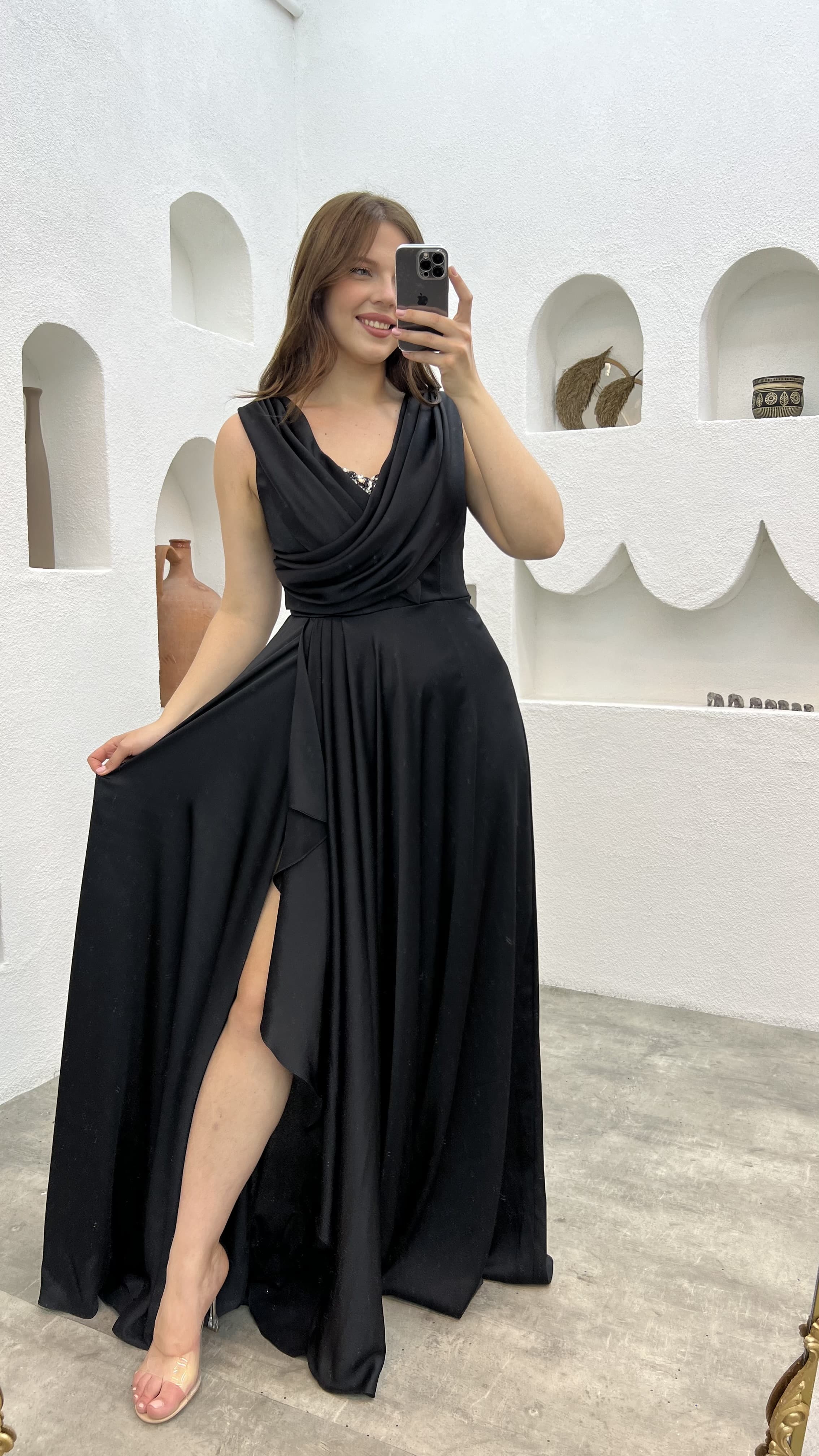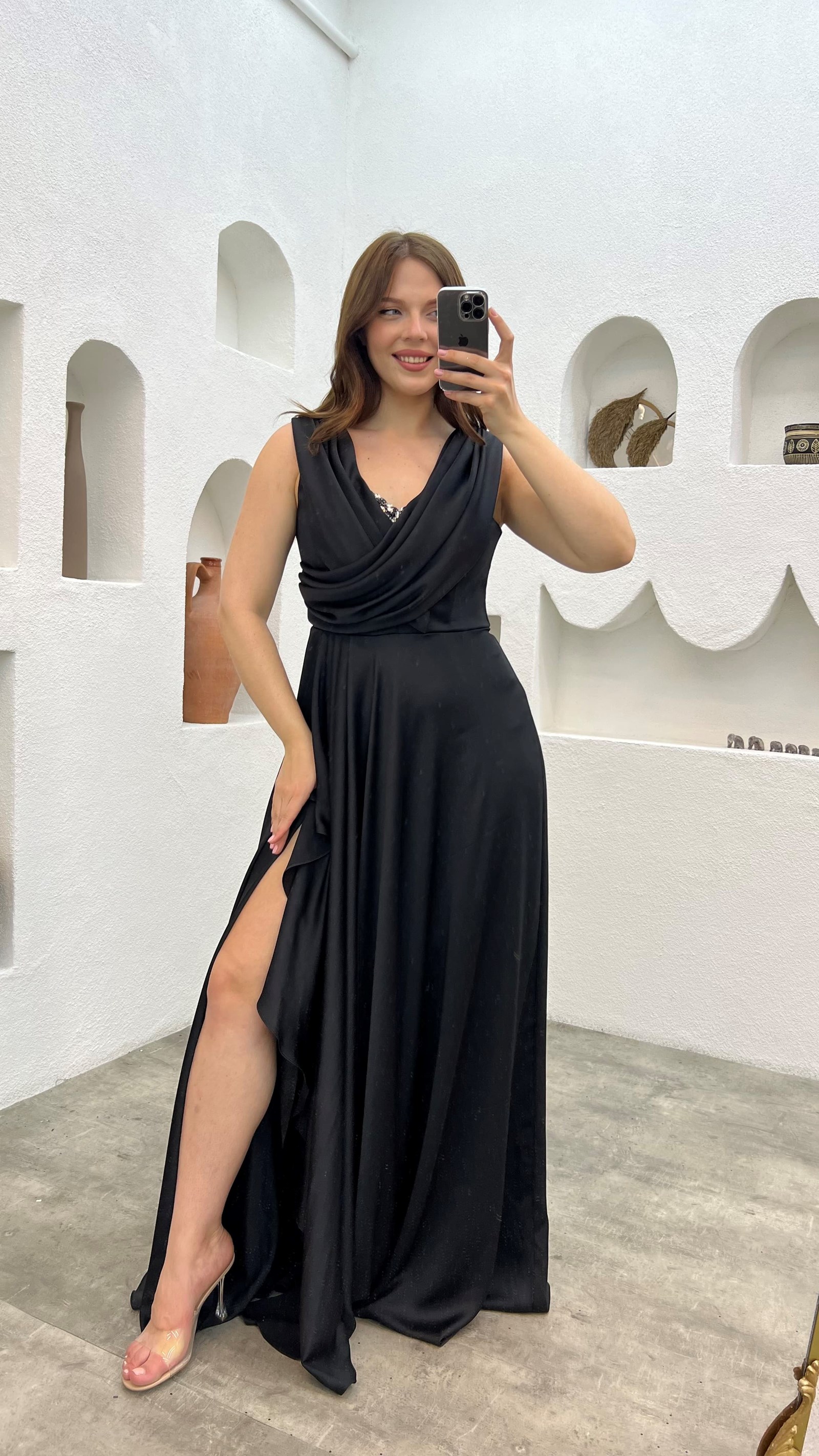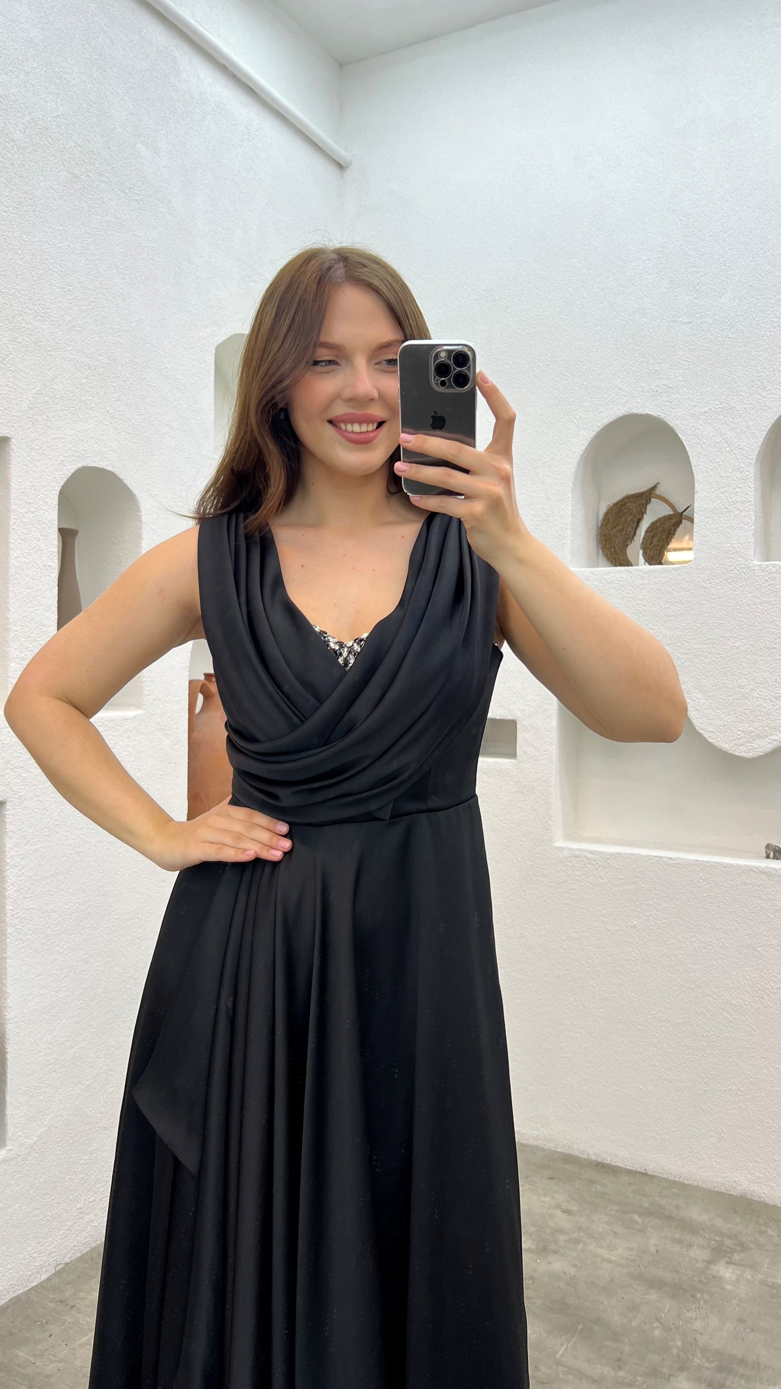 Siyah Gögsü İşlemeli Volanlı Saten Büyük Beden Abiye Elbise
