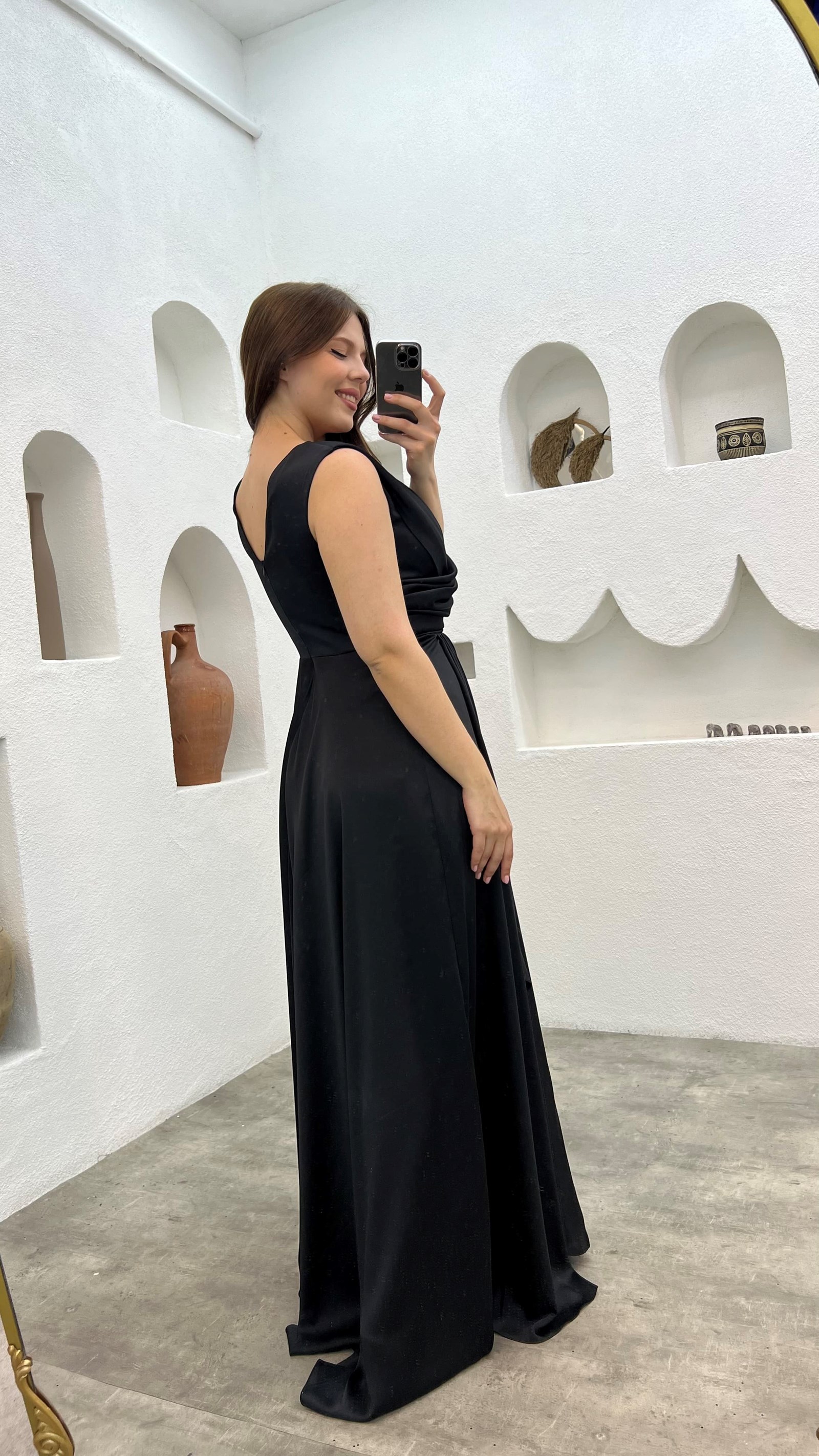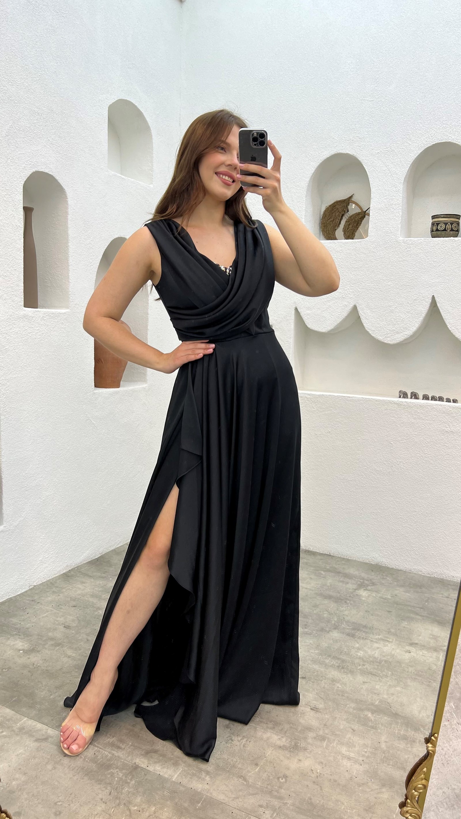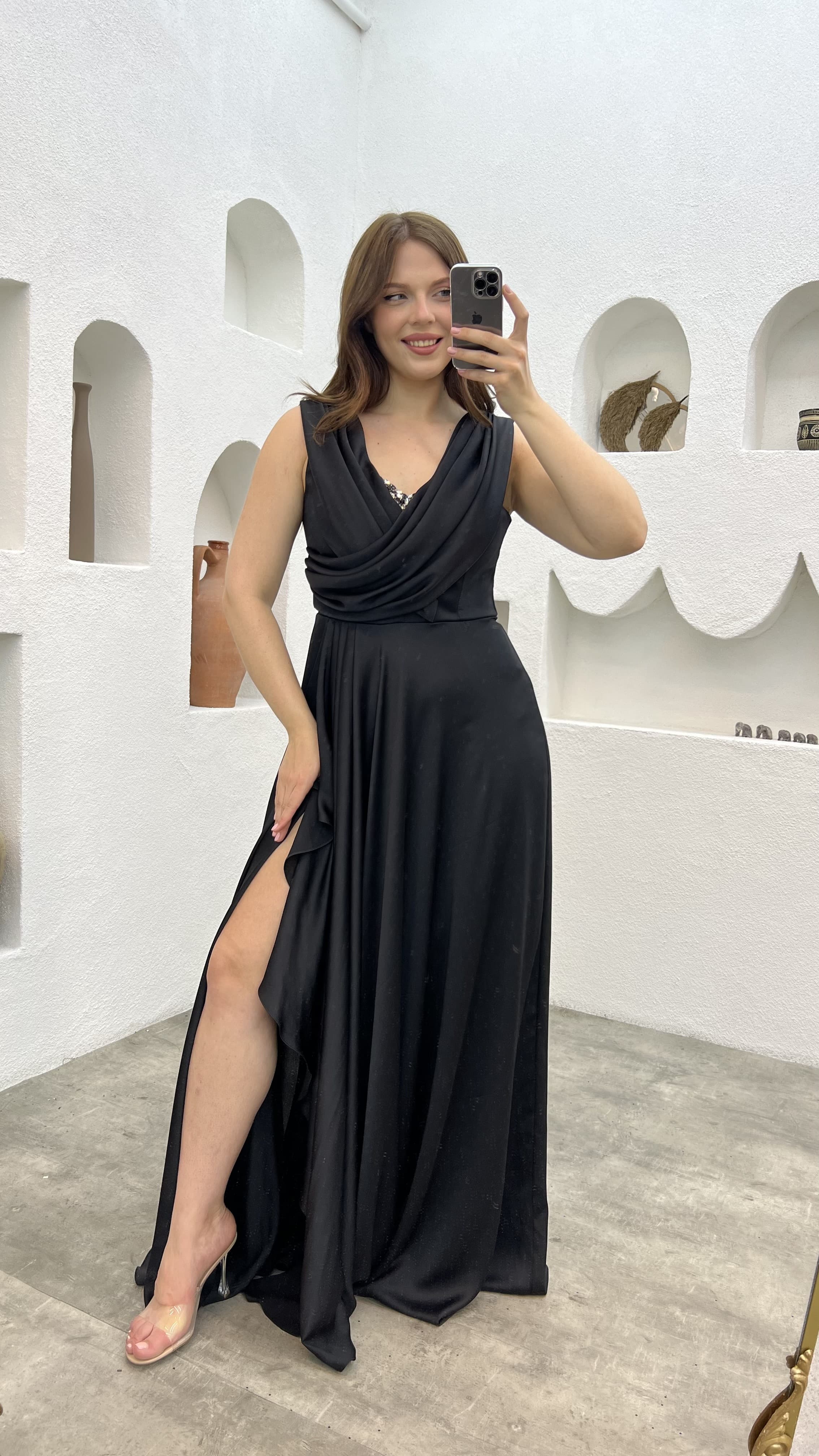 Siyah Gögsü İşlemeli Volanlı Saten Büyük Beden Abiye Elbise