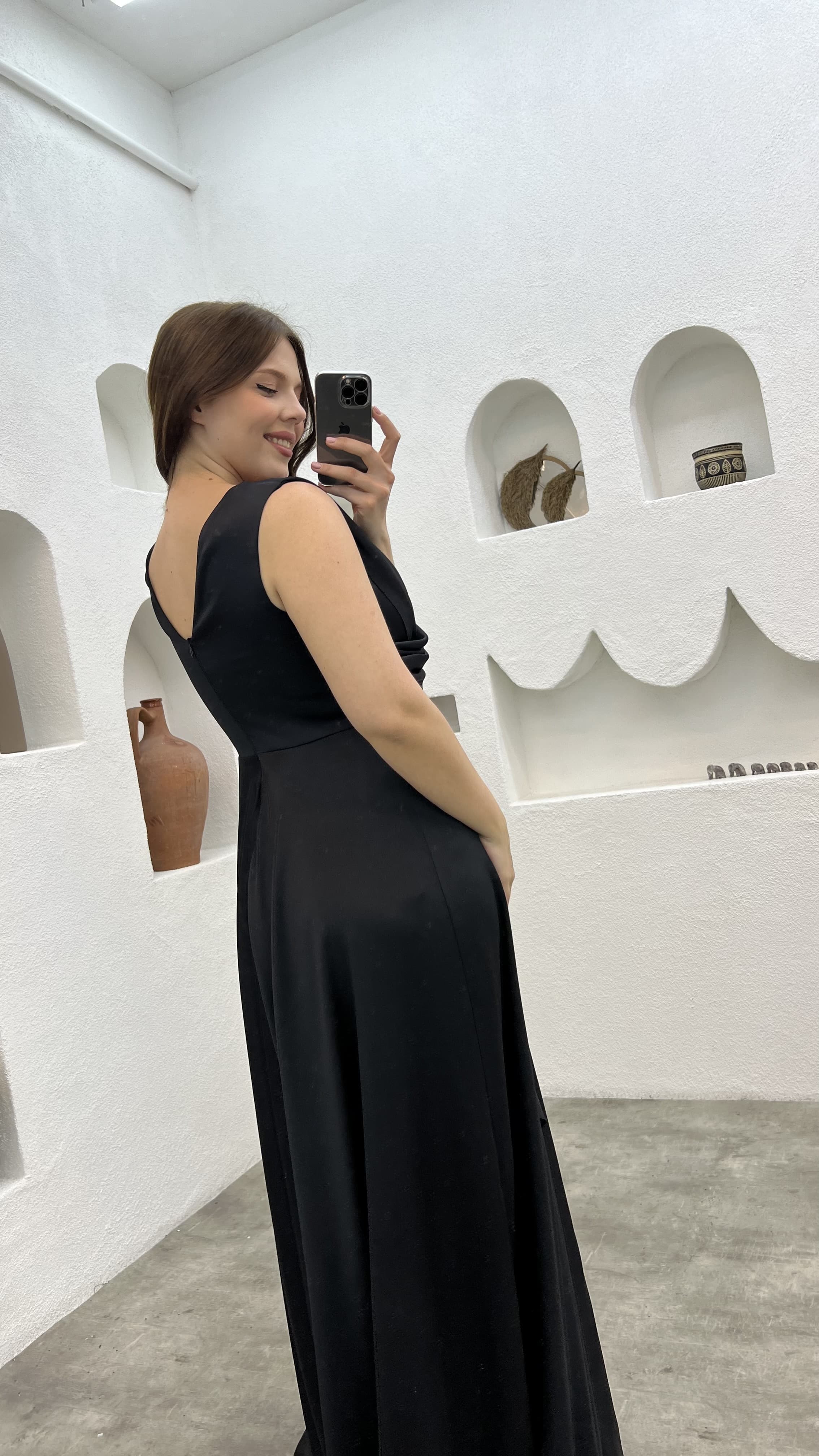 • Siyah Gögsü İşlemeli Volanlı Saten Büyük Beden Abiye Elbise