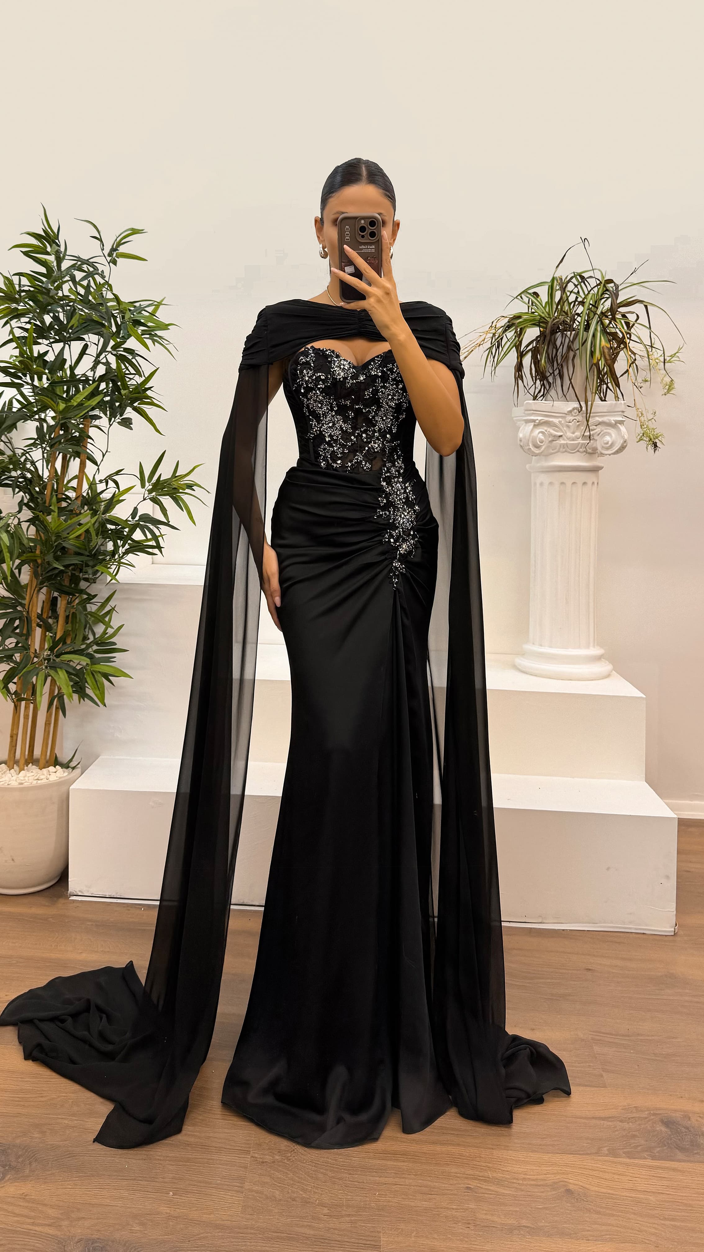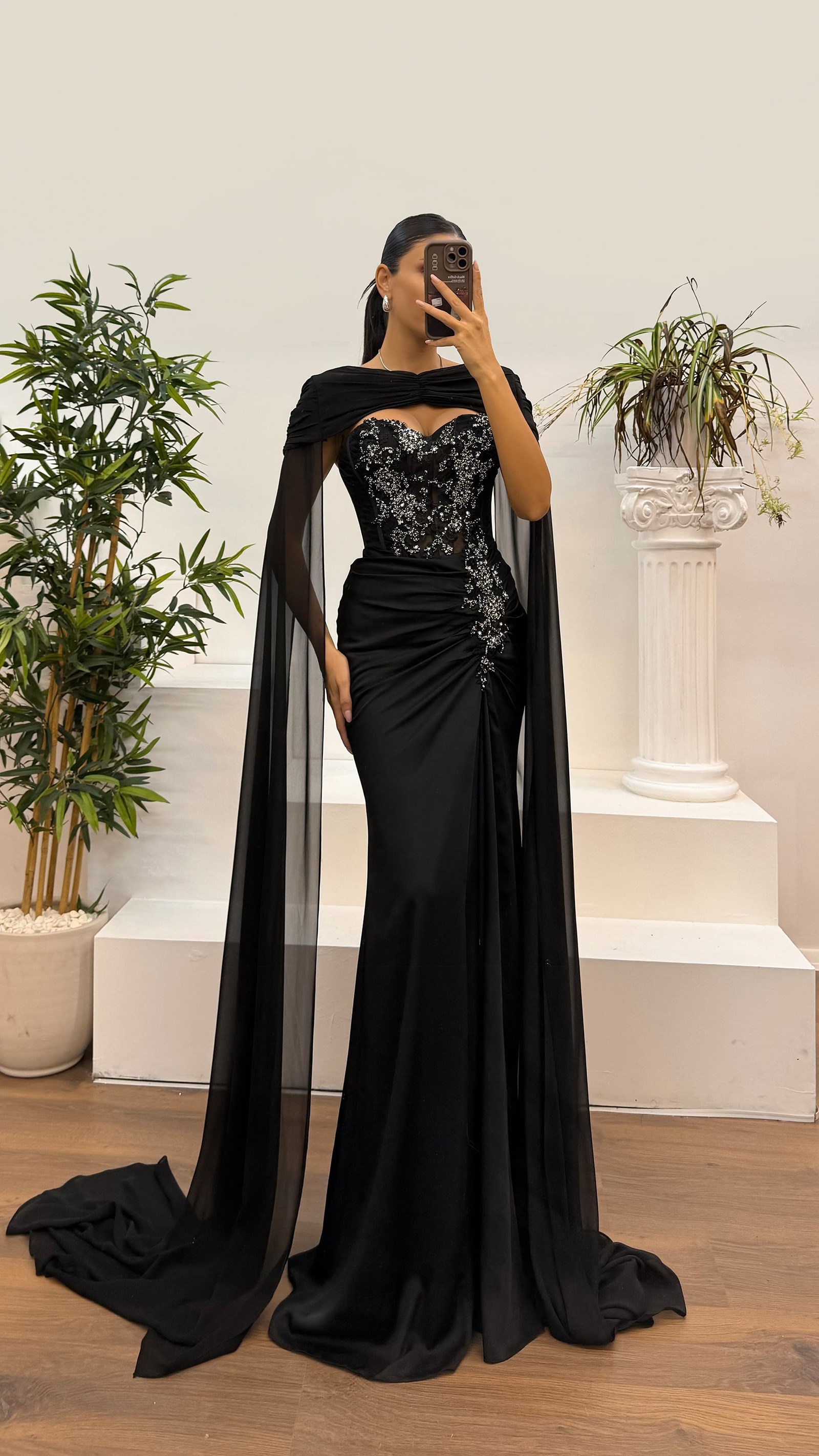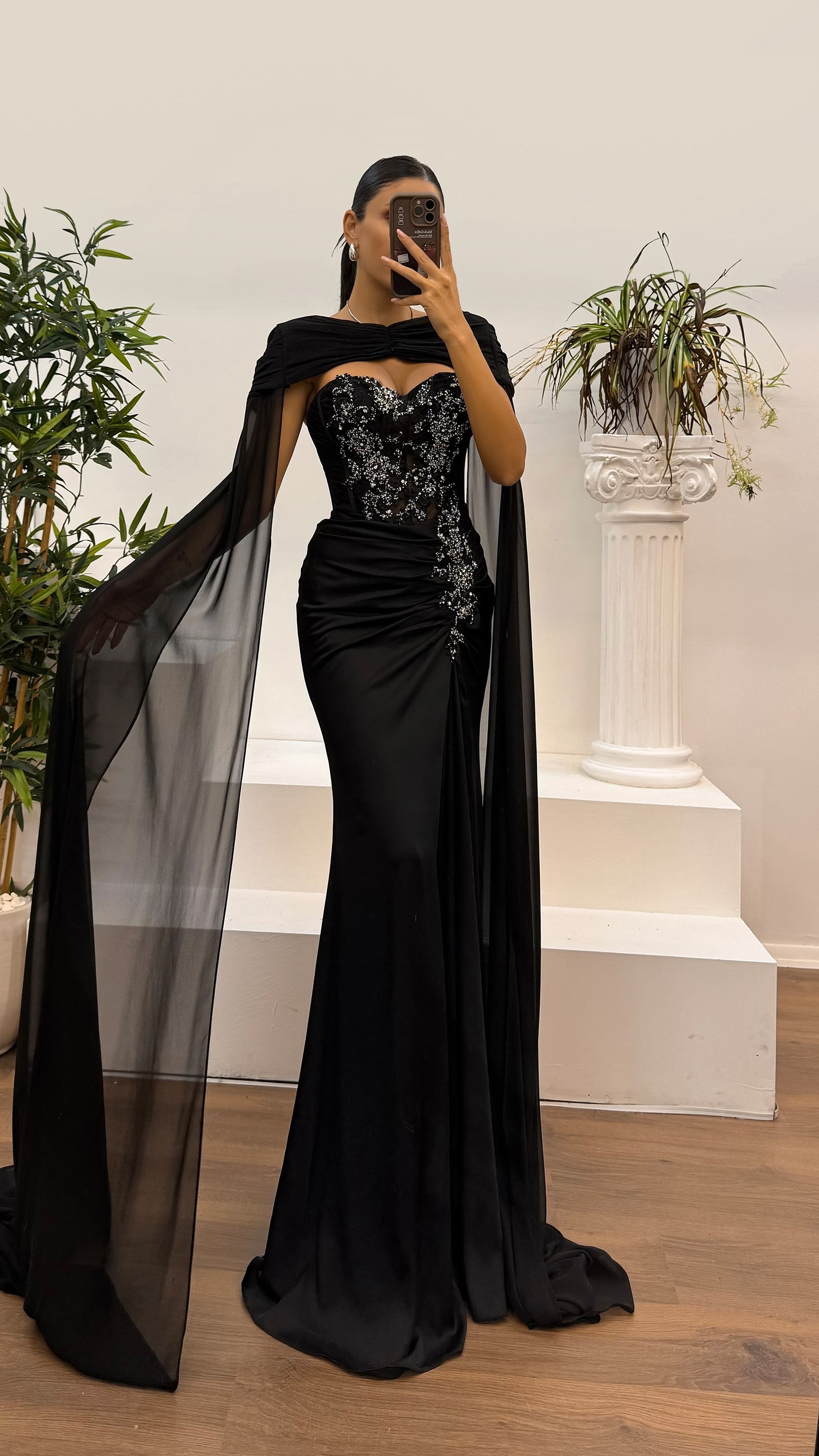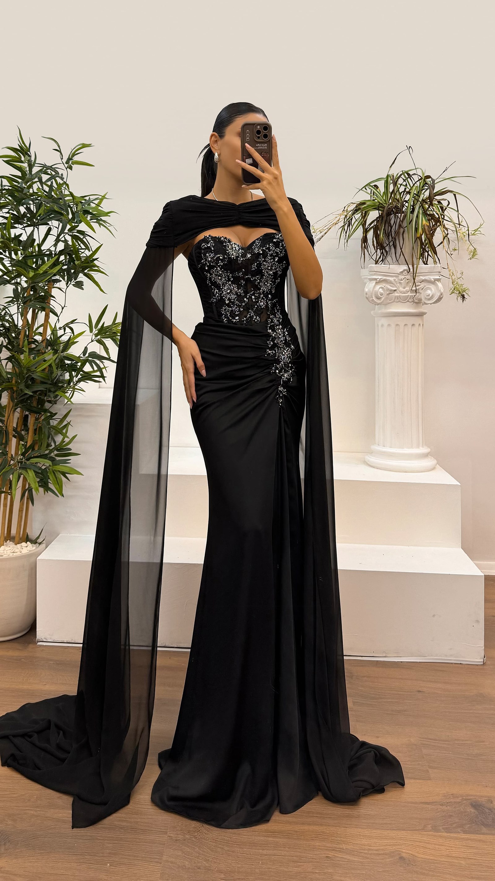 • Siyah Göğüs Taş Detay Tasarım Abiye Elbise