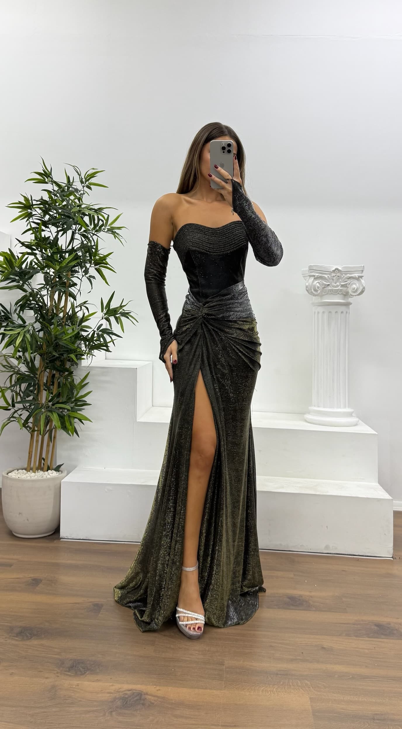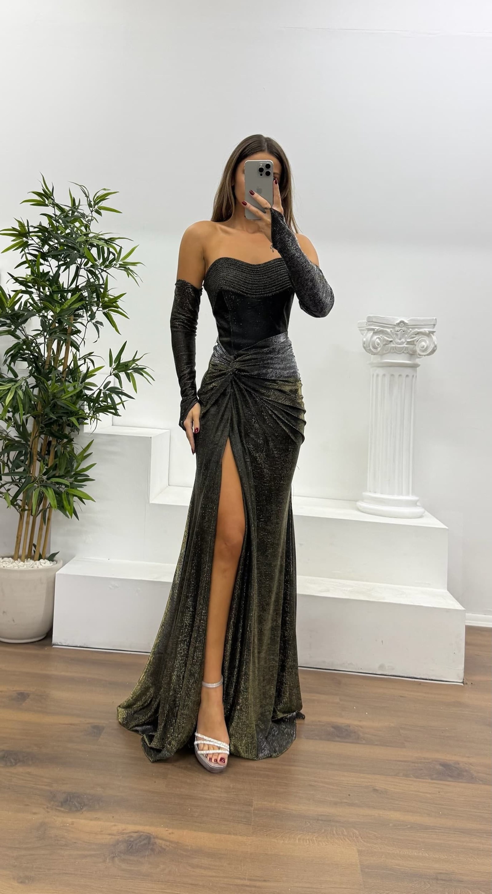 Siyah-Gold Straplez Eldivenli Abiye Elbise