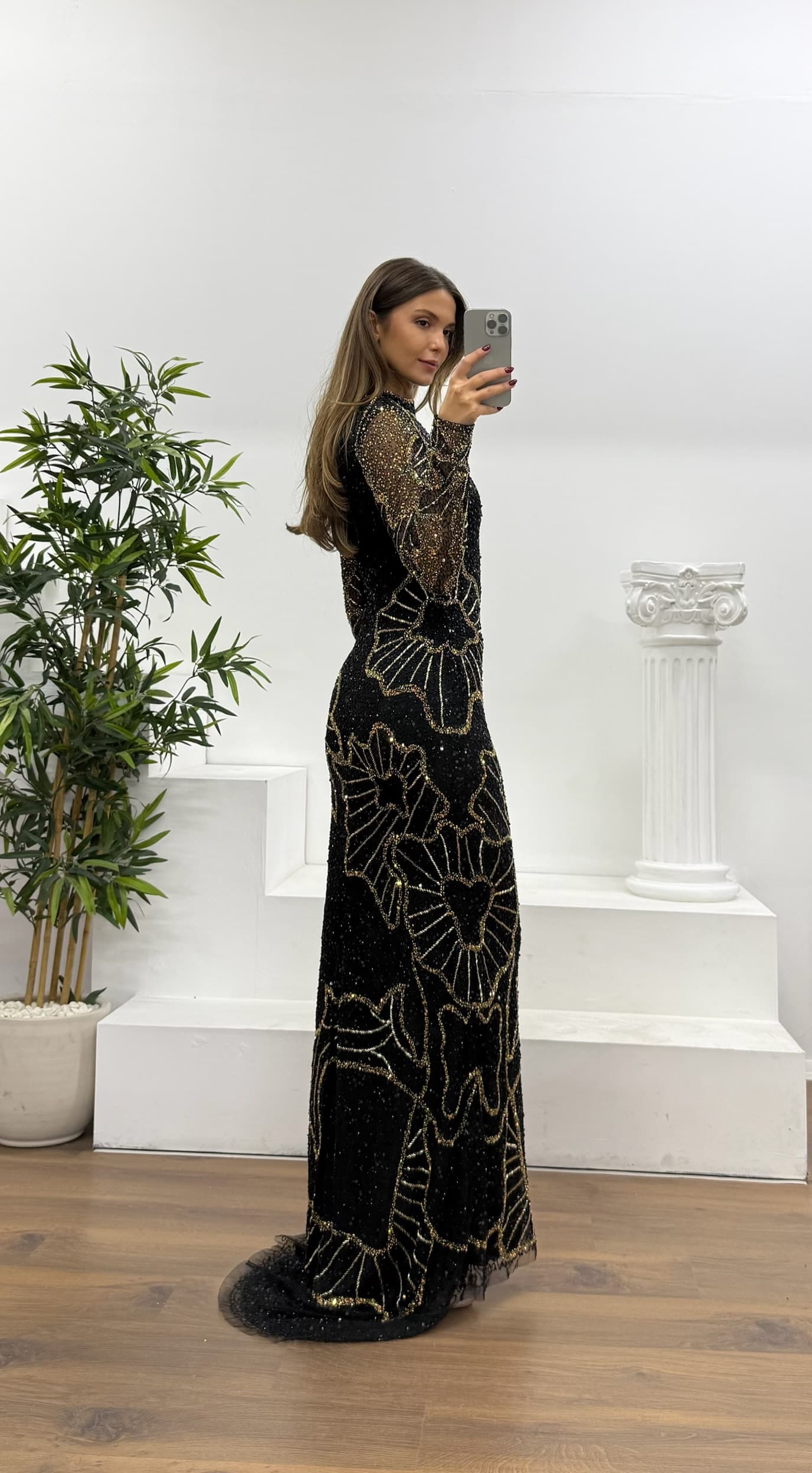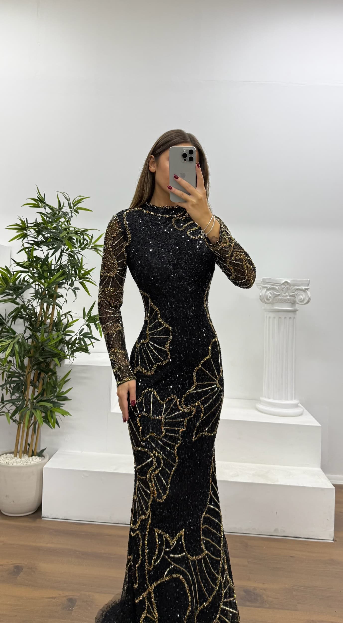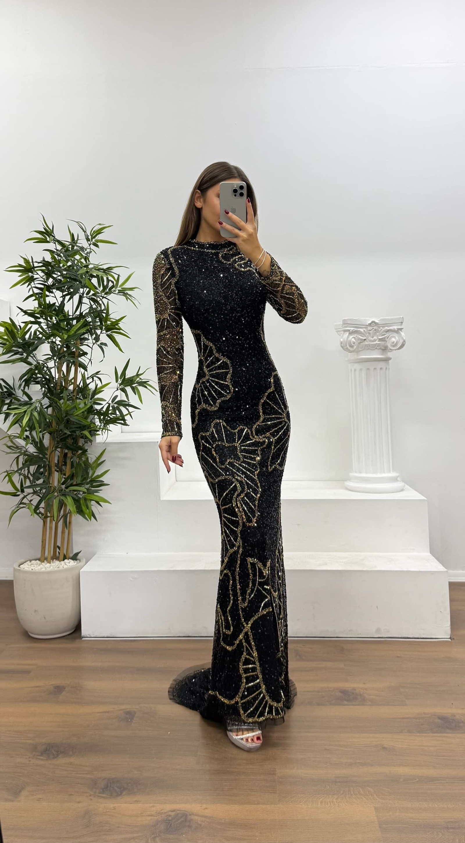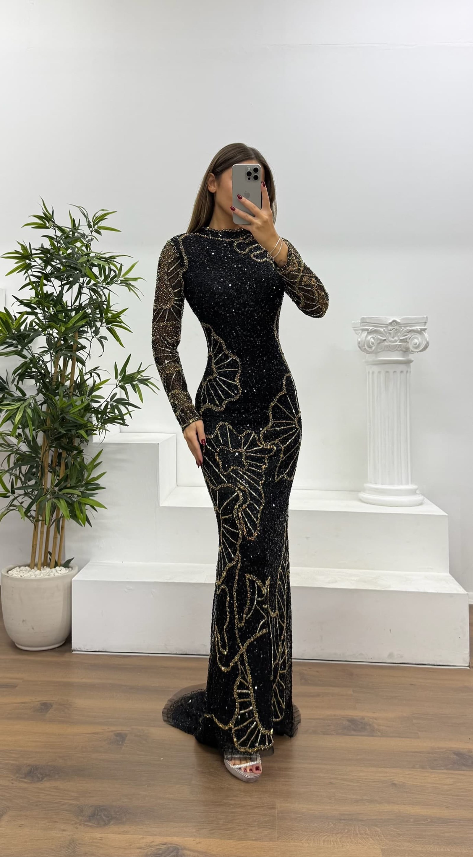 Siyah-Gold Uzun Kollu Özel El İşlemesi Abiye Elbise