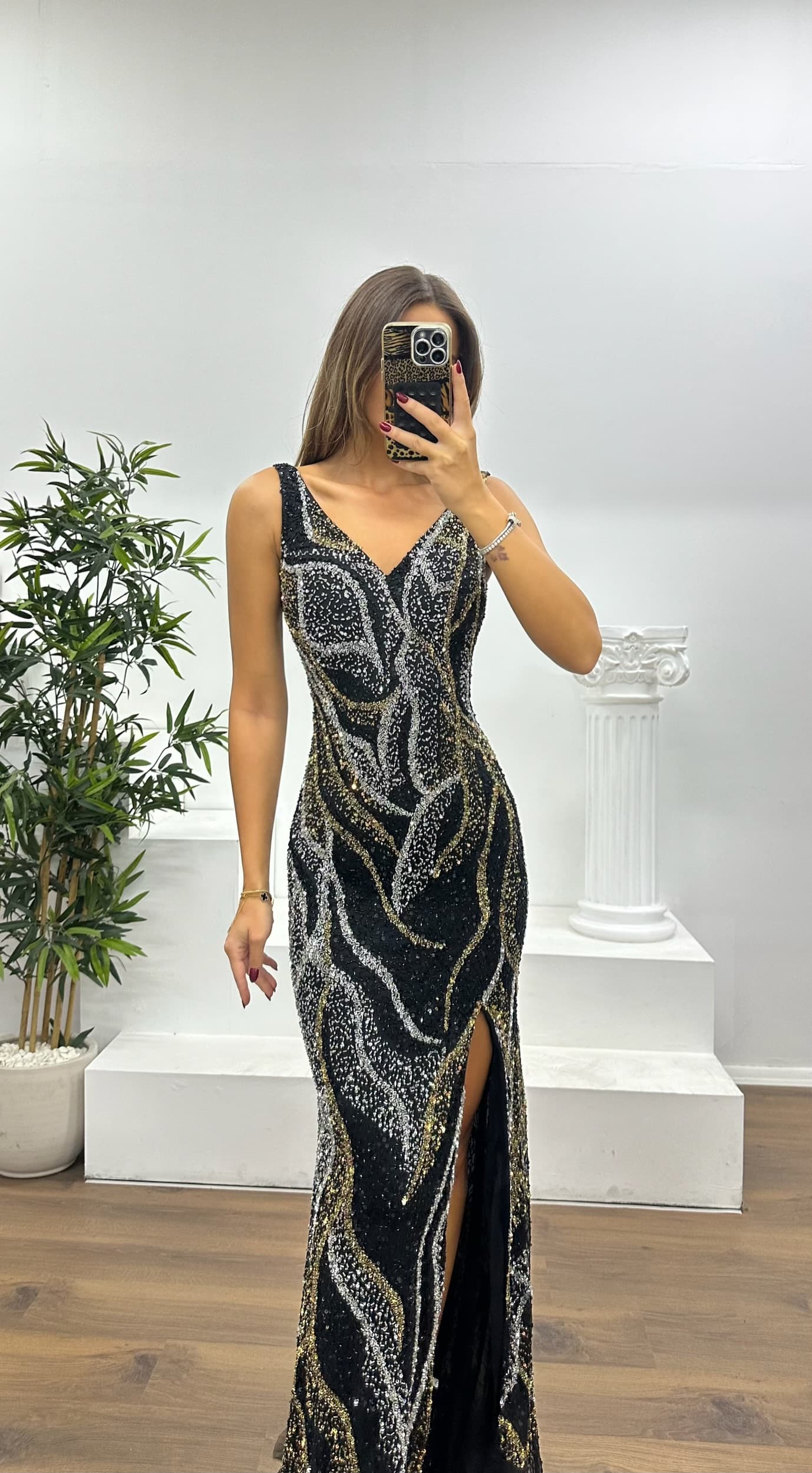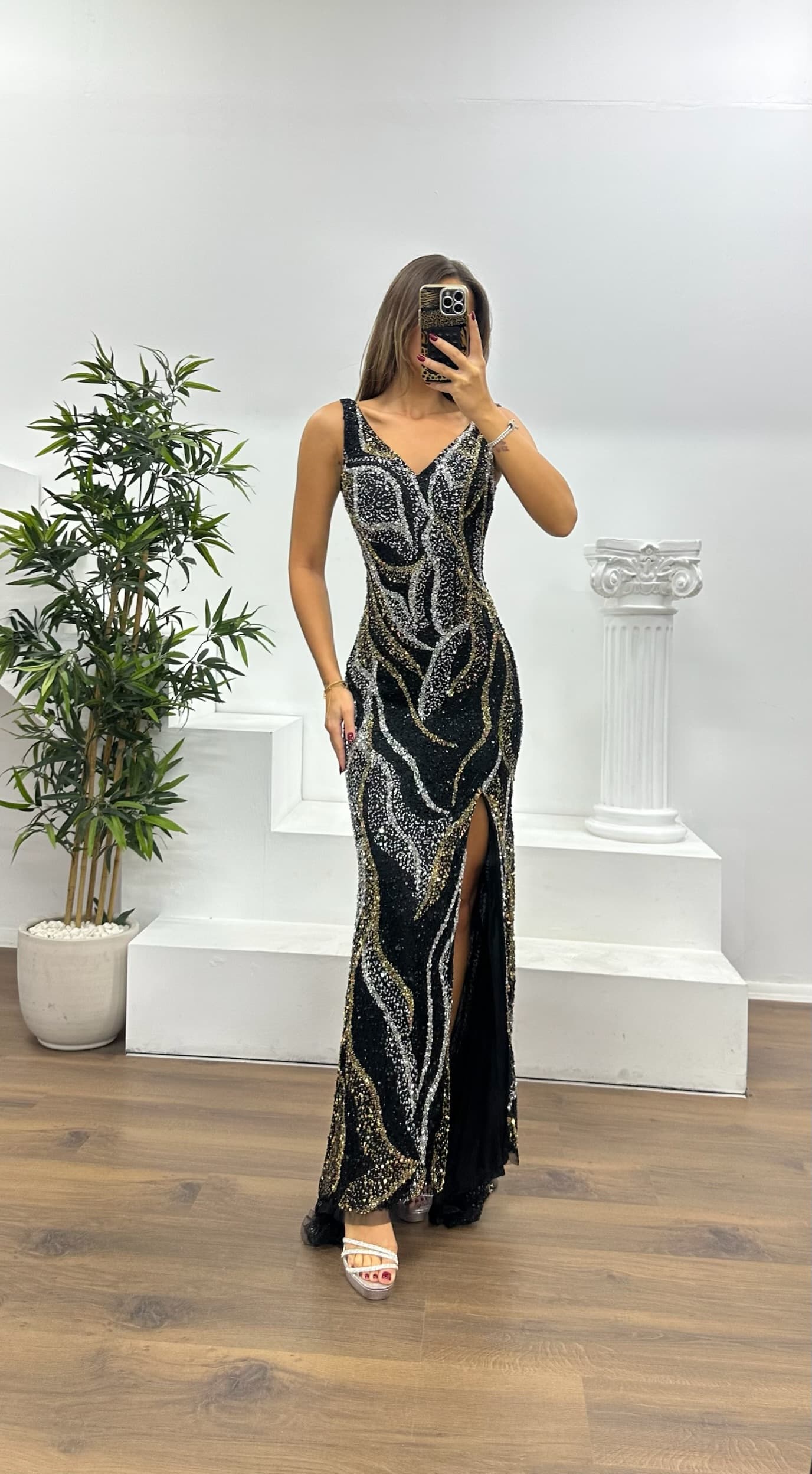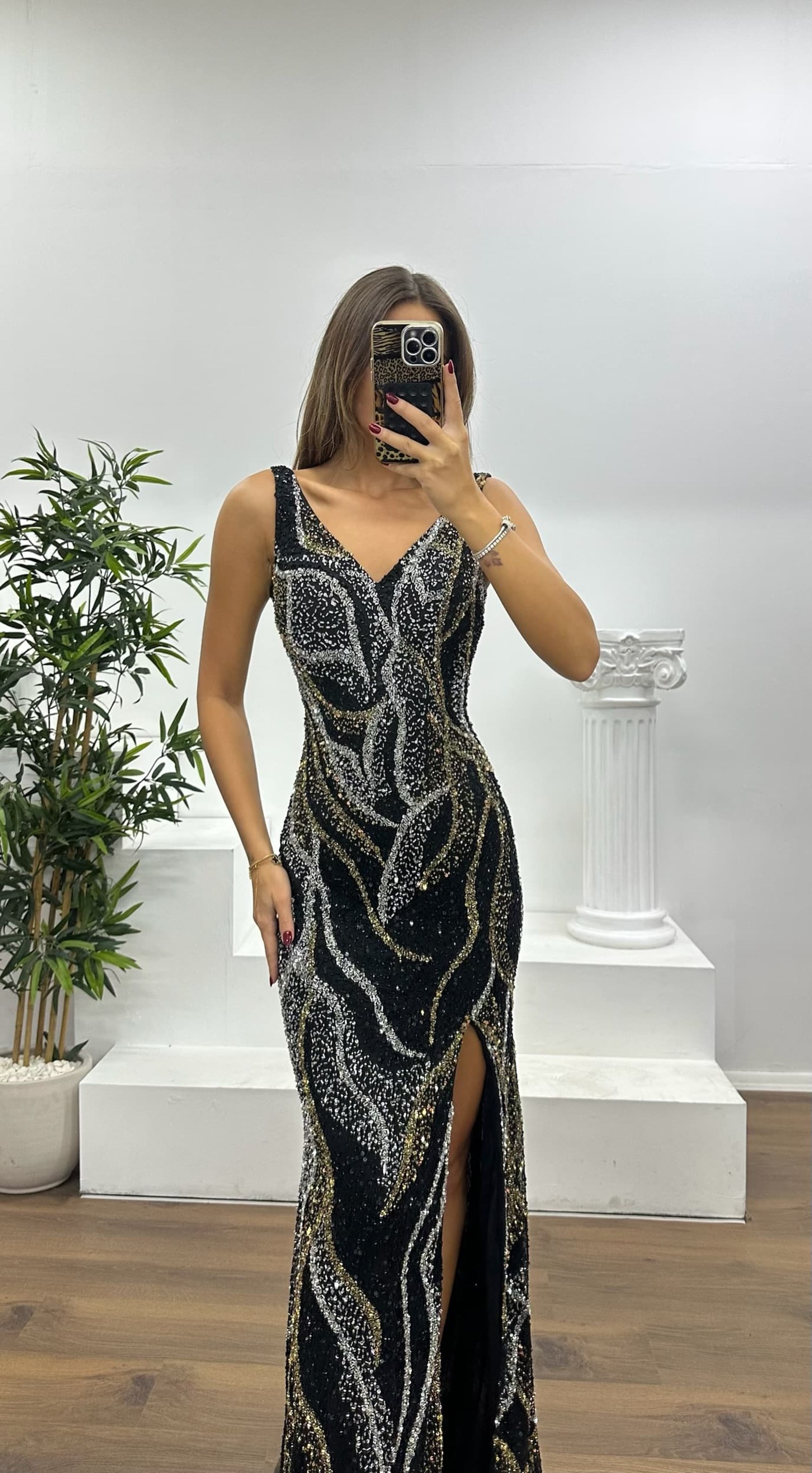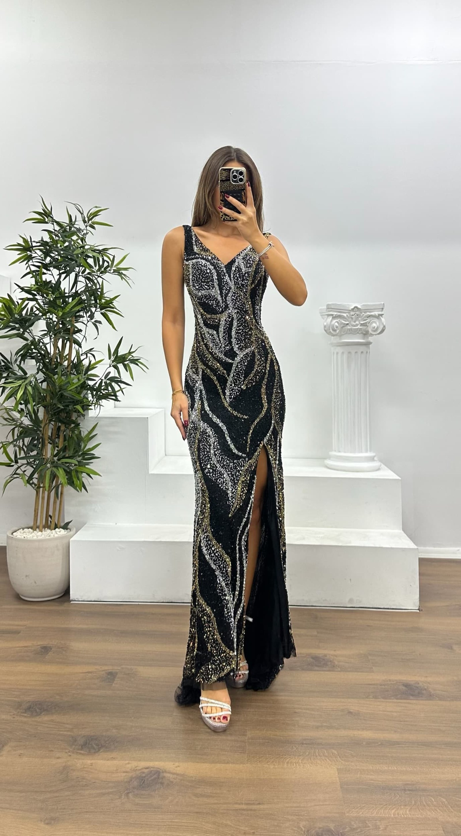 Ürün 36-46 bedene kadar uyumlu, göğüs pedli, astarlı, arka kapama fermuar, yırtmaçlı, işlemeli abiye olarak tasarlanmıştır.