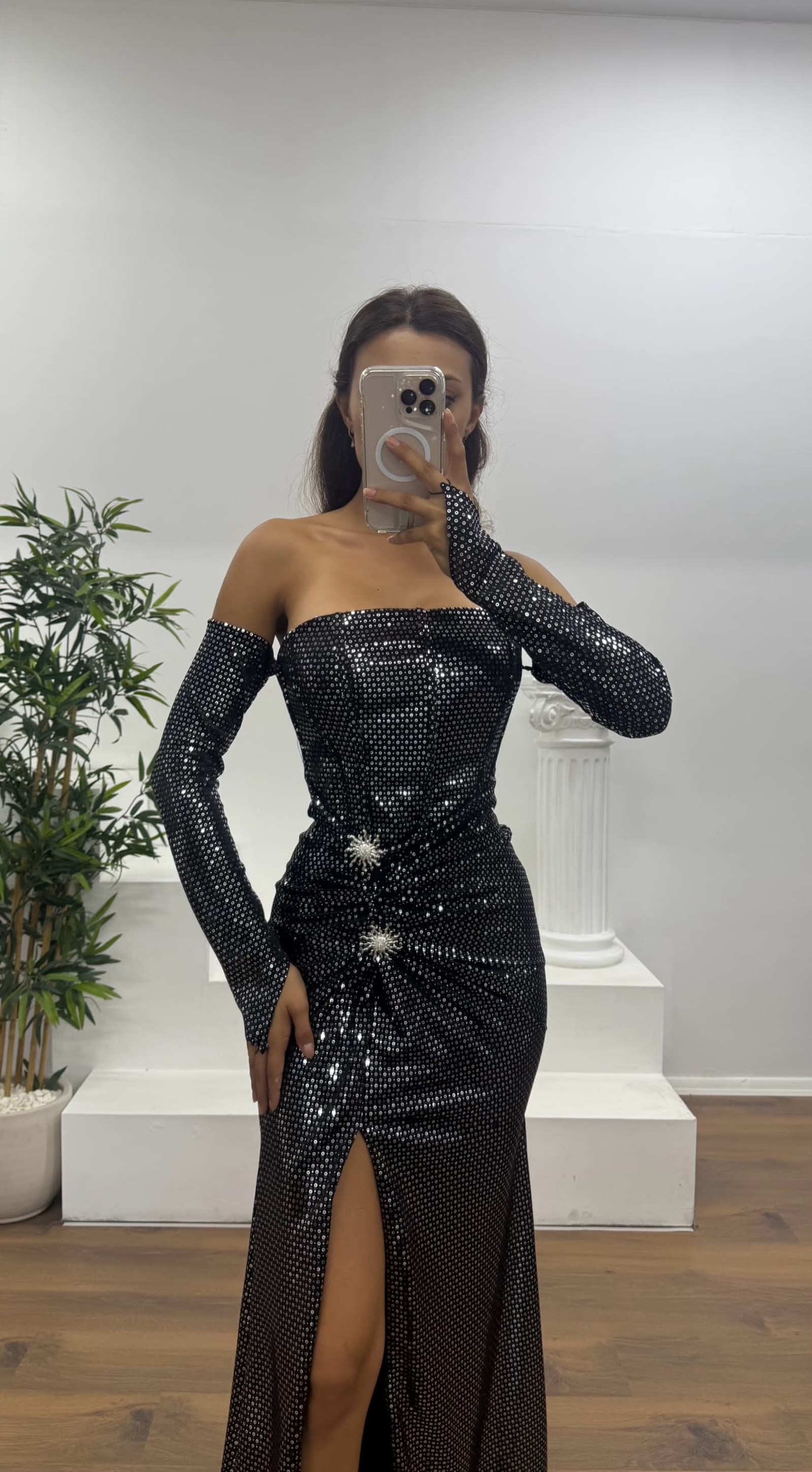 Ürün 36-42 bedene kadar uyumlu, göğüs pedli, astarlı, arka kapama fermuar, yırtmaçlı, eldivenli, broş detay abiye olarak tasarlanmıştır.