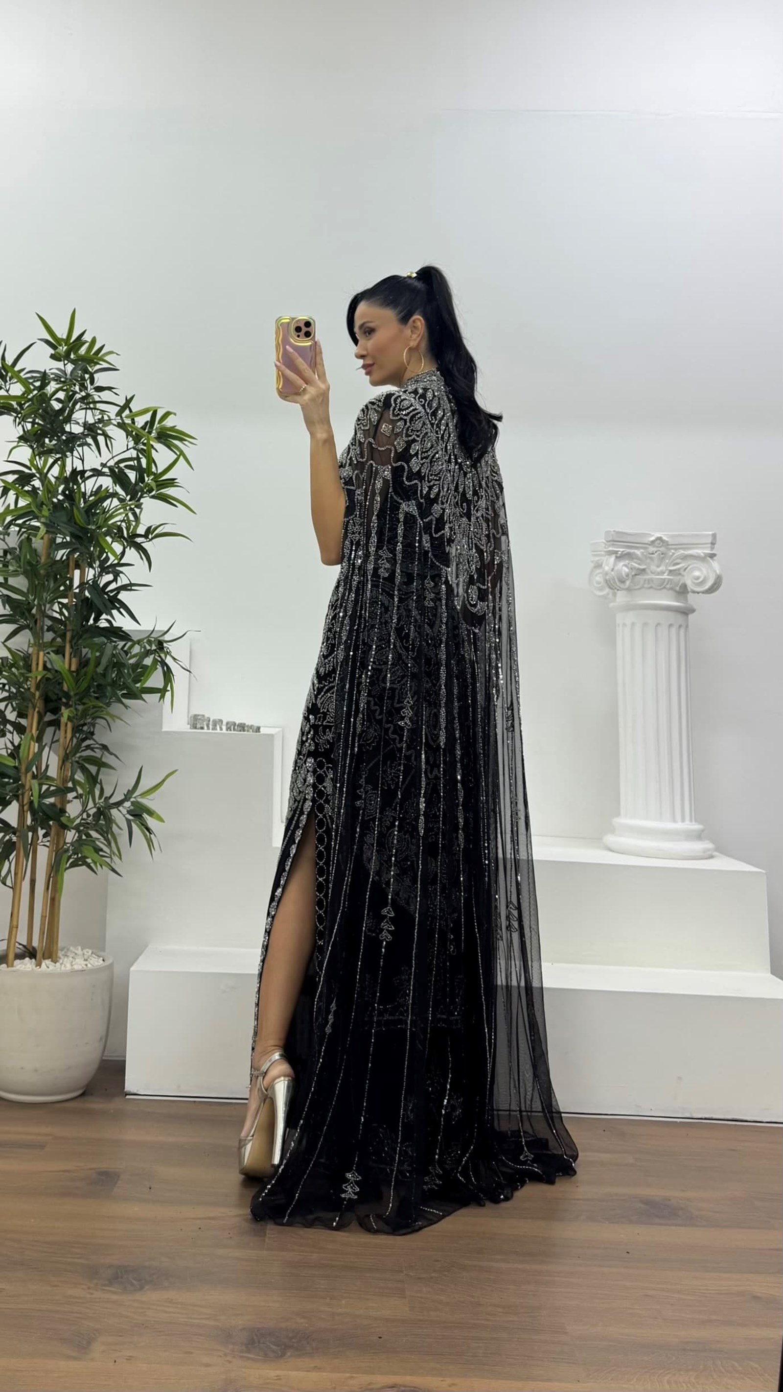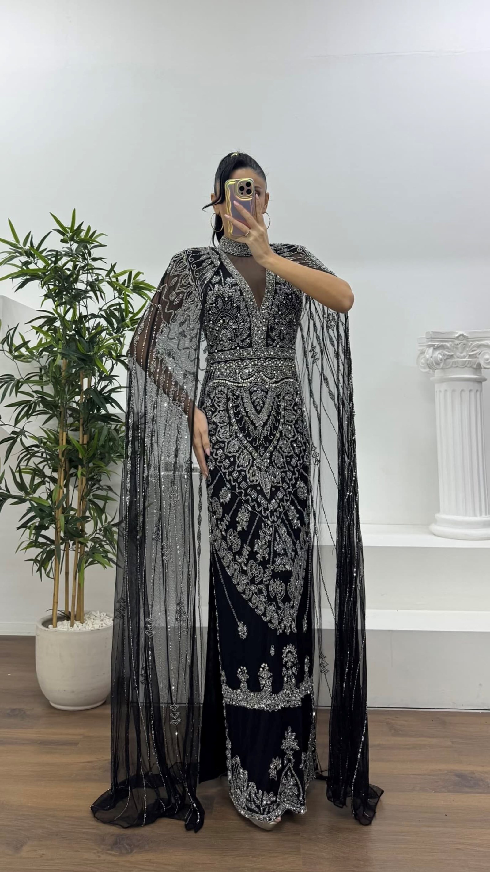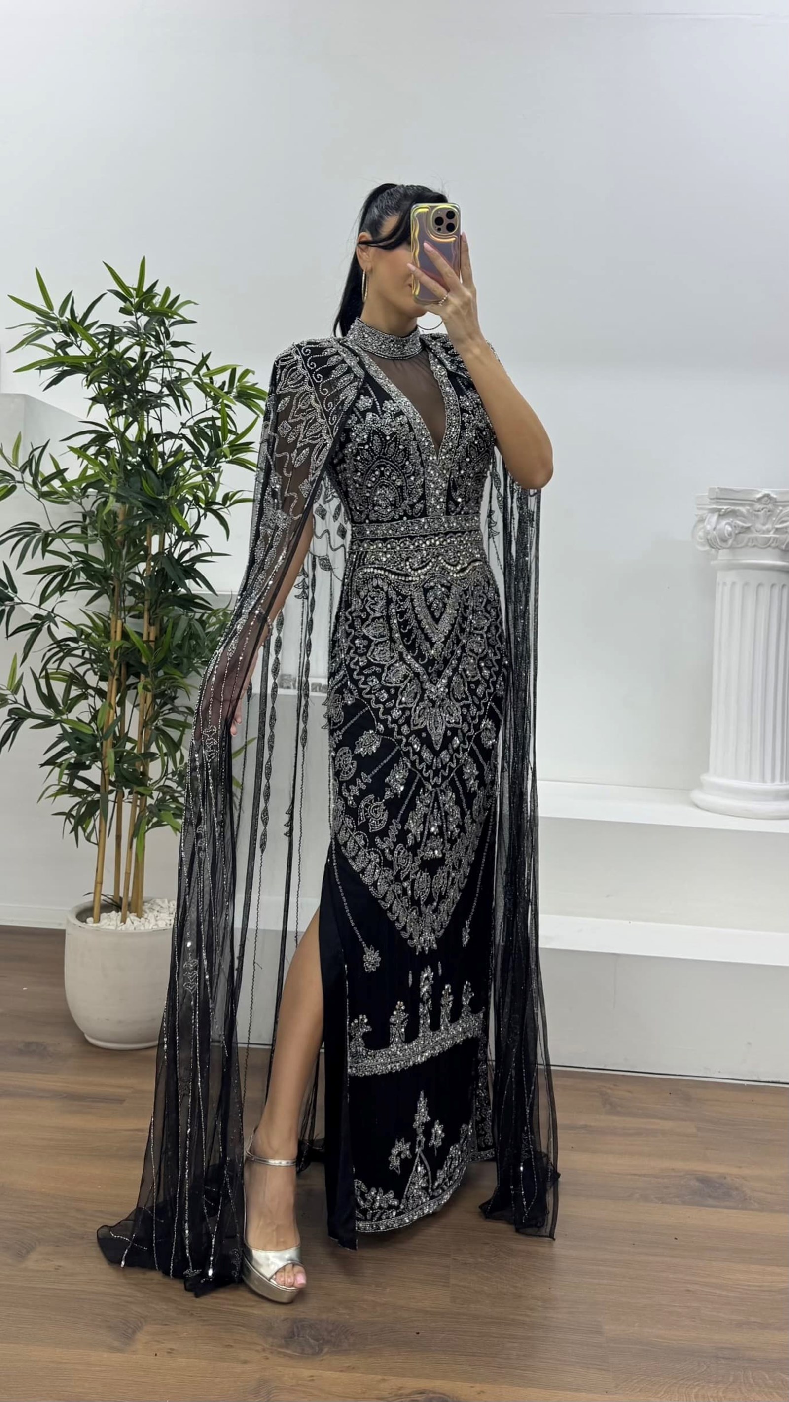 Ürün 36-40 bedene kadar uyumludur. göğüs pedli, astarlı, fermuarlı, yırtmaçlı, pelerinli, işlemeli abiye olarak tasarlanmıştır.