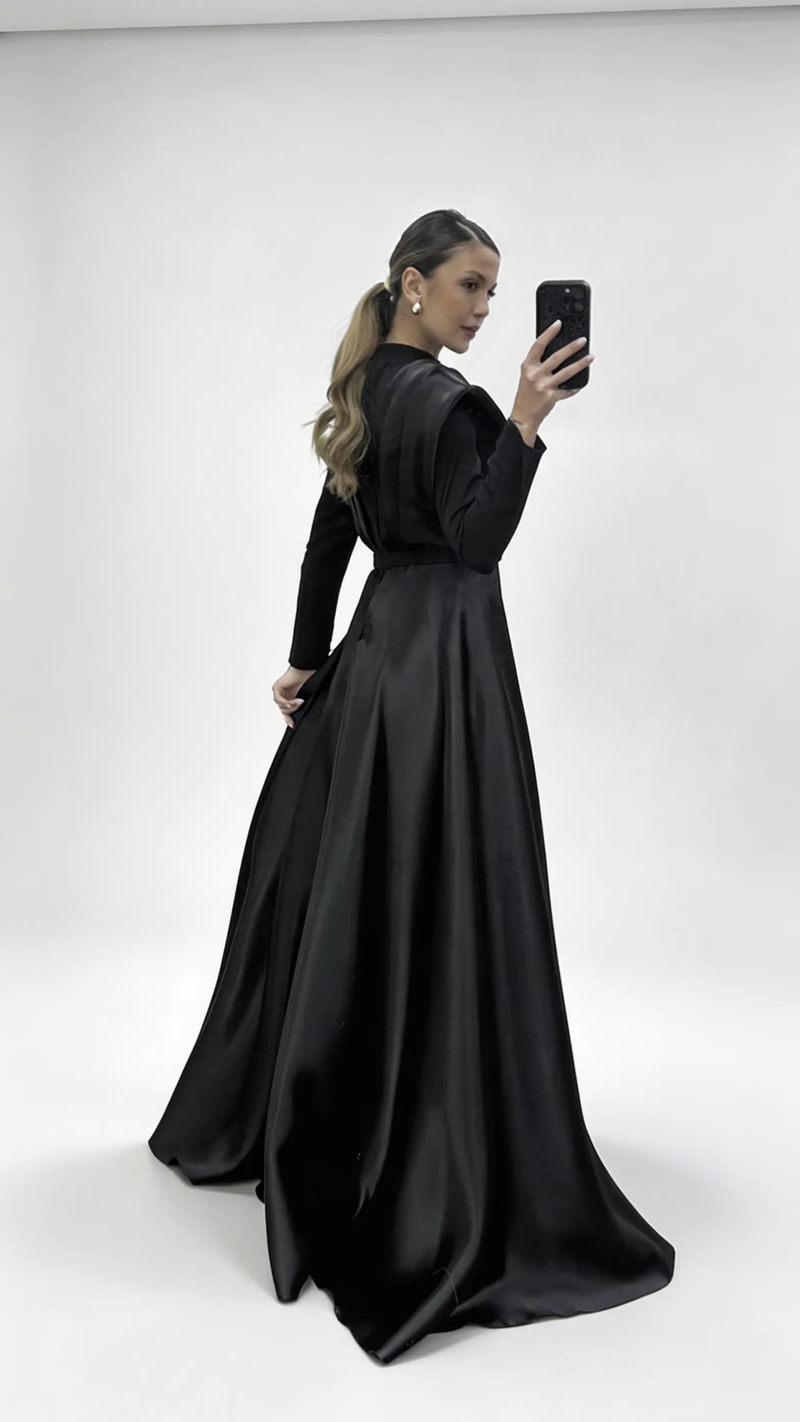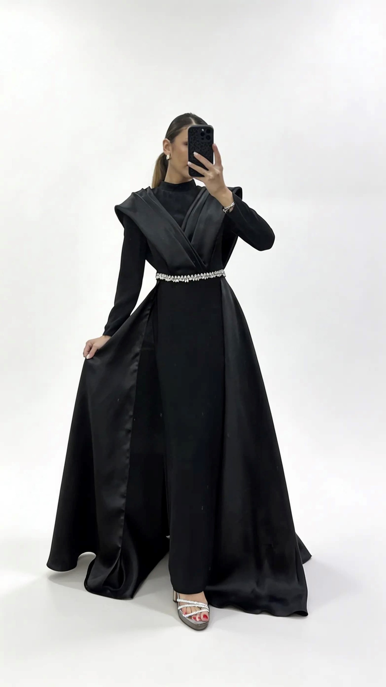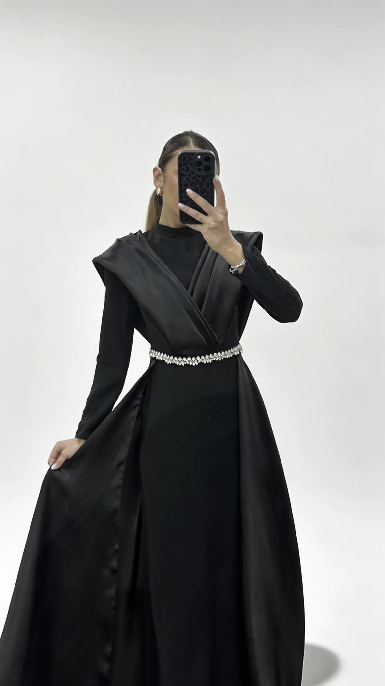 • Siyah Hakim Yaka Omuz Drape Detaylı Tesettür Abiye Elbise