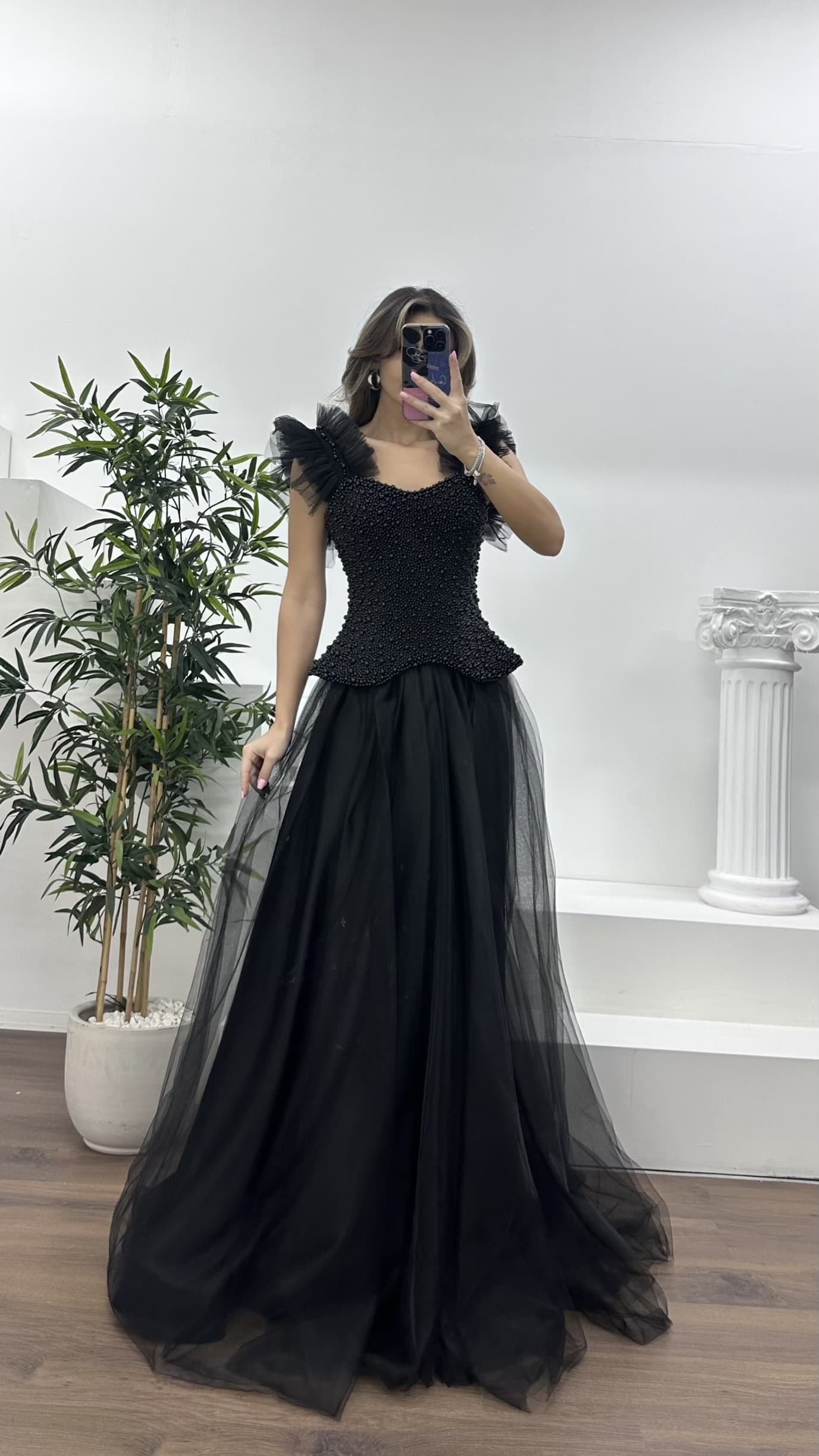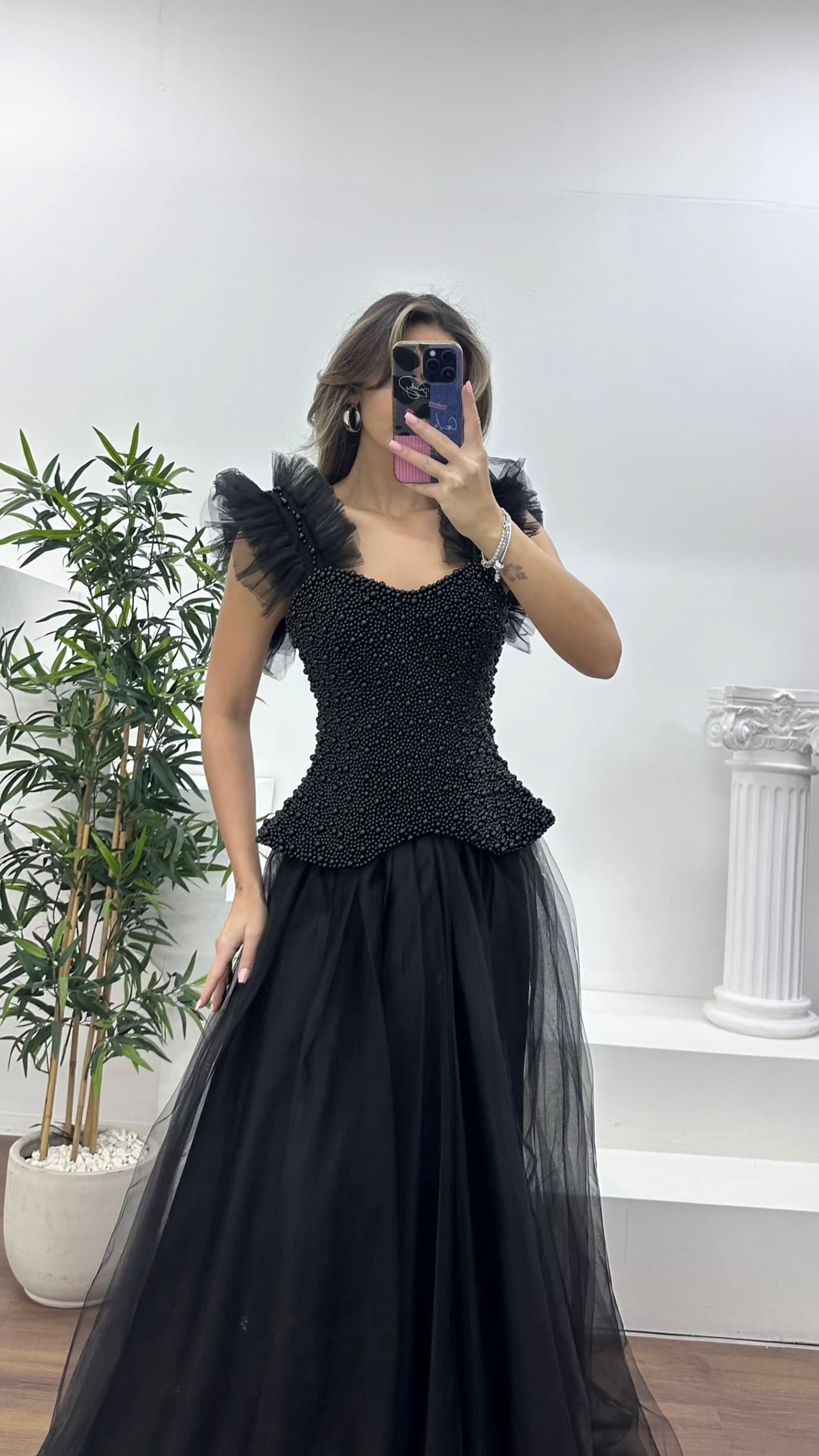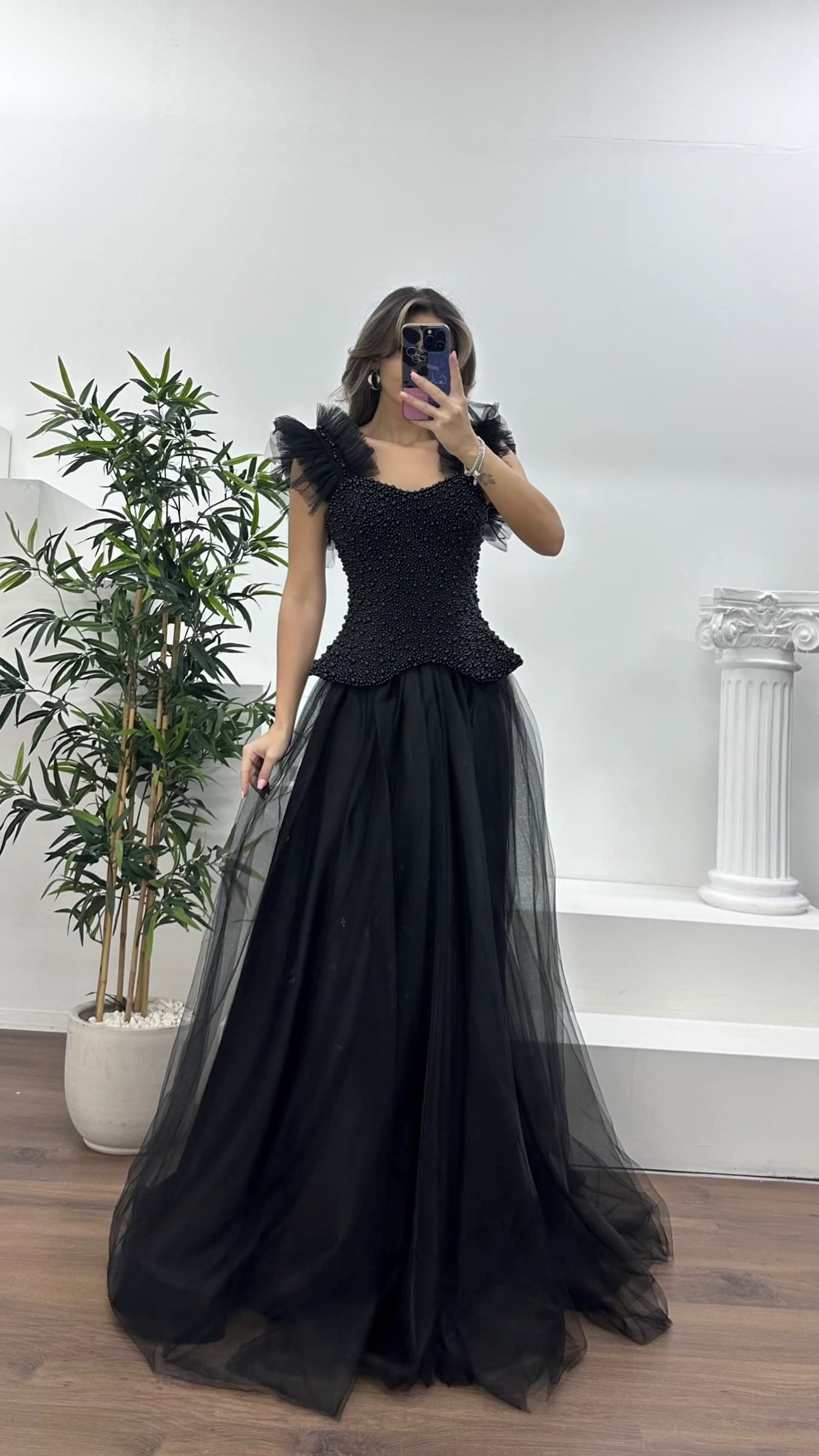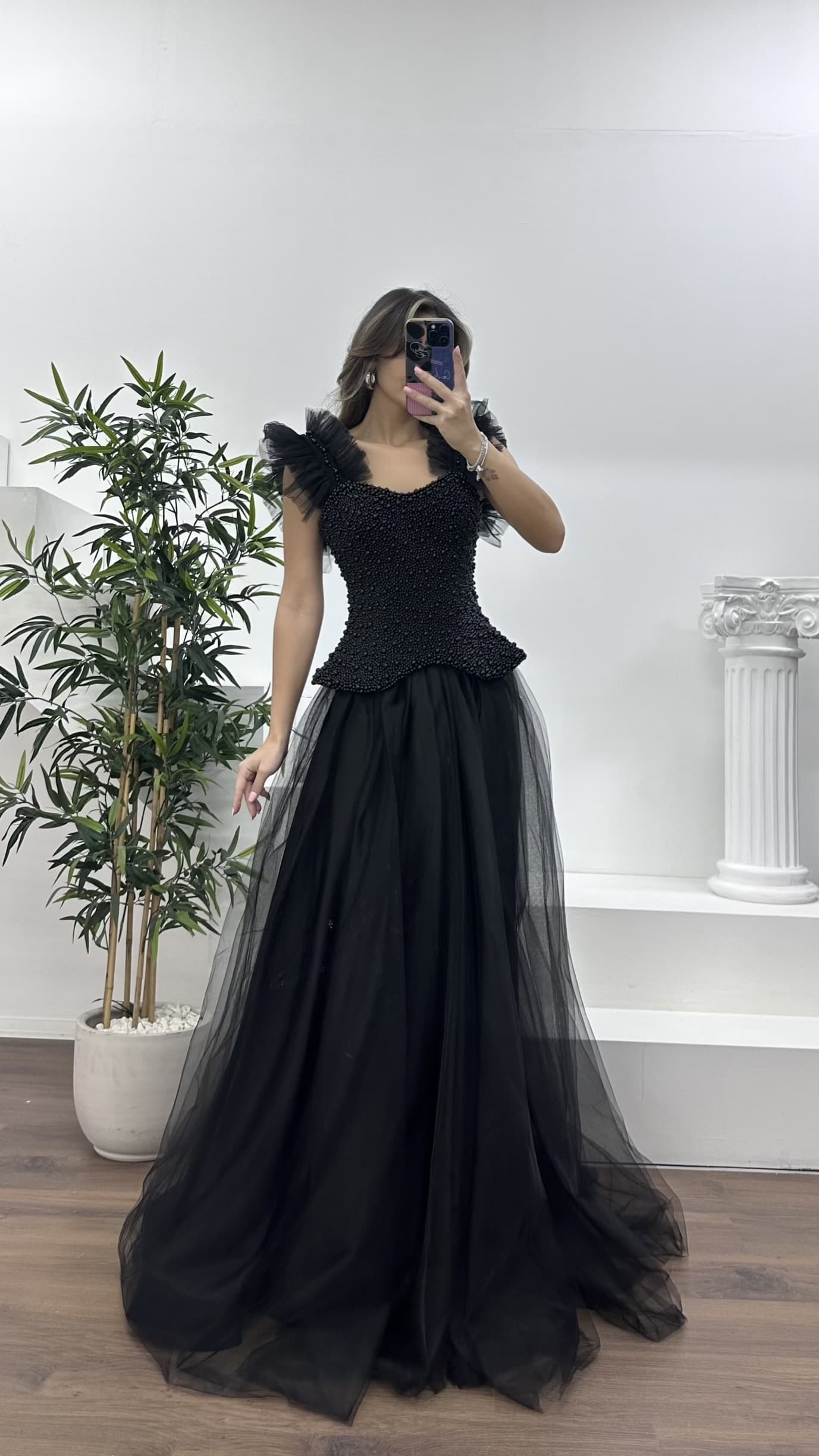 • Siyah İnci Kaplı Korse Detaylı, Tül Abiye Elbise