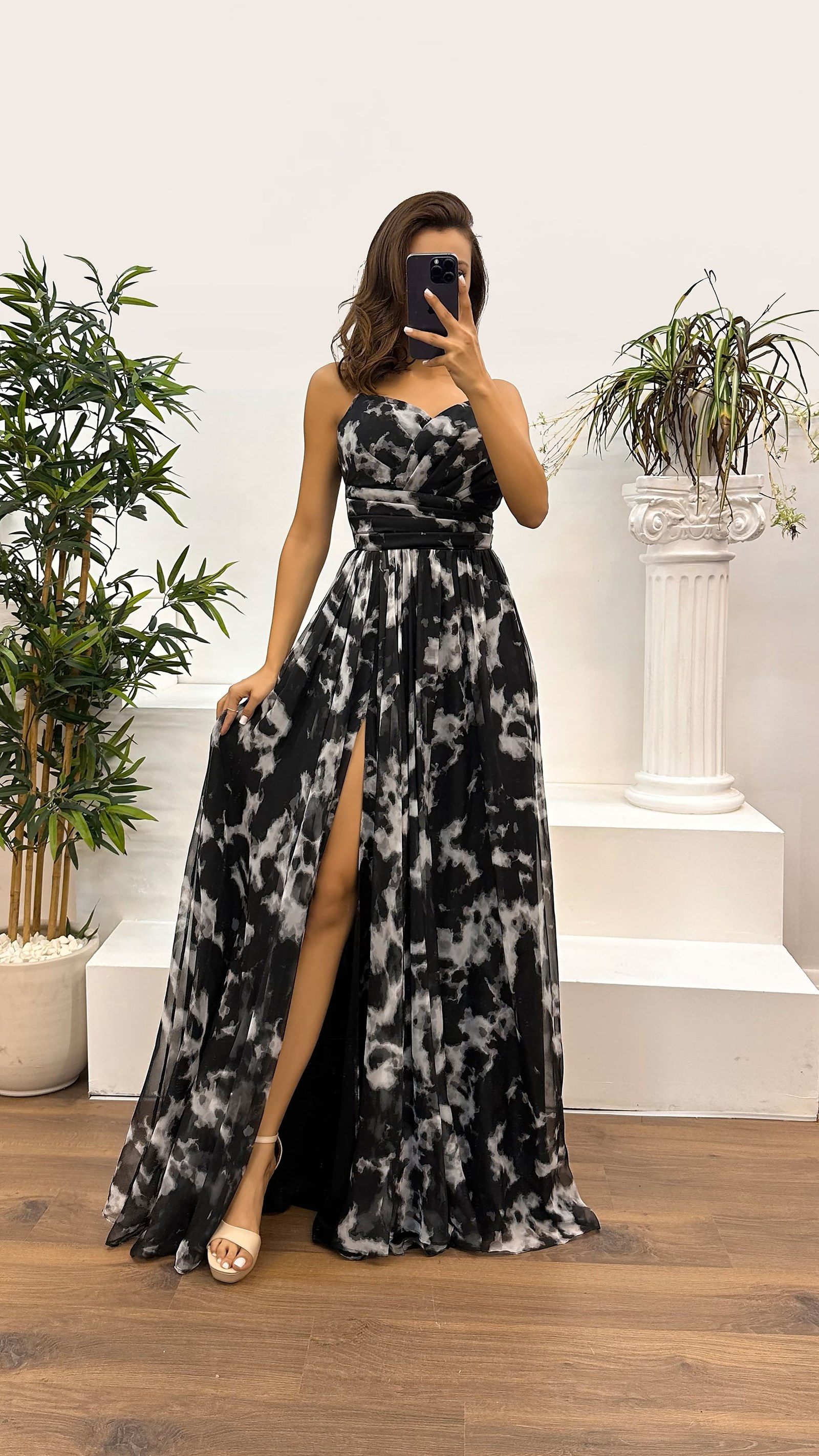 Siyah İp Askılı Desenli Şifon Abiye Elbise