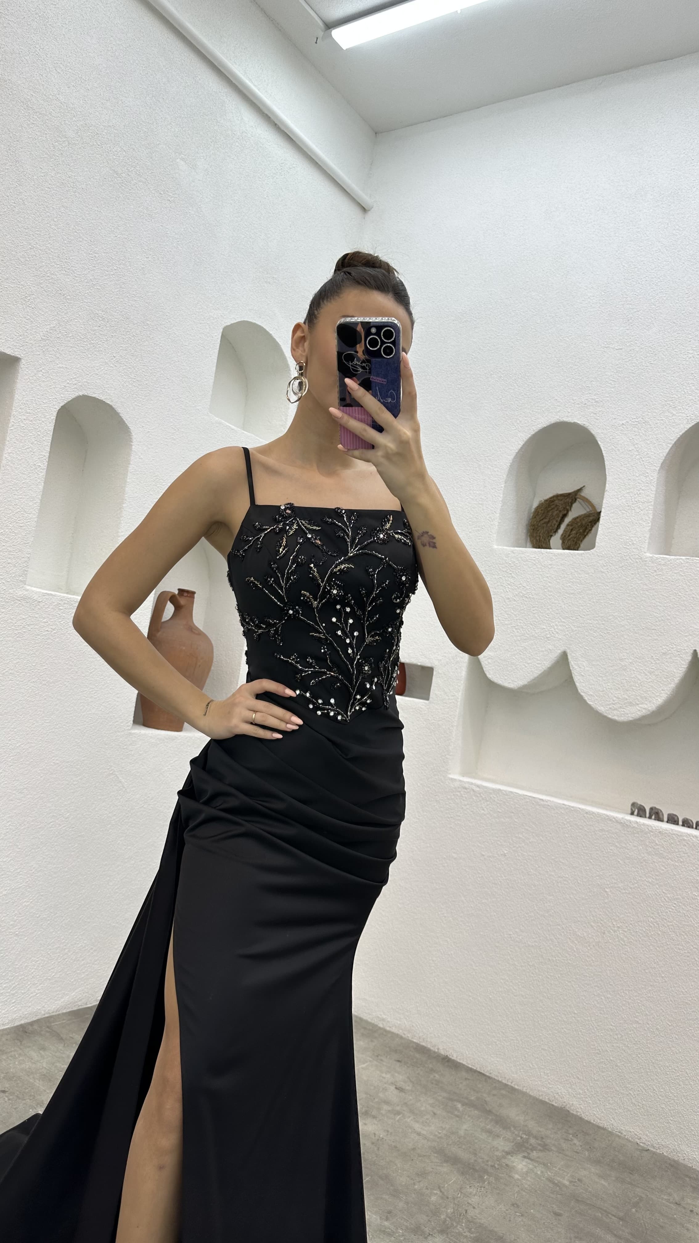 • Siyah İp Askılı İşlemeli Saten Abiye Elbise