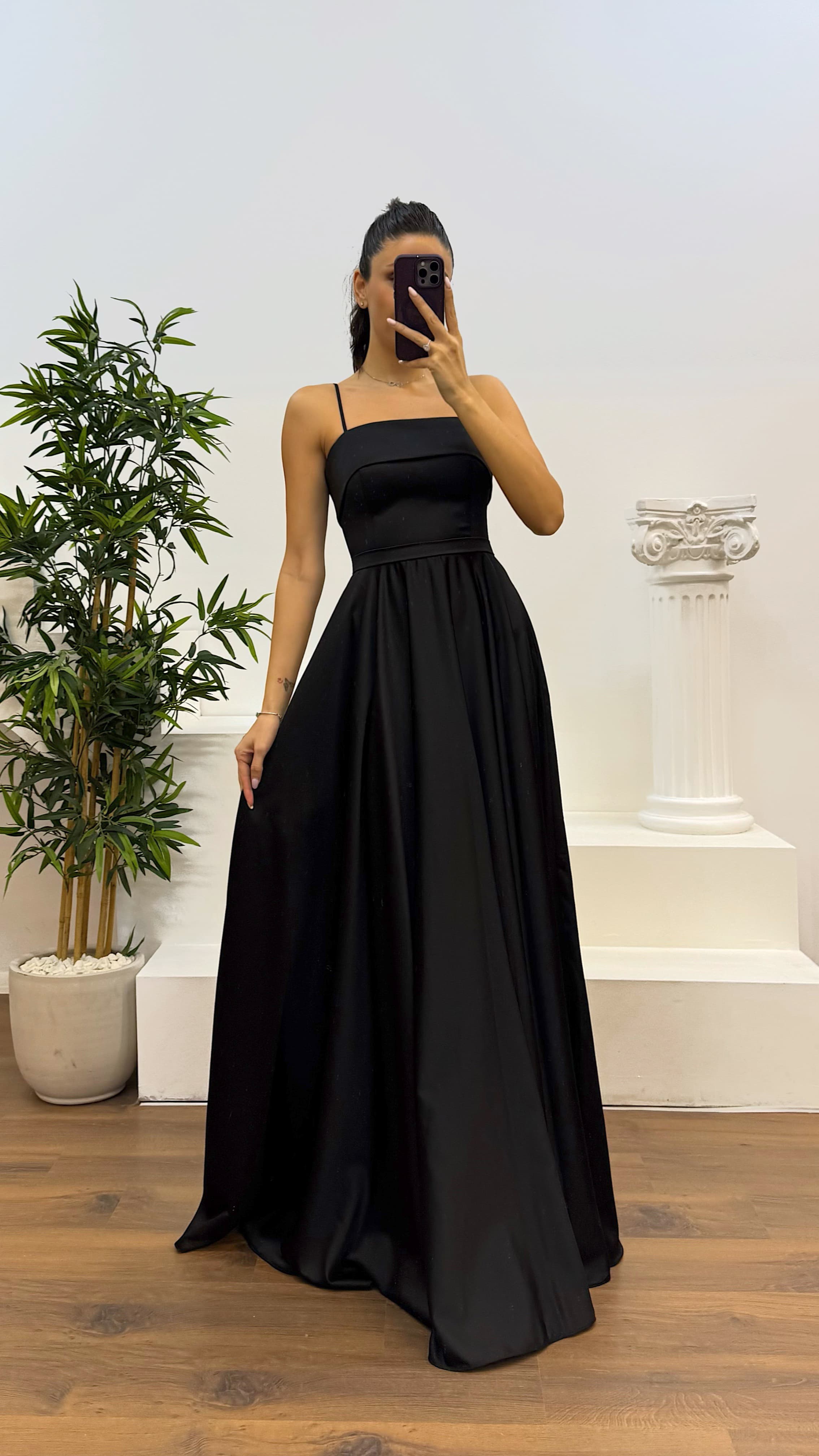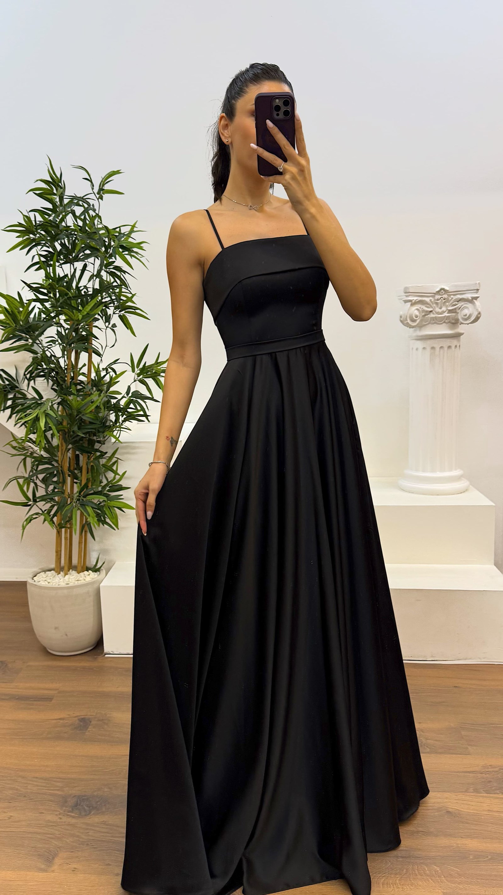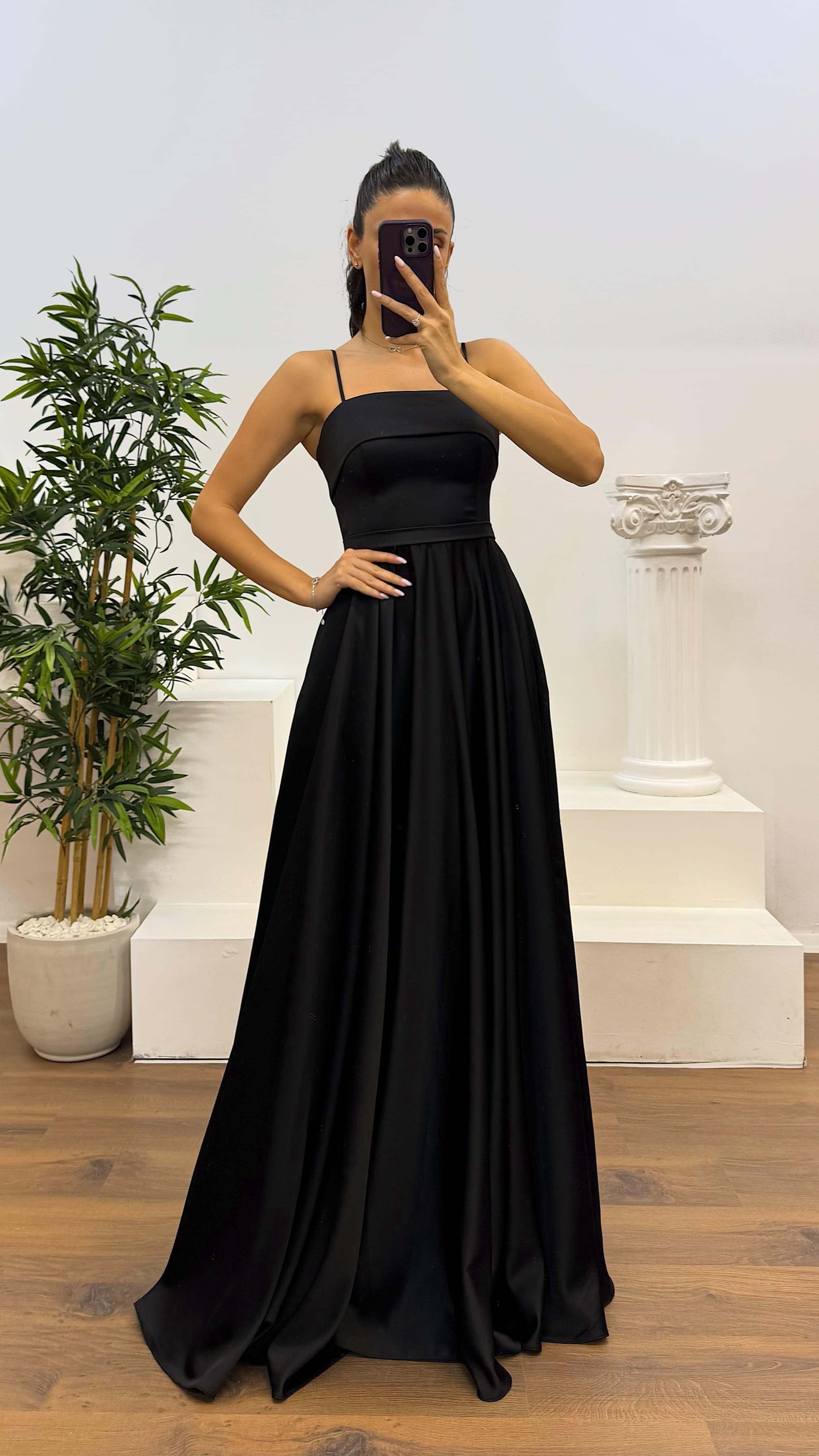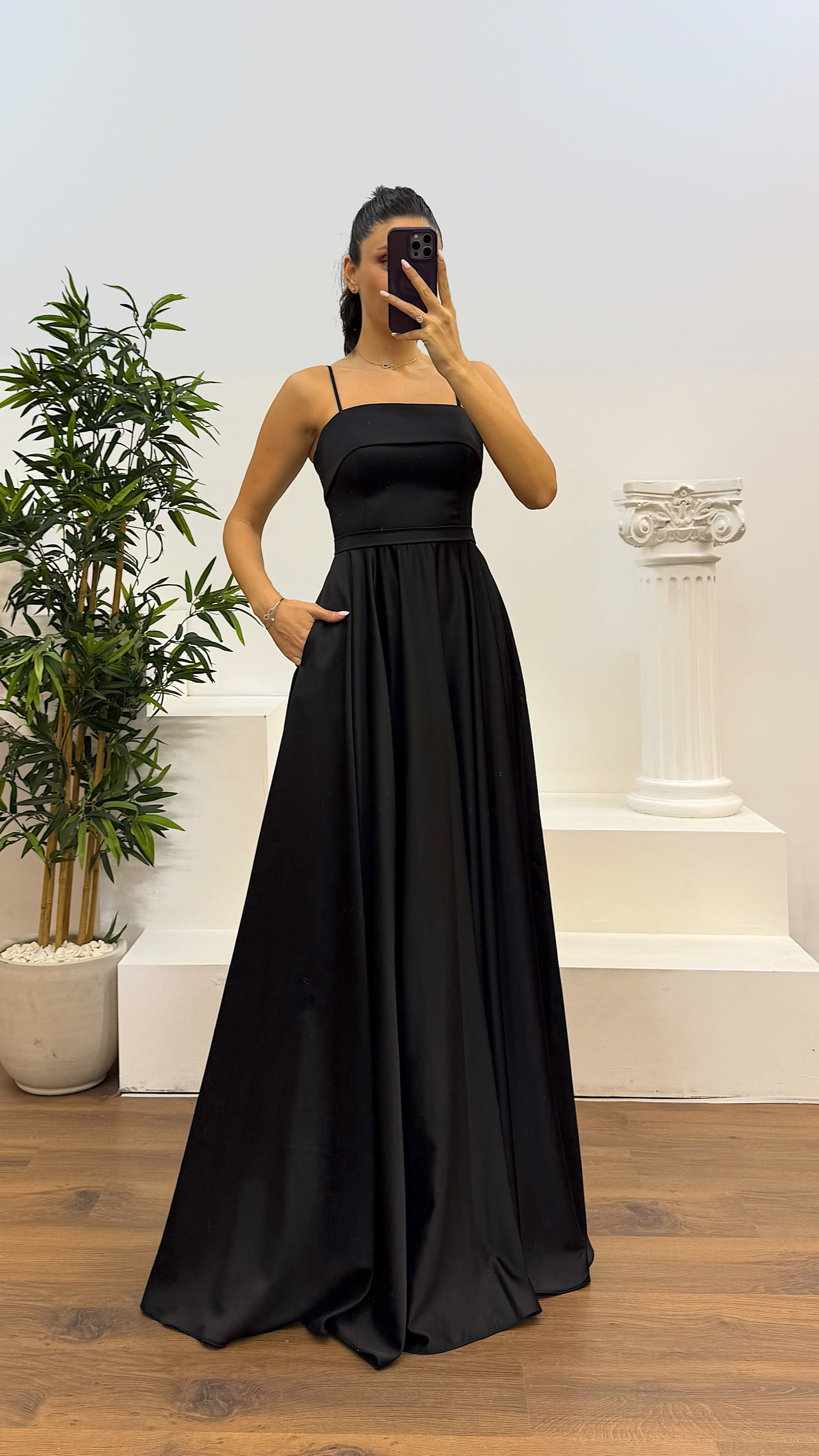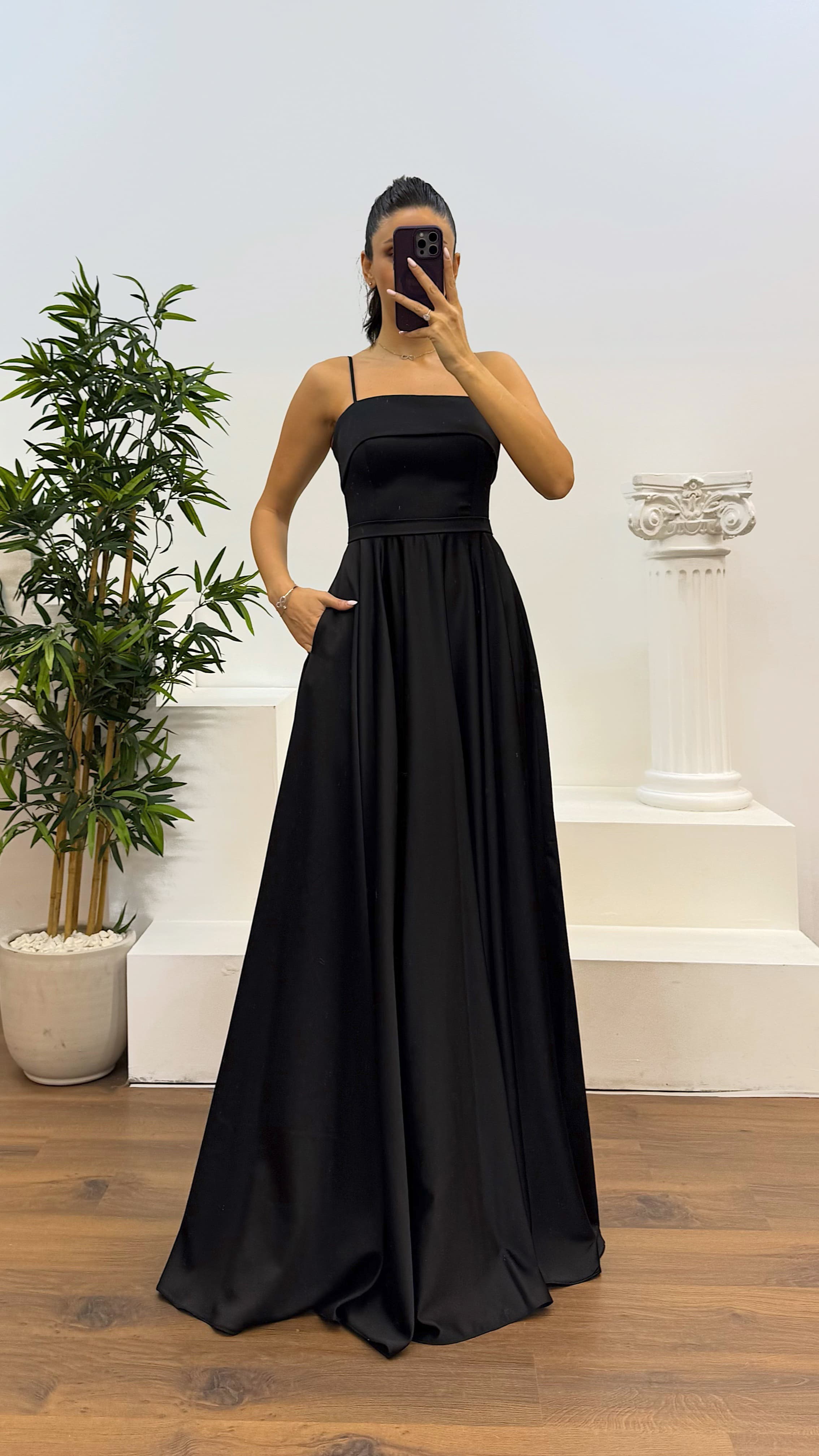 • Siyah İp Askılı Saten Abiye Elbise