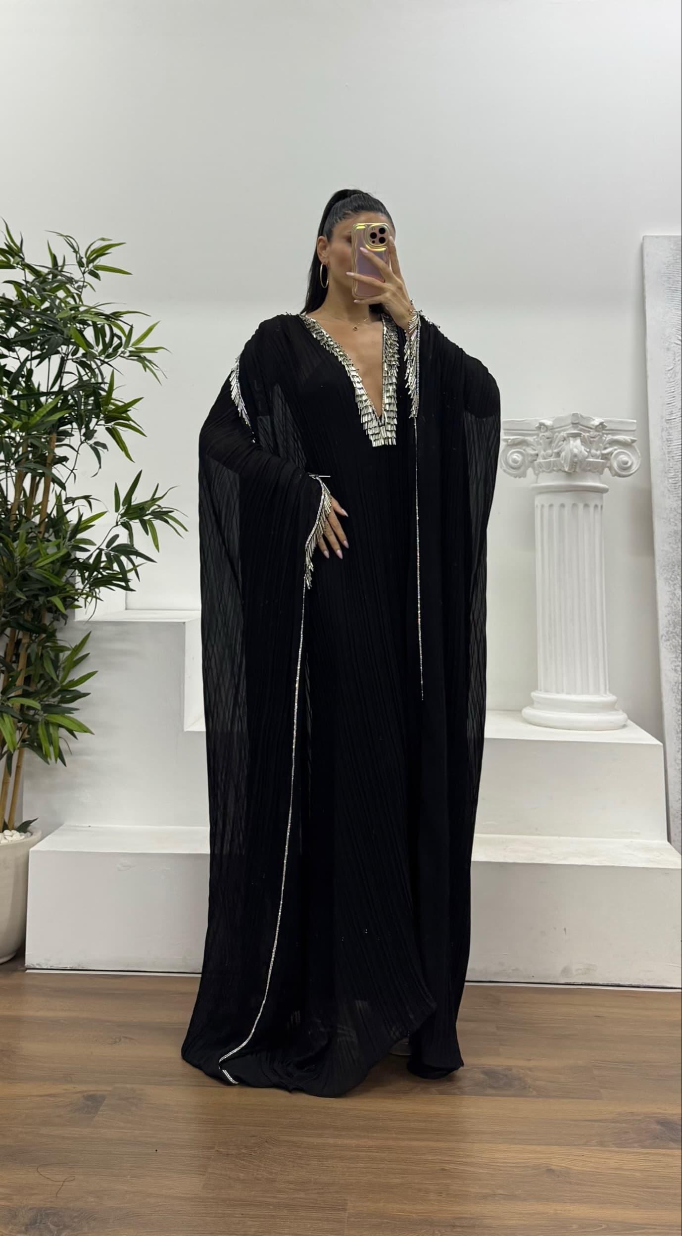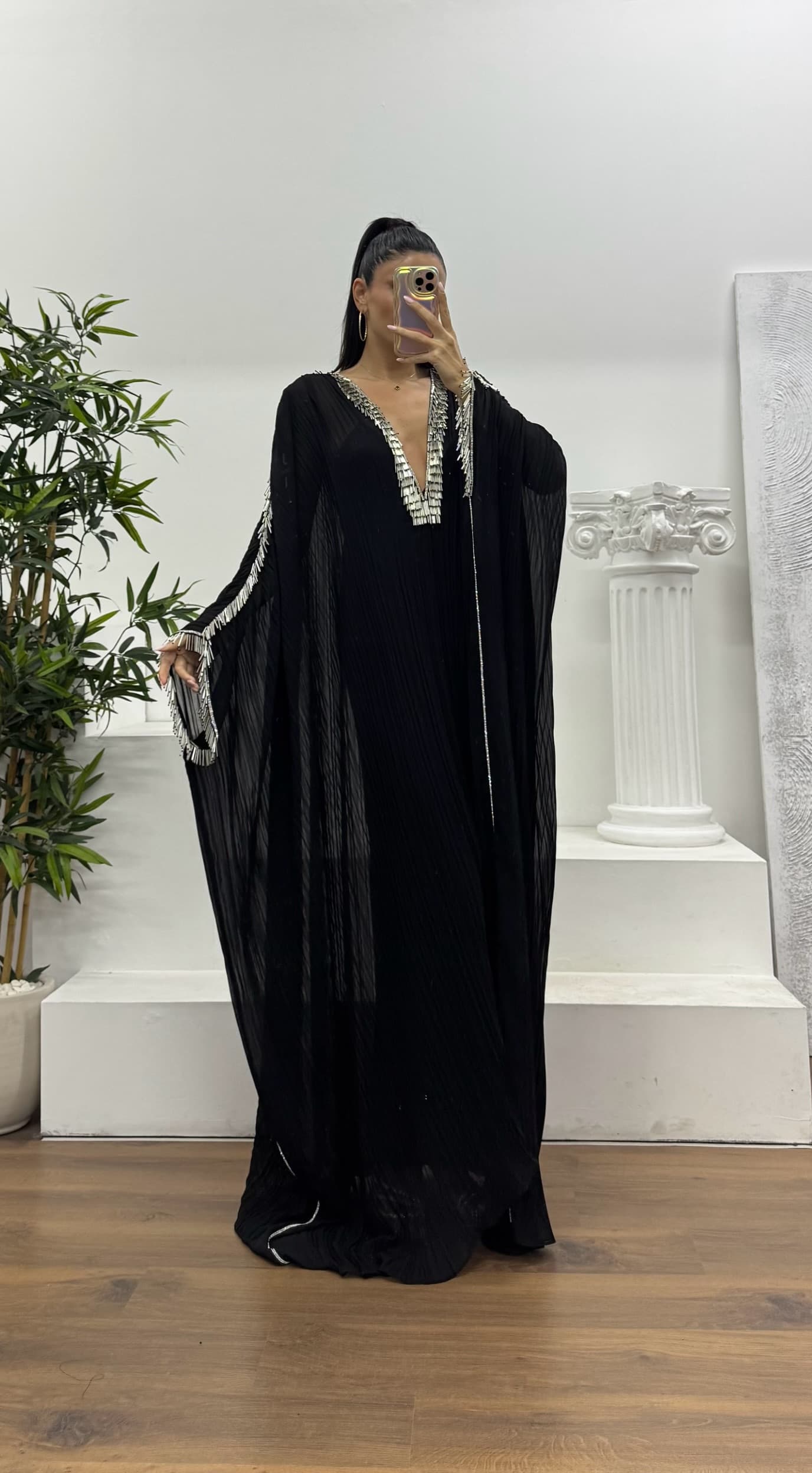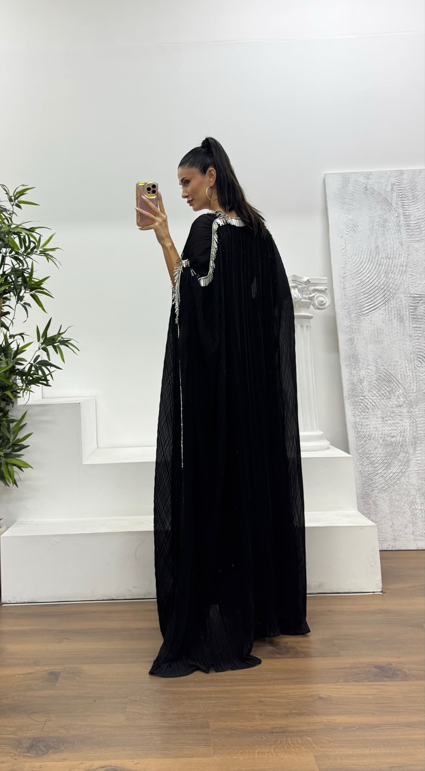 • Siyah Işıltı Taş Detaylı Özel Tasarım Abiye Elbise