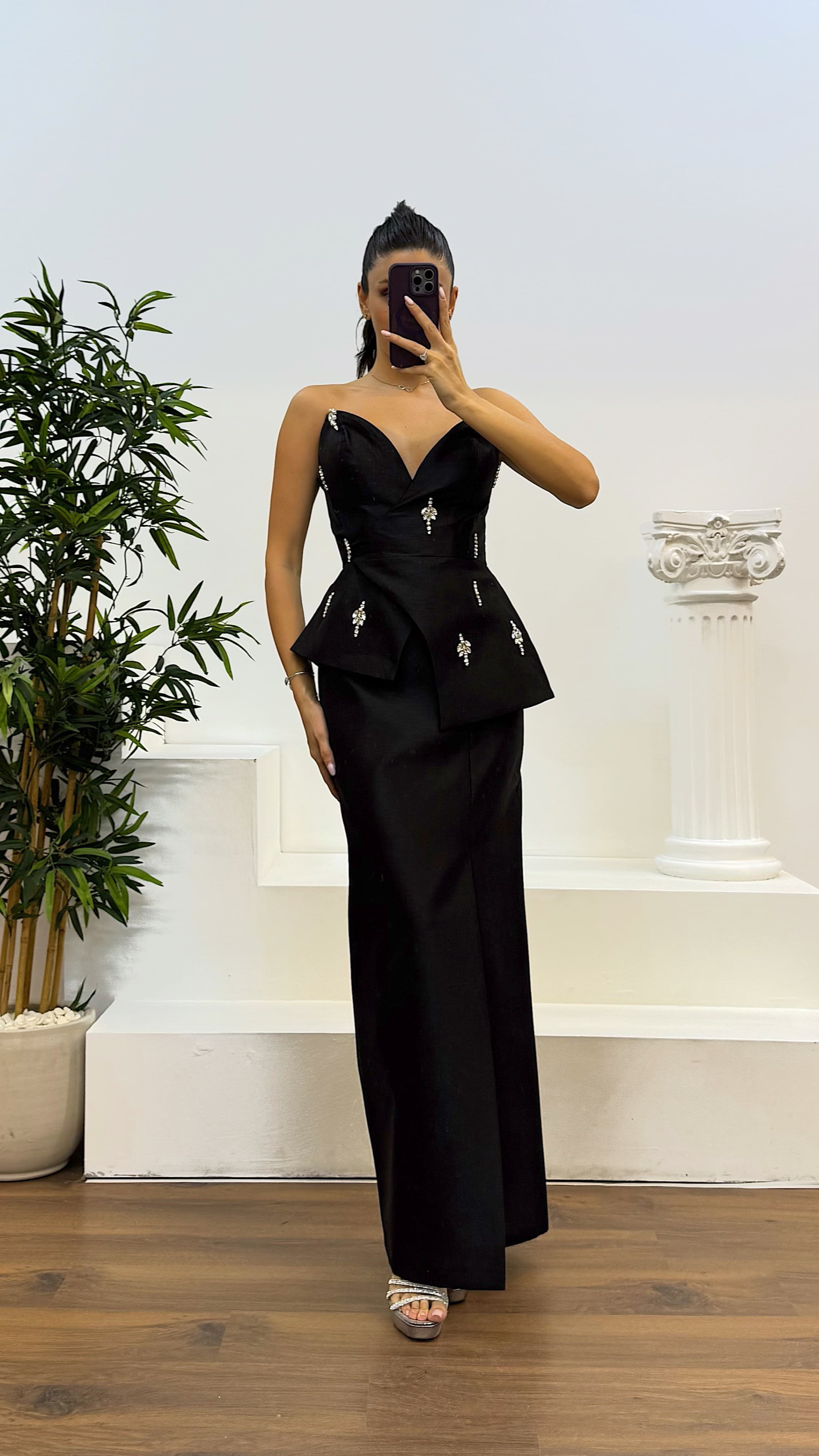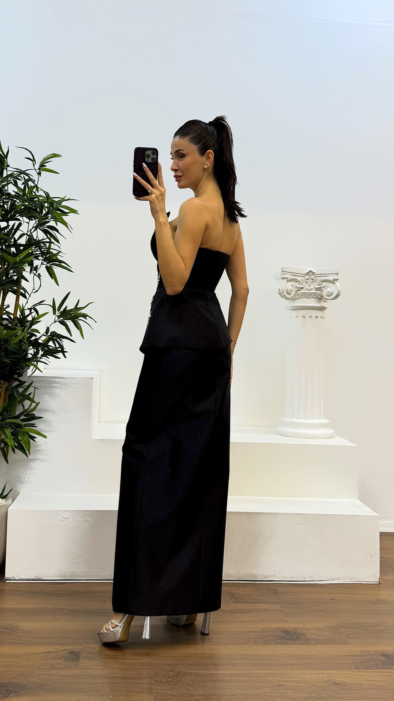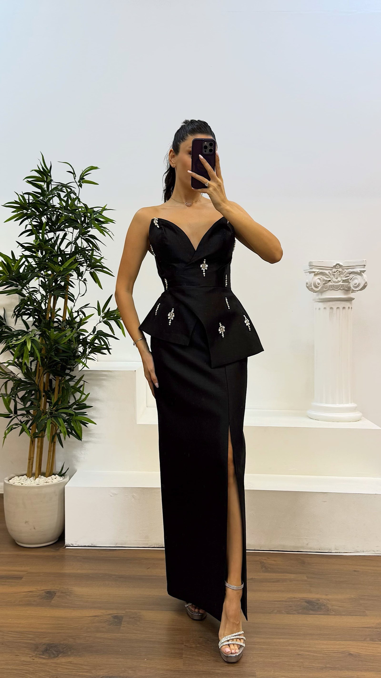 Ürün 36-44 bedene kadar uyumlu, göğüs pedli, astarlı, arka kapama fermuar, yırtmaçlı, işleme detay abiye olarak tasarlanmıştır.