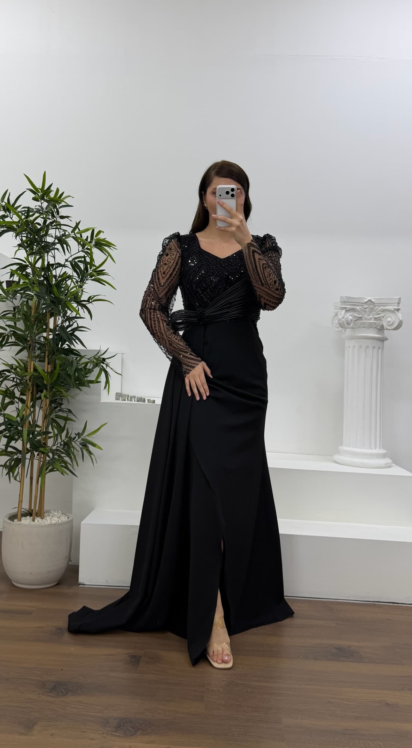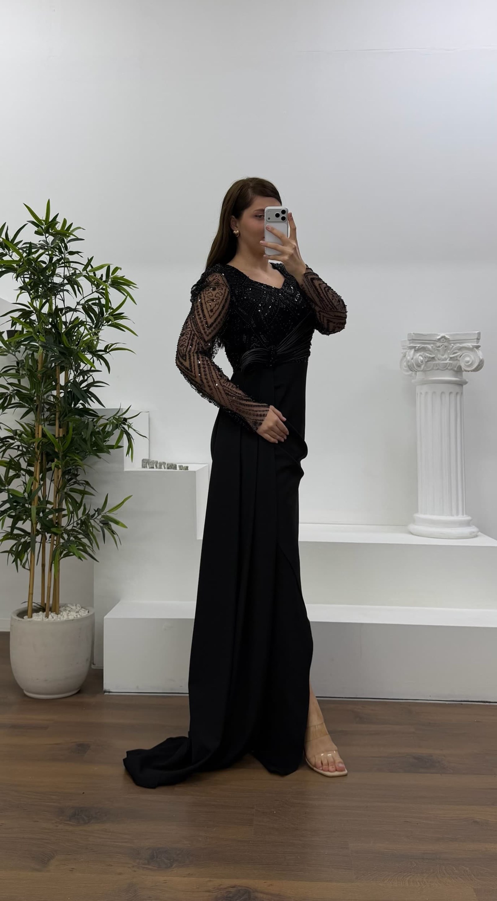 İşlemeli bel detaylı abiye elbise
