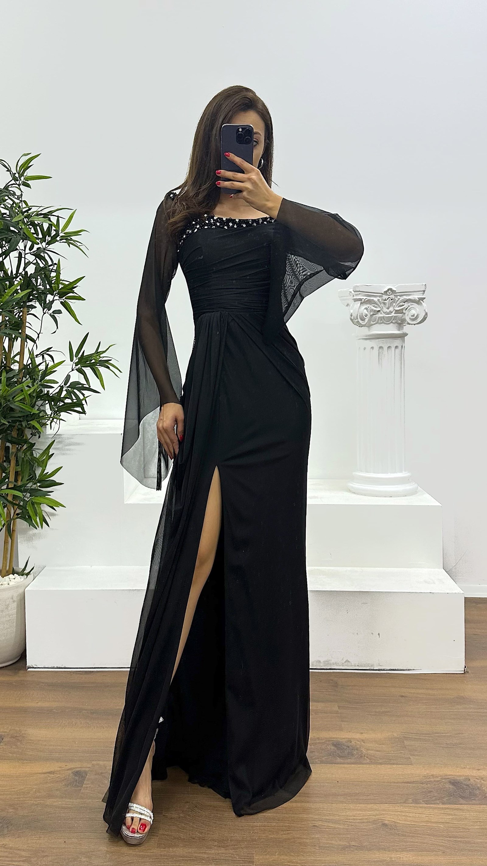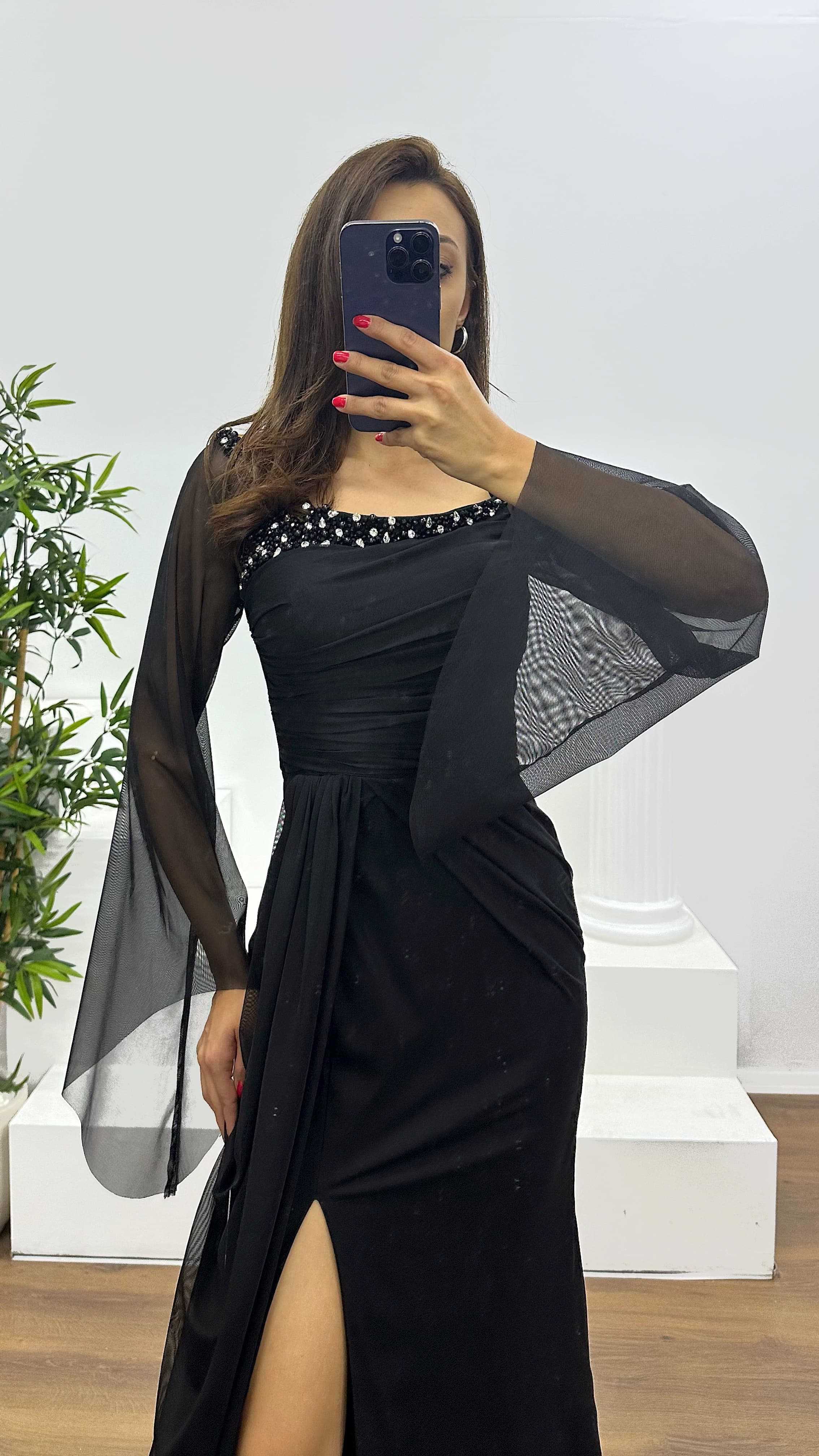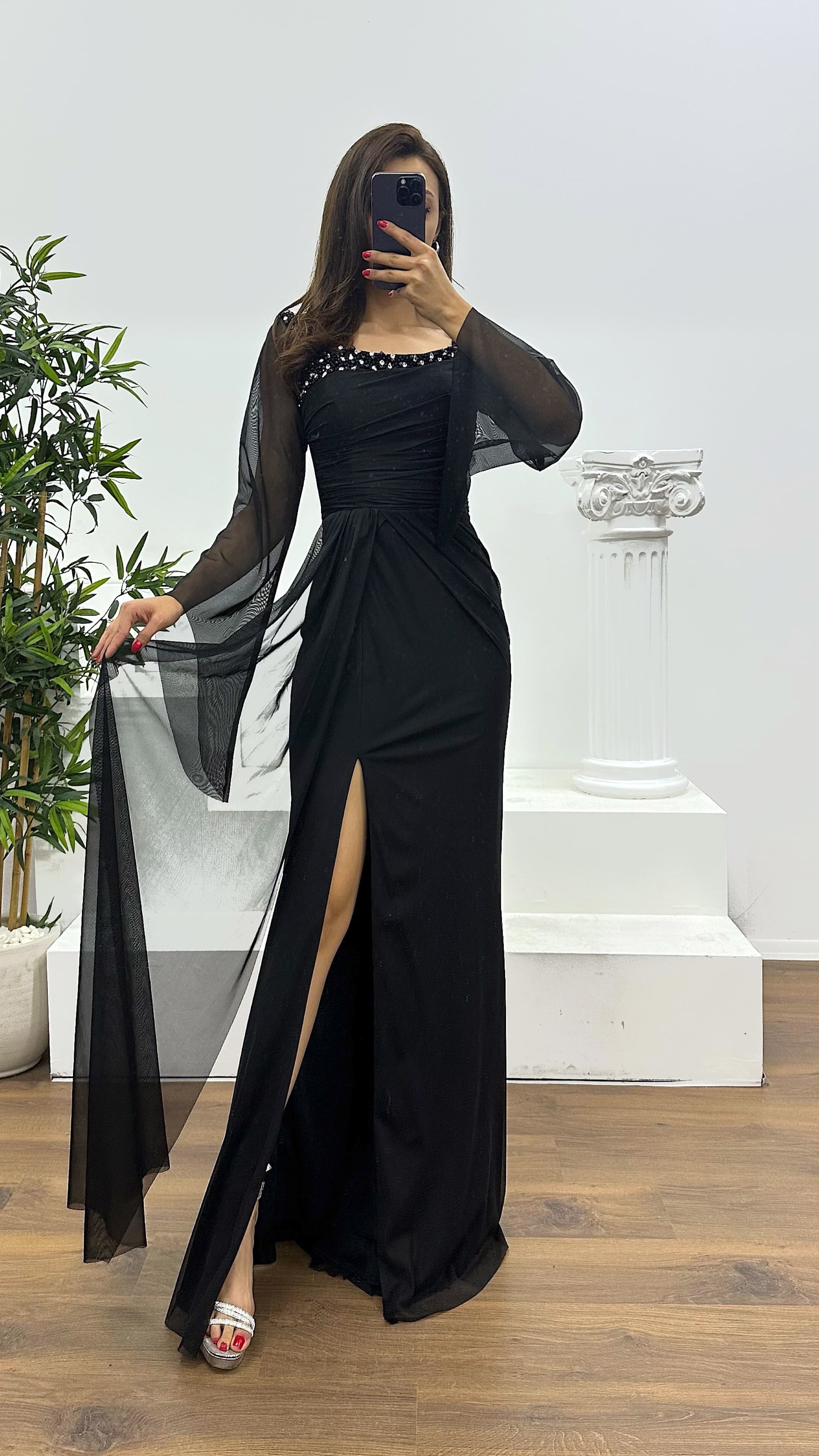 Ürün 36-42 bedene kadar uyumlu, göğüs pedli, astarlı, arka kapama fermuar, yırtmaçlı, işlemeli abiye olarak tasarlanmıştır.