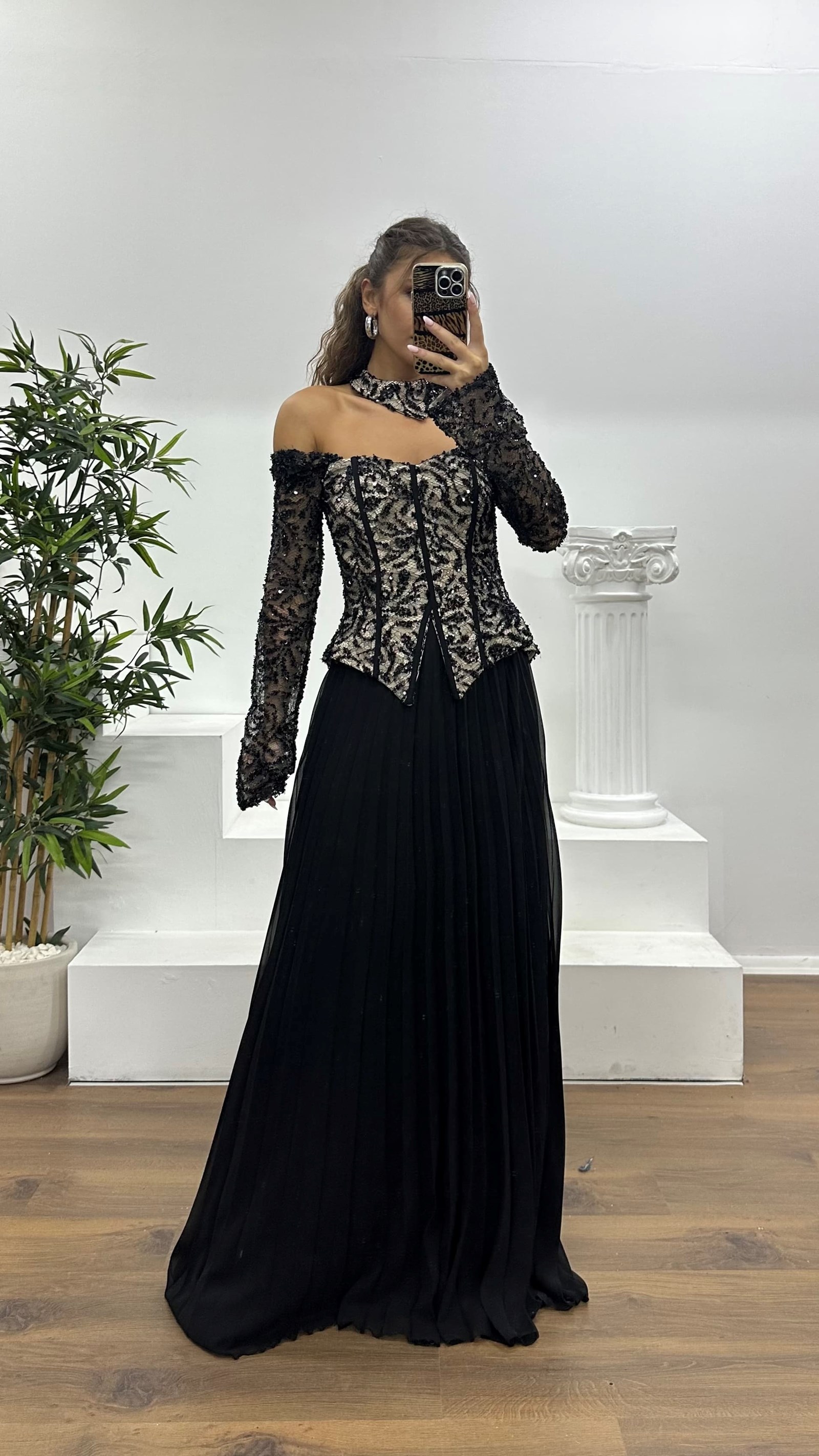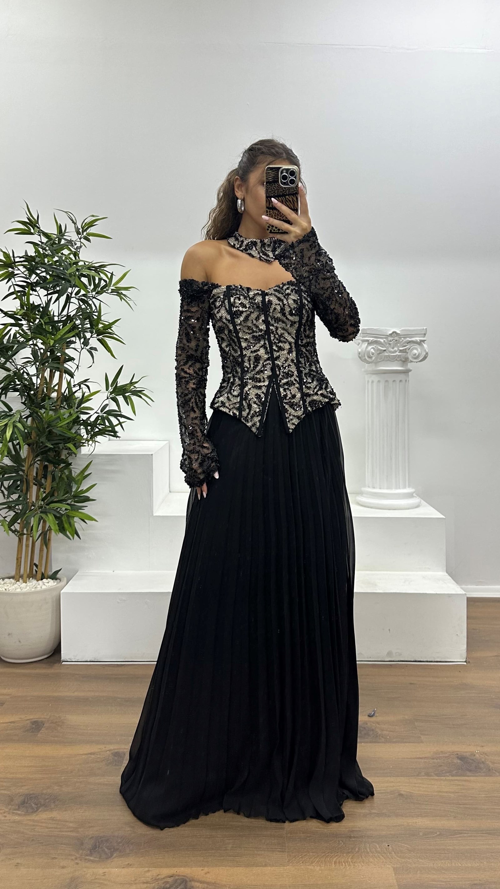 • Siyah Kayık Yaka Abiye Elbise