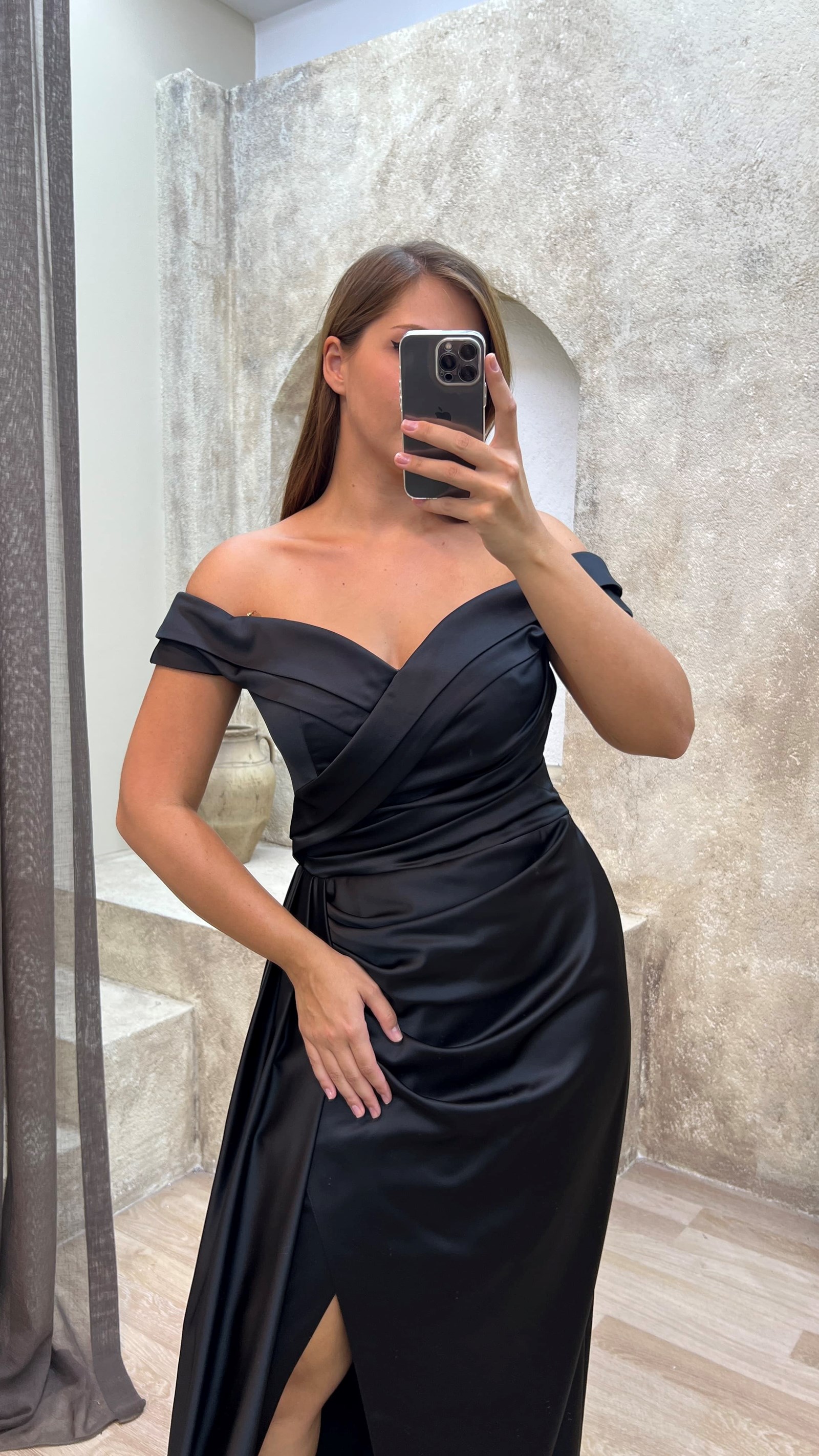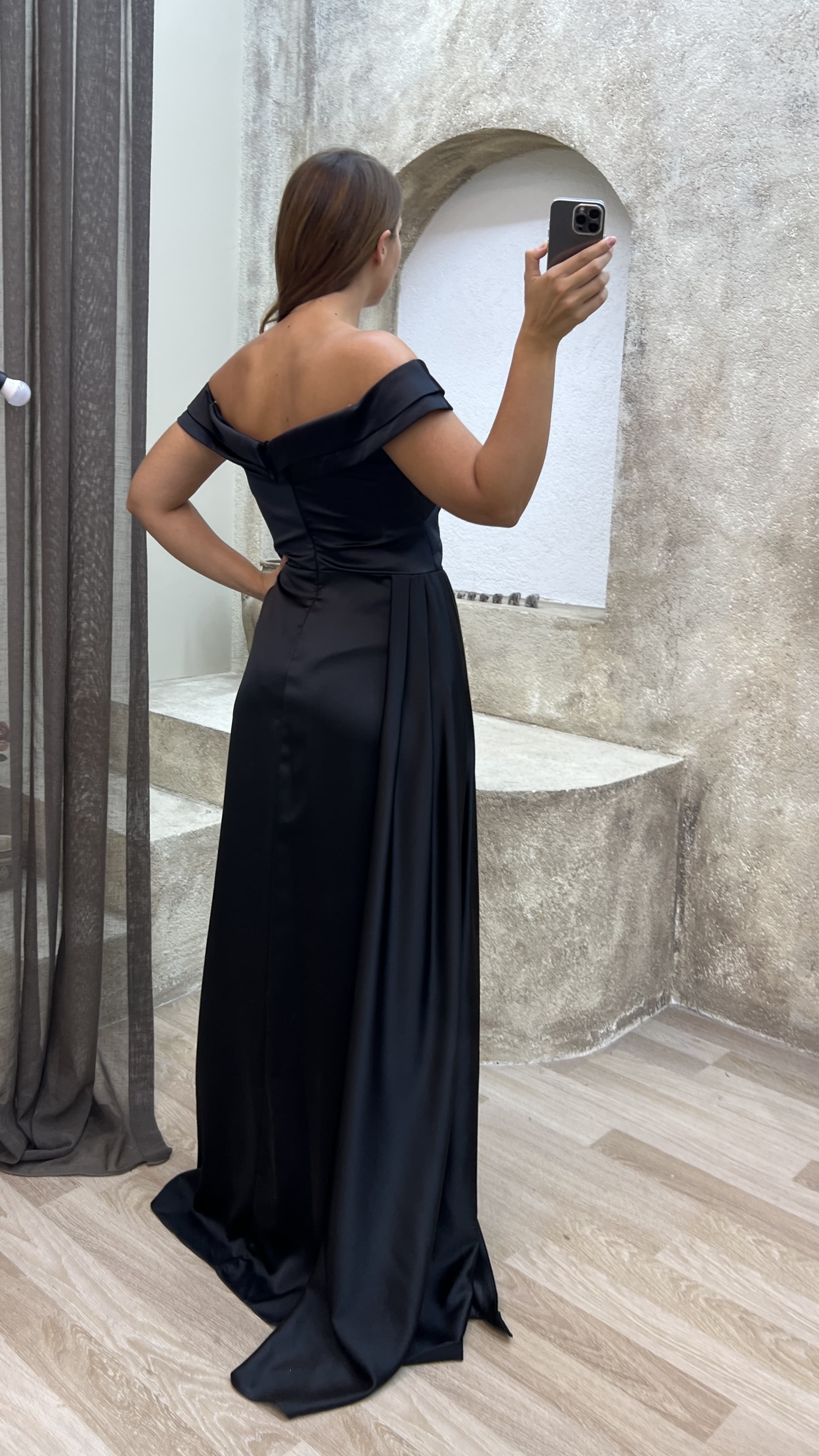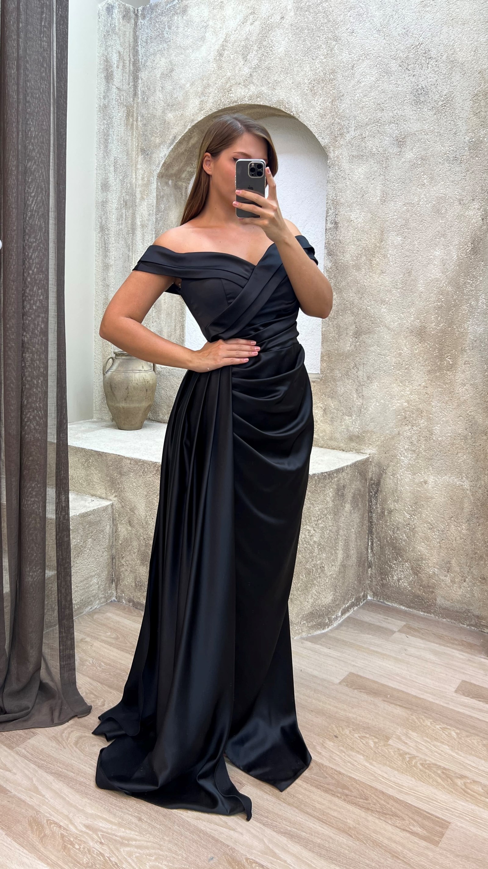 Siyah Kayık Yaka Bel Detay Saten Büyük Beden Abiye Elbise