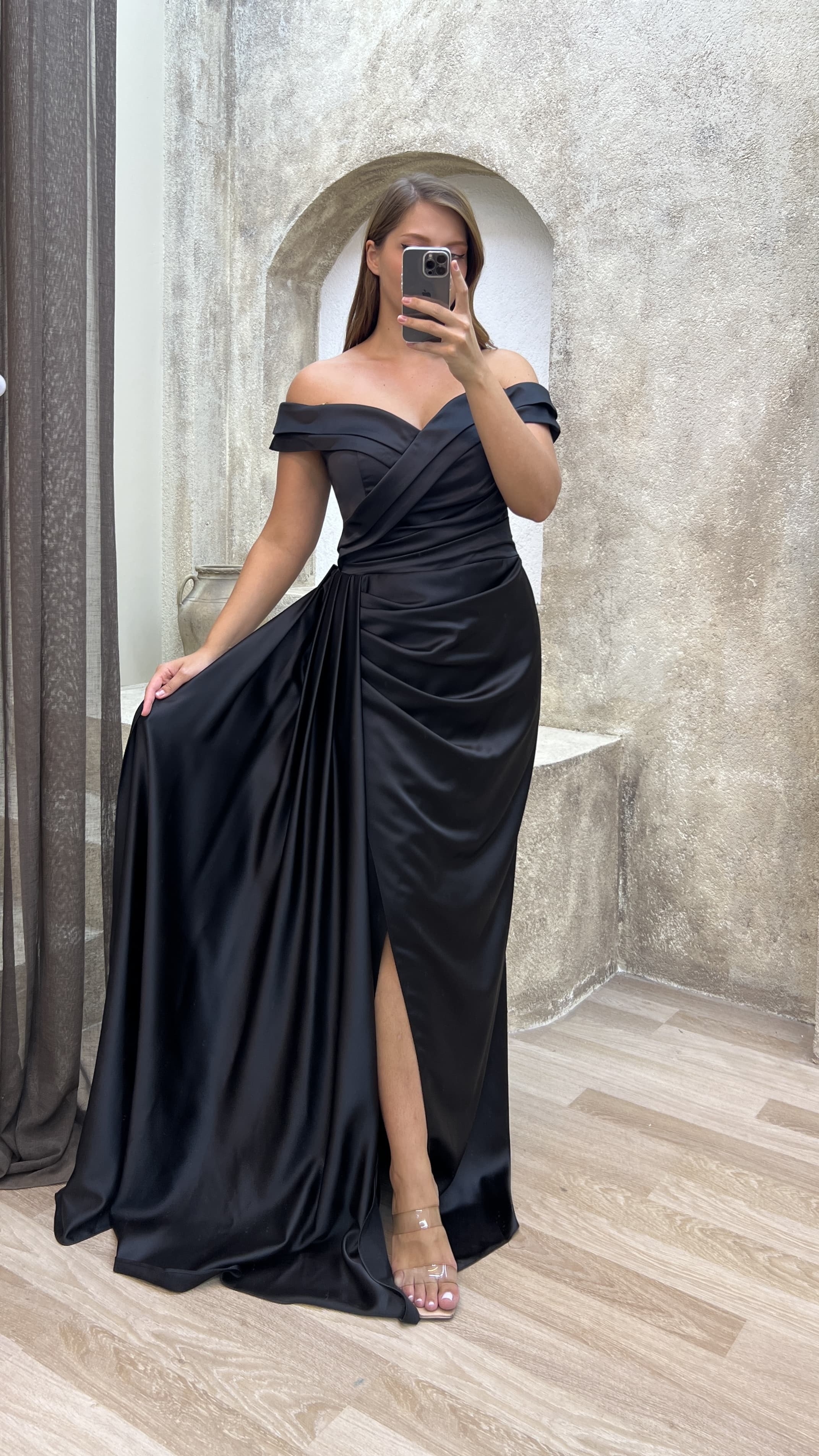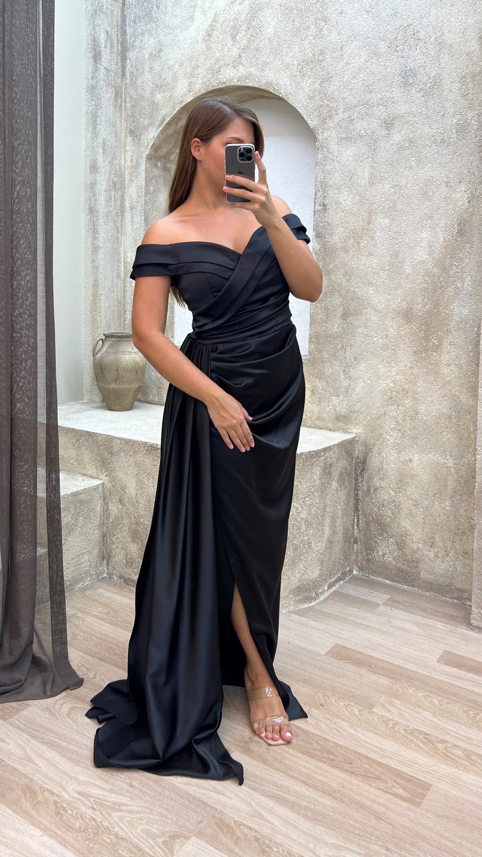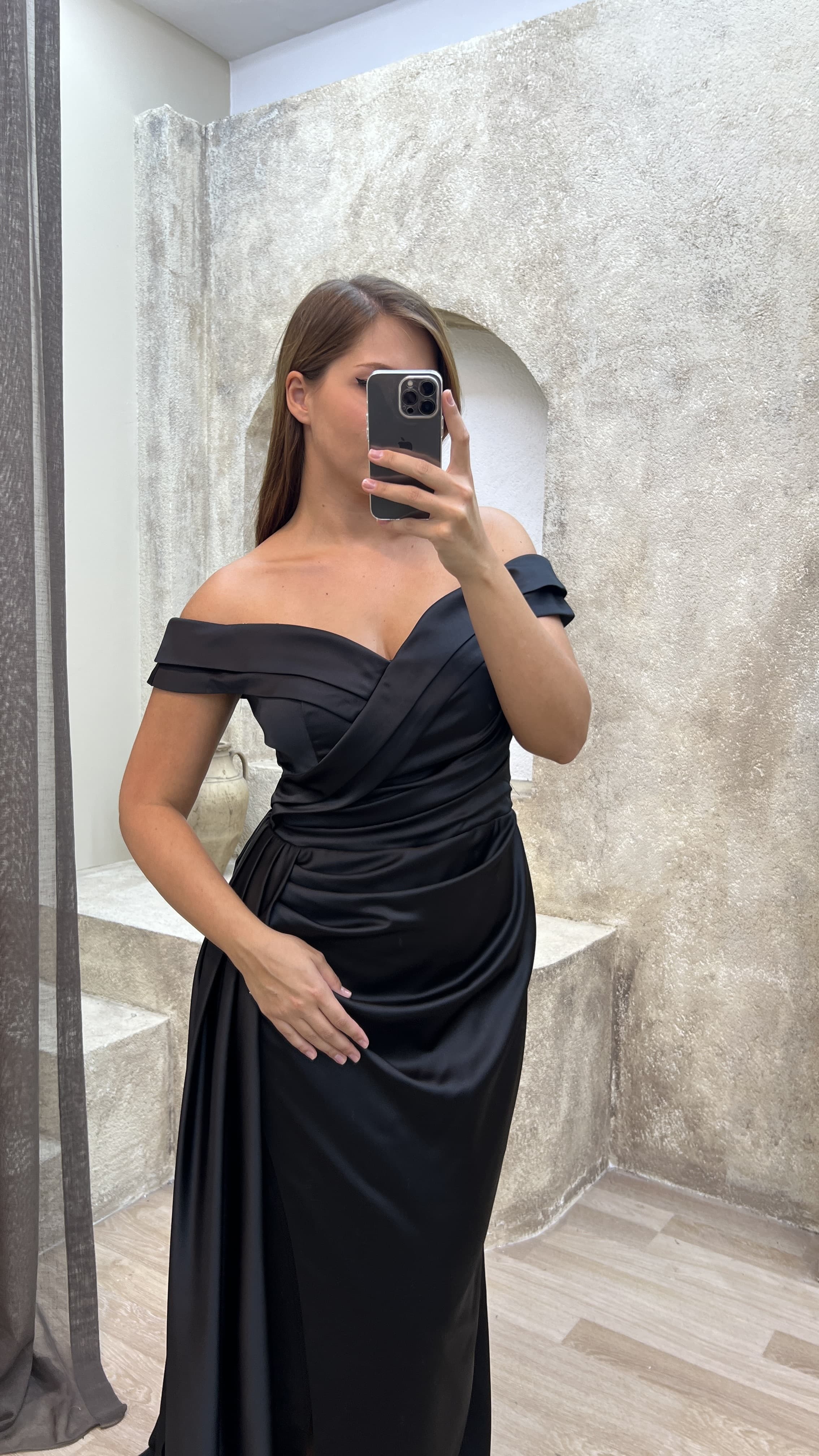 Siyah Kayık Yaka Bel Detay Saten Büyük Beden Abiye Elbise