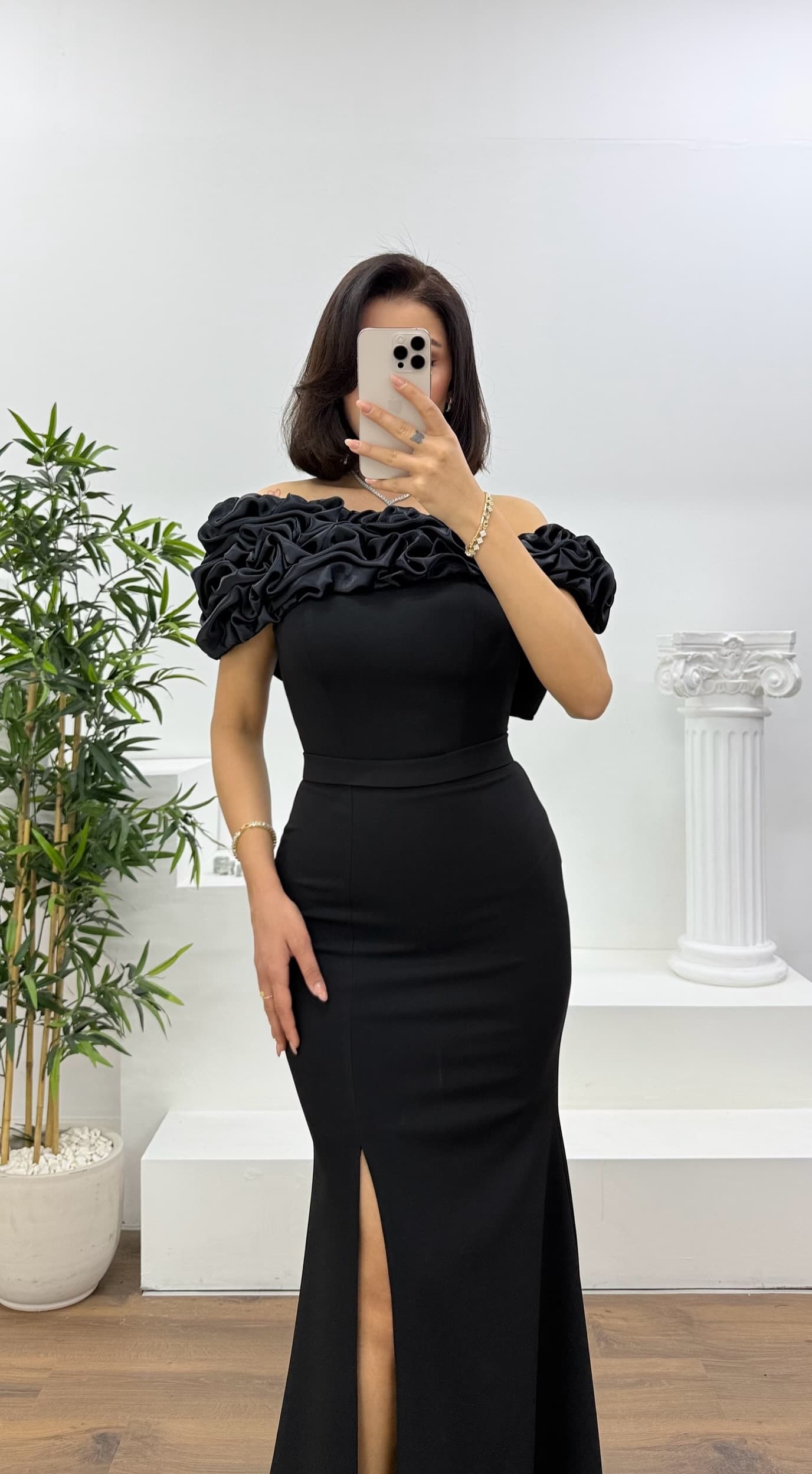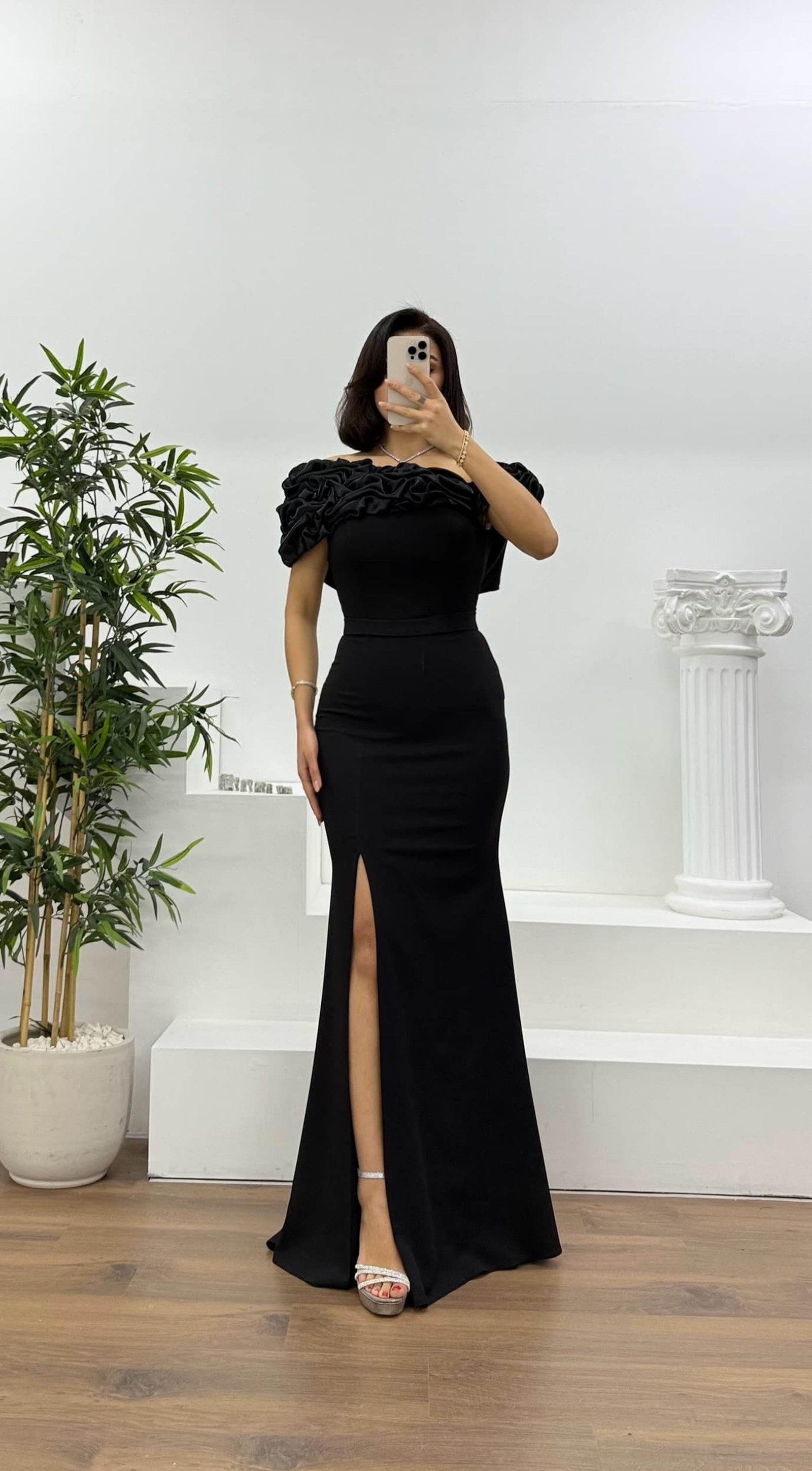 Ürün 36-42 bedene kadar uyumludur. göğüs pedli, astarlı, arka kapama fermuar, yırtmaçlı, fırfırlı abiye olarak tasarlanmıştır.
