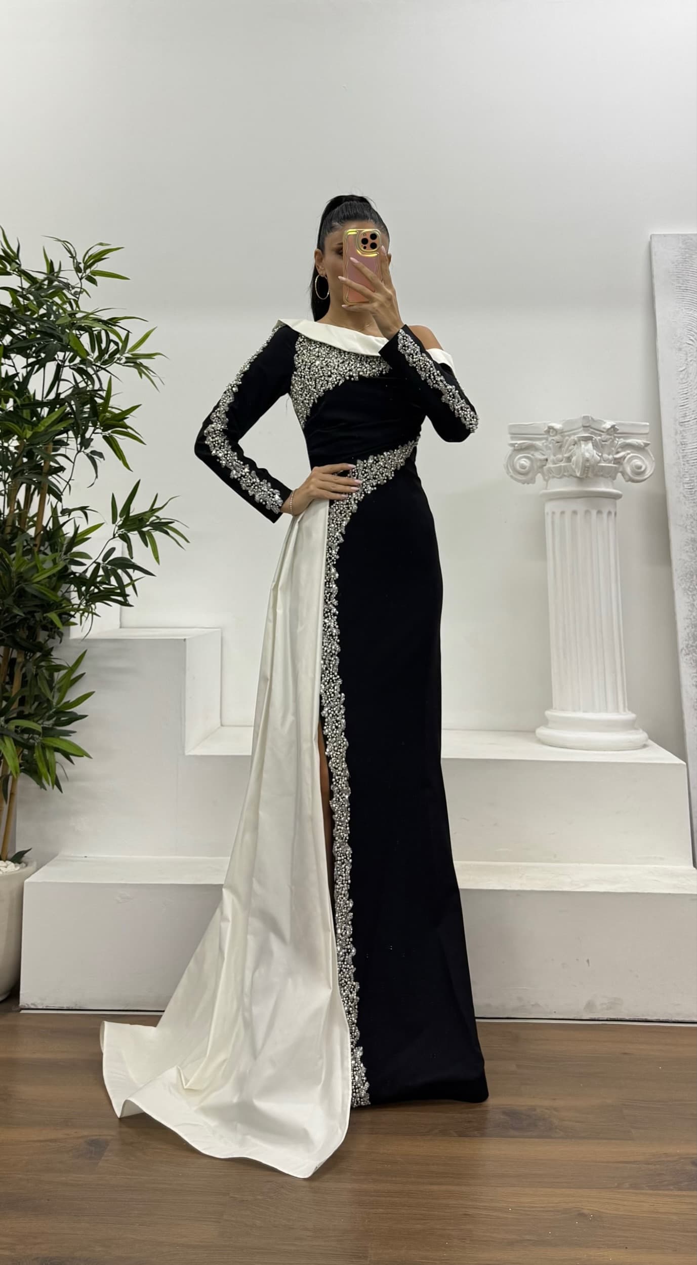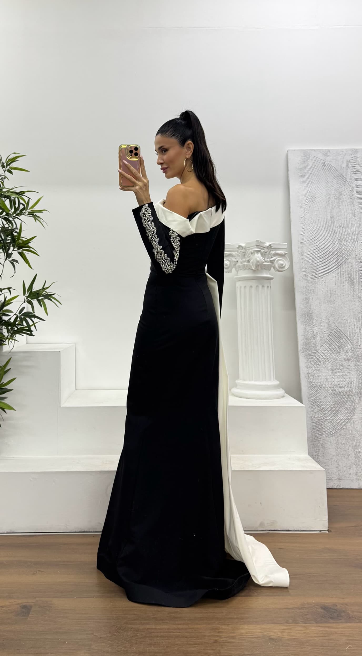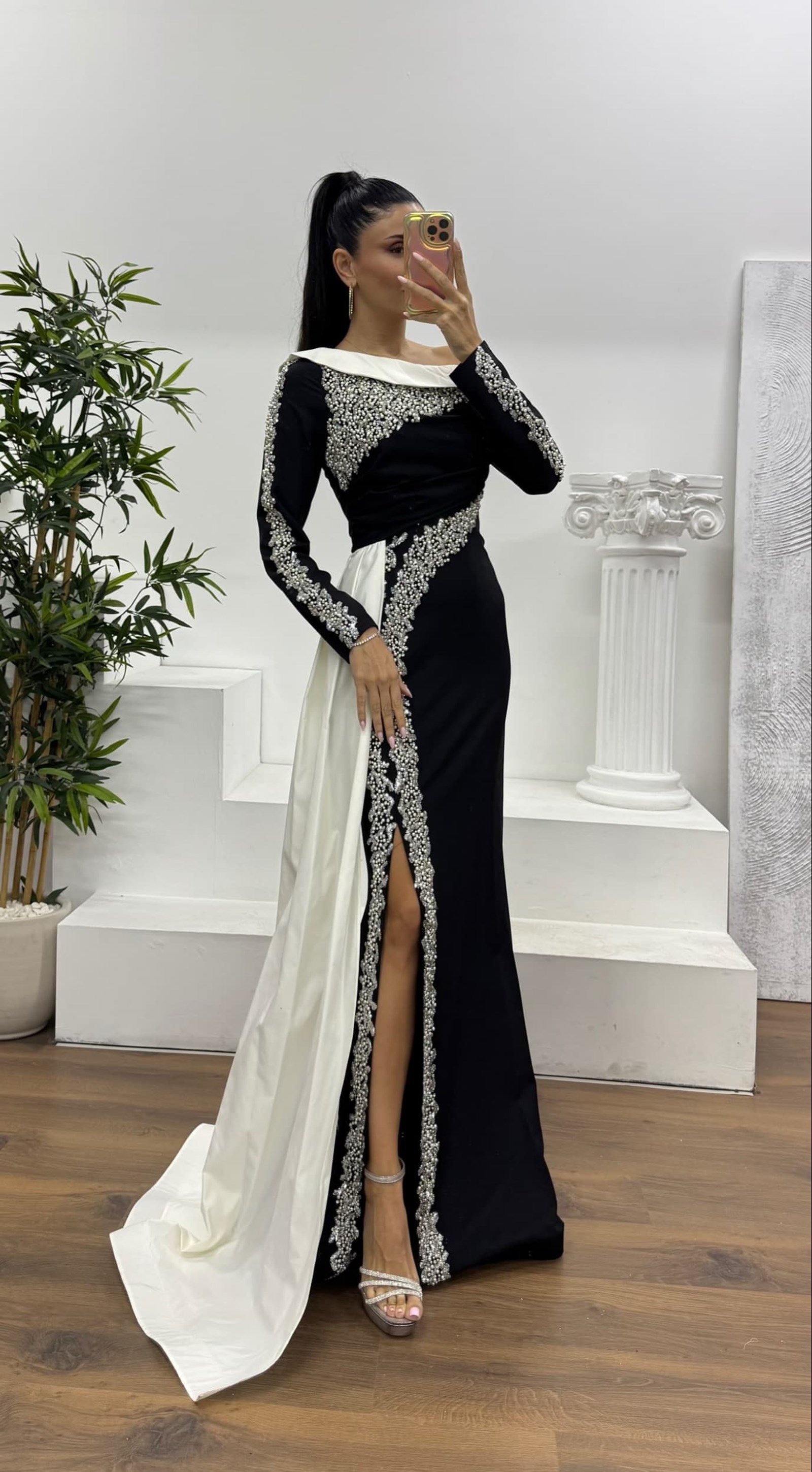 • Siyah Kayık Yaka İnci İşlemeli Abiye Elbise