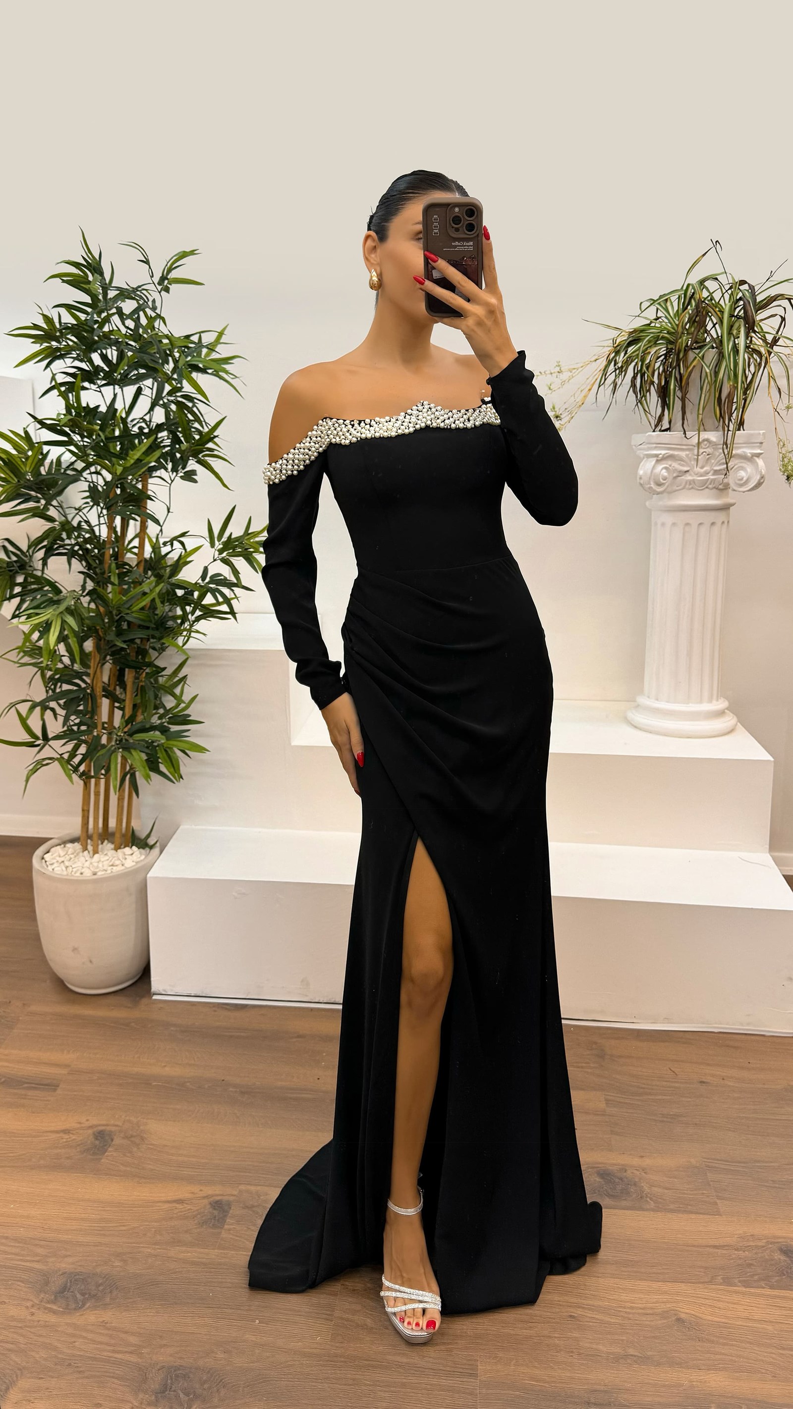 • Siyah Kayık Yaka Uzun Kollu Abiye Elbise