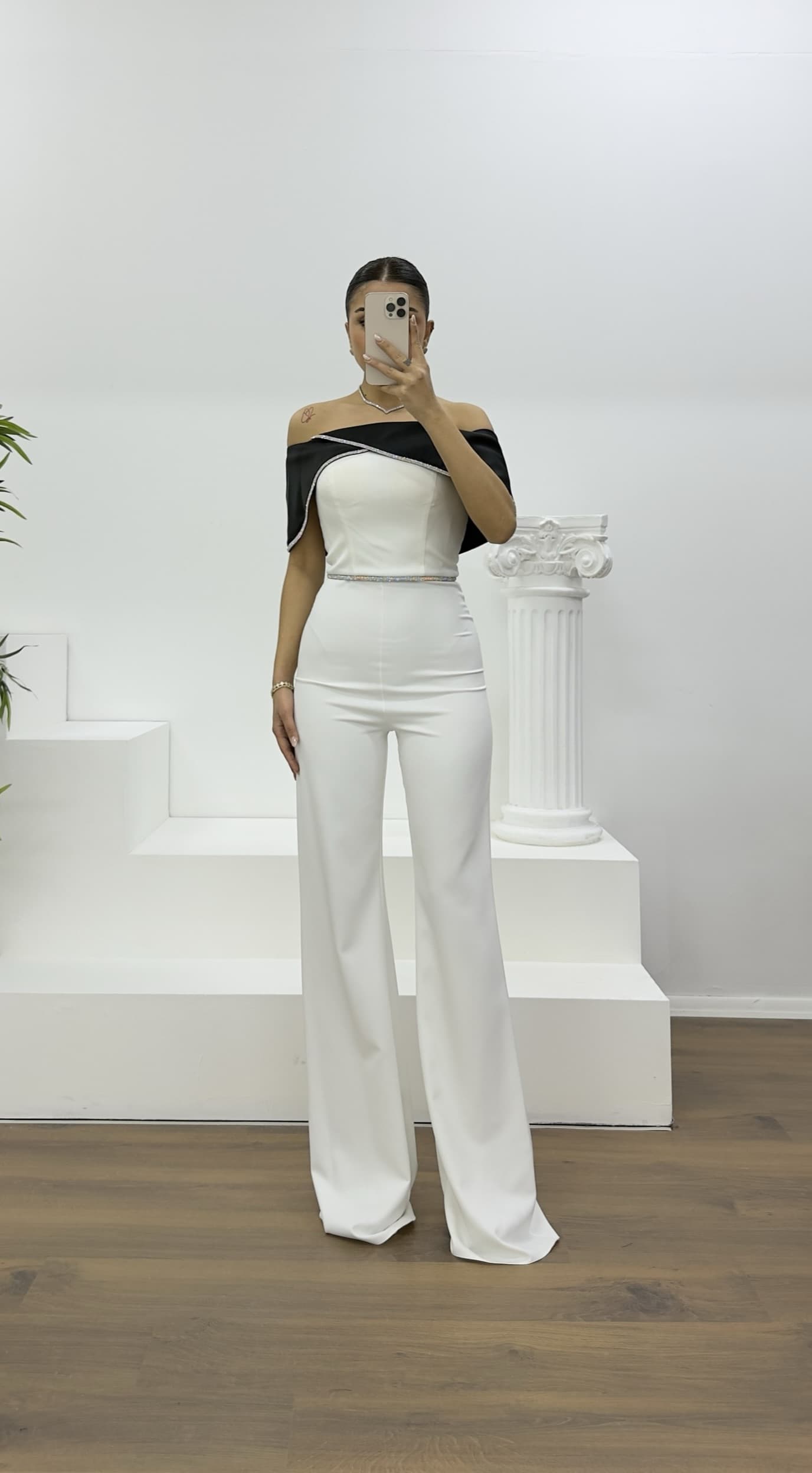Kayık yaka taş detay abiye tulum