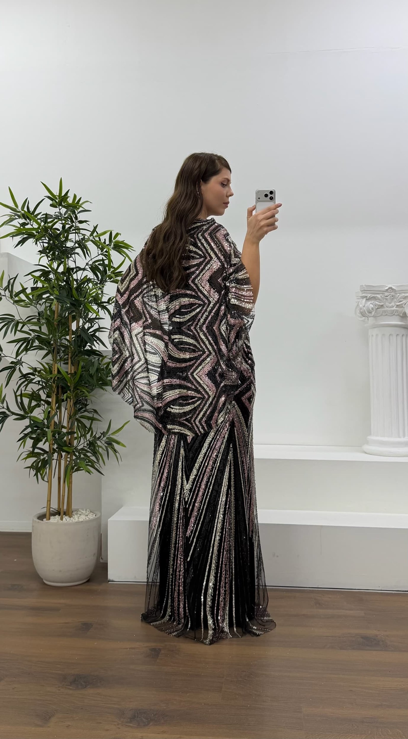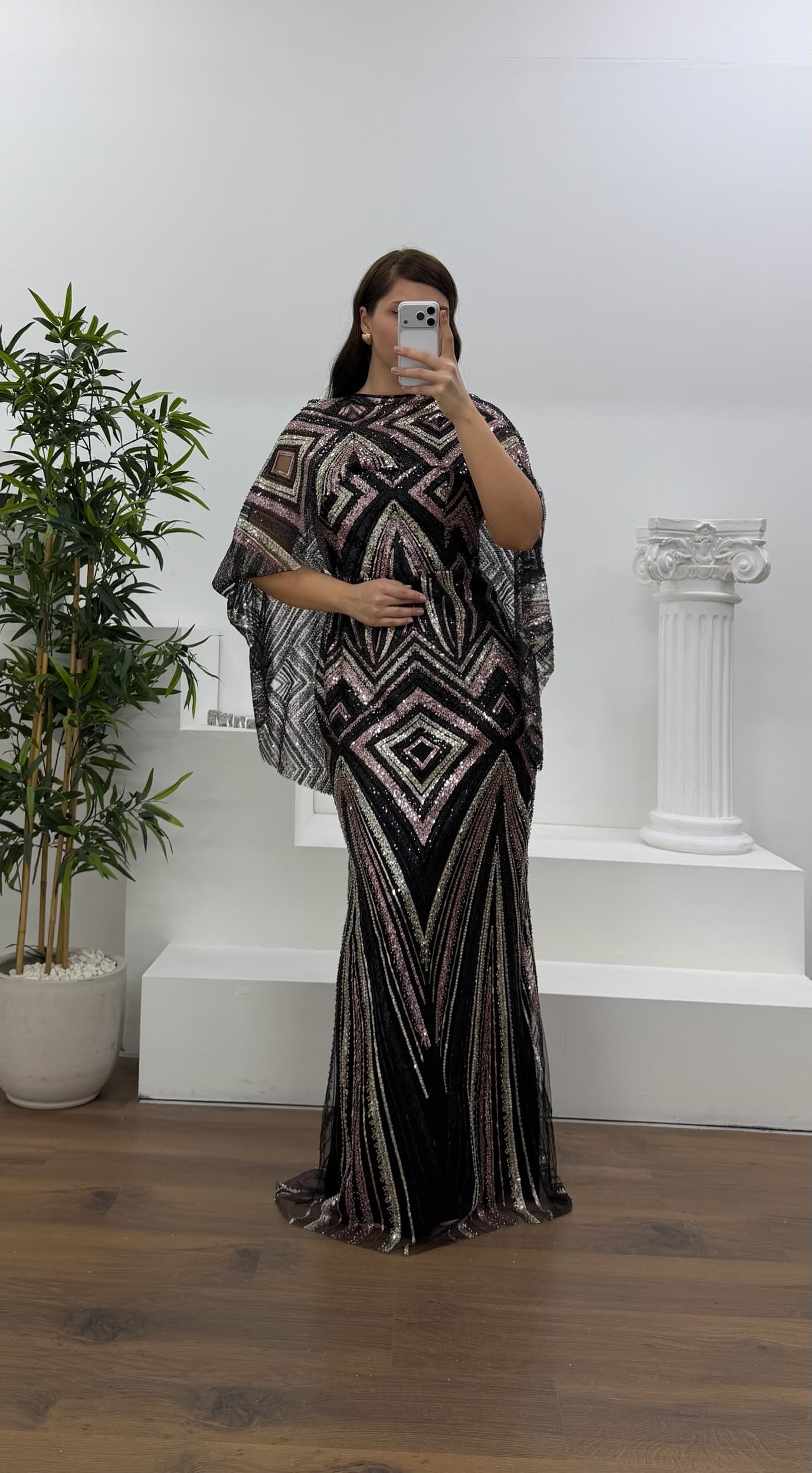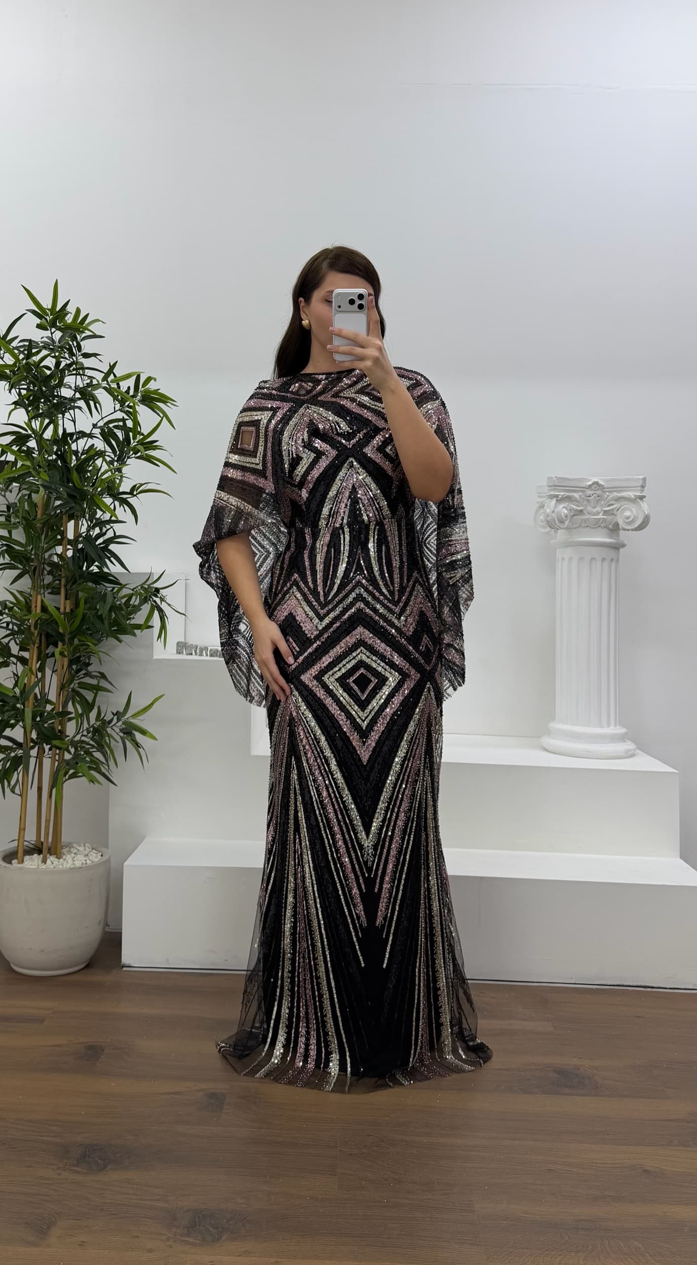 • Siyah Kolları Pelerin Detay Pul Payet Büyük Beden Abiye Elbise