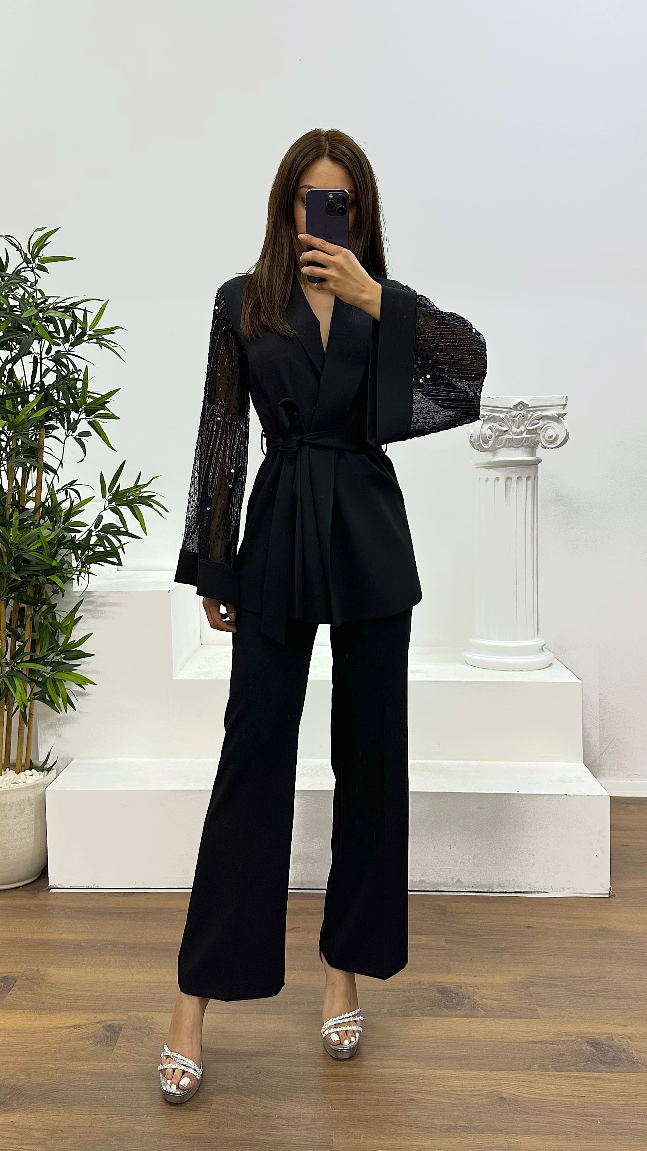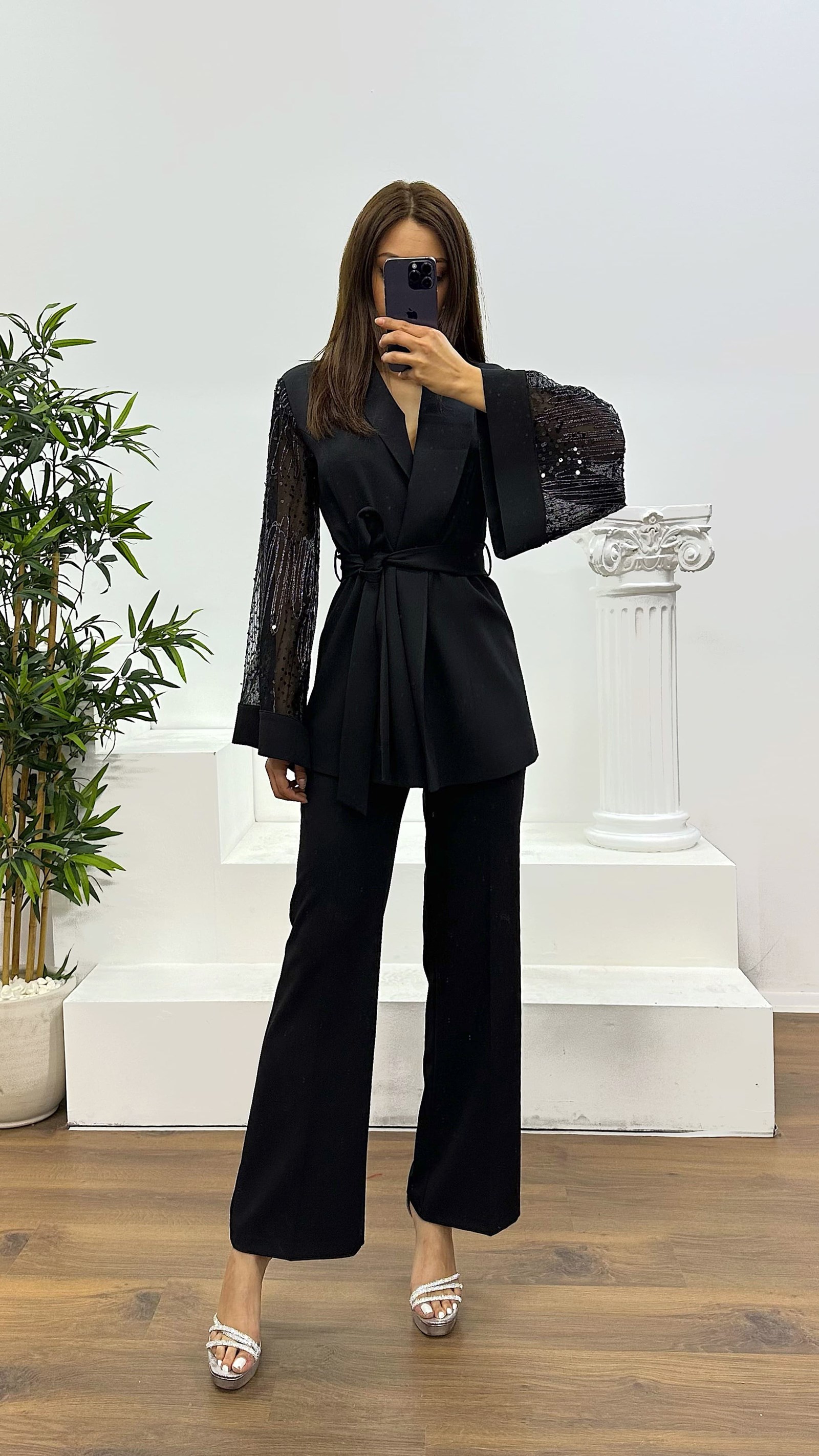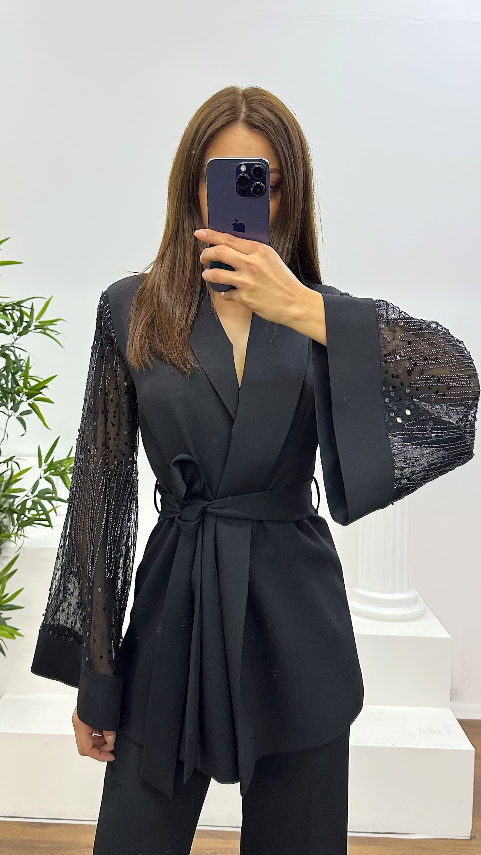 Ürün 36-44 bedene kadar uyumlu, astarlı, fermuarlı, ceket kuşaklı, kolları tül olarak tasarlanmıştır.