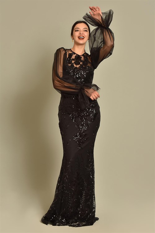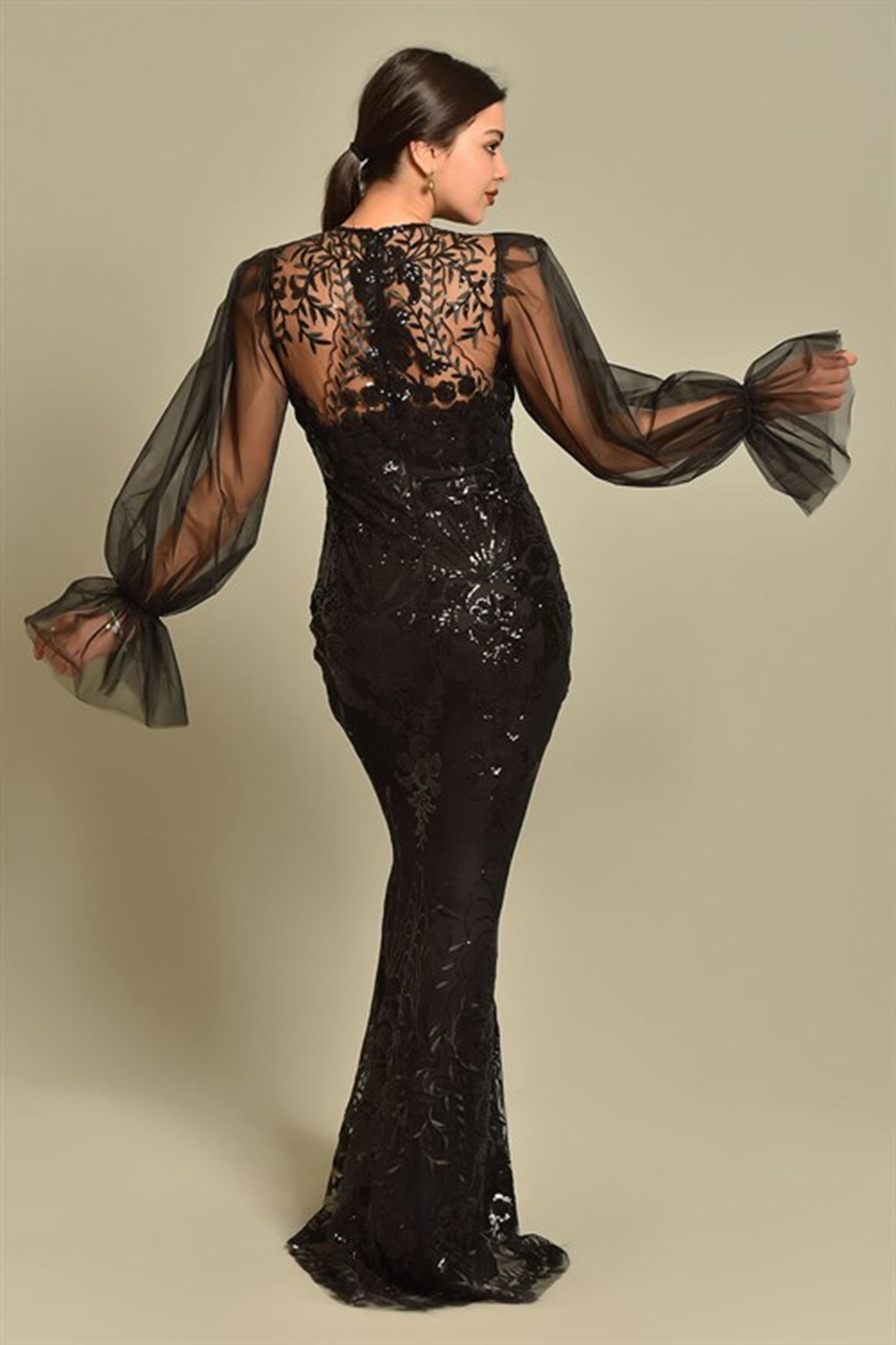 Siyah Kolları Tül Pul Payet Abiye Elbise
