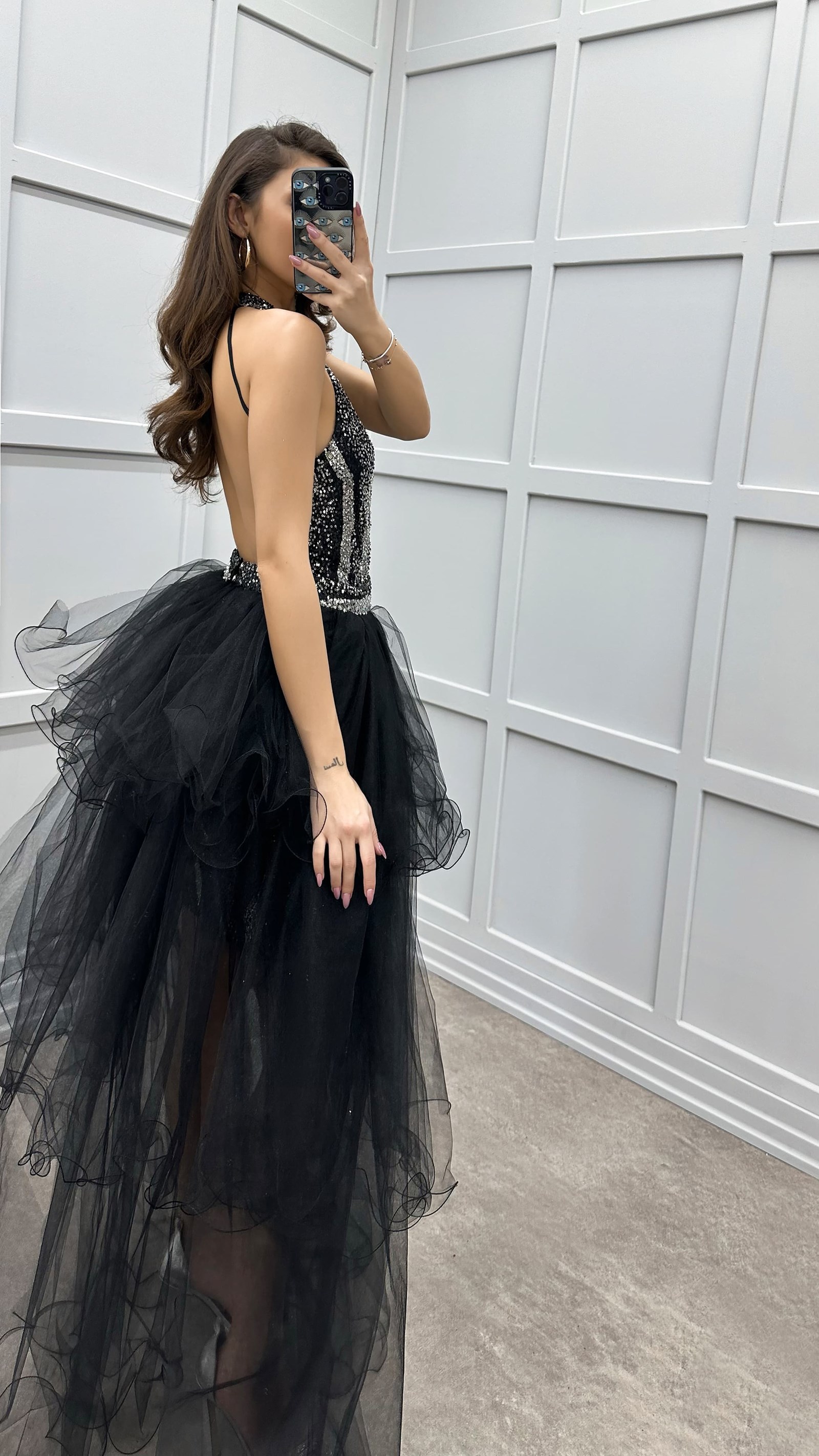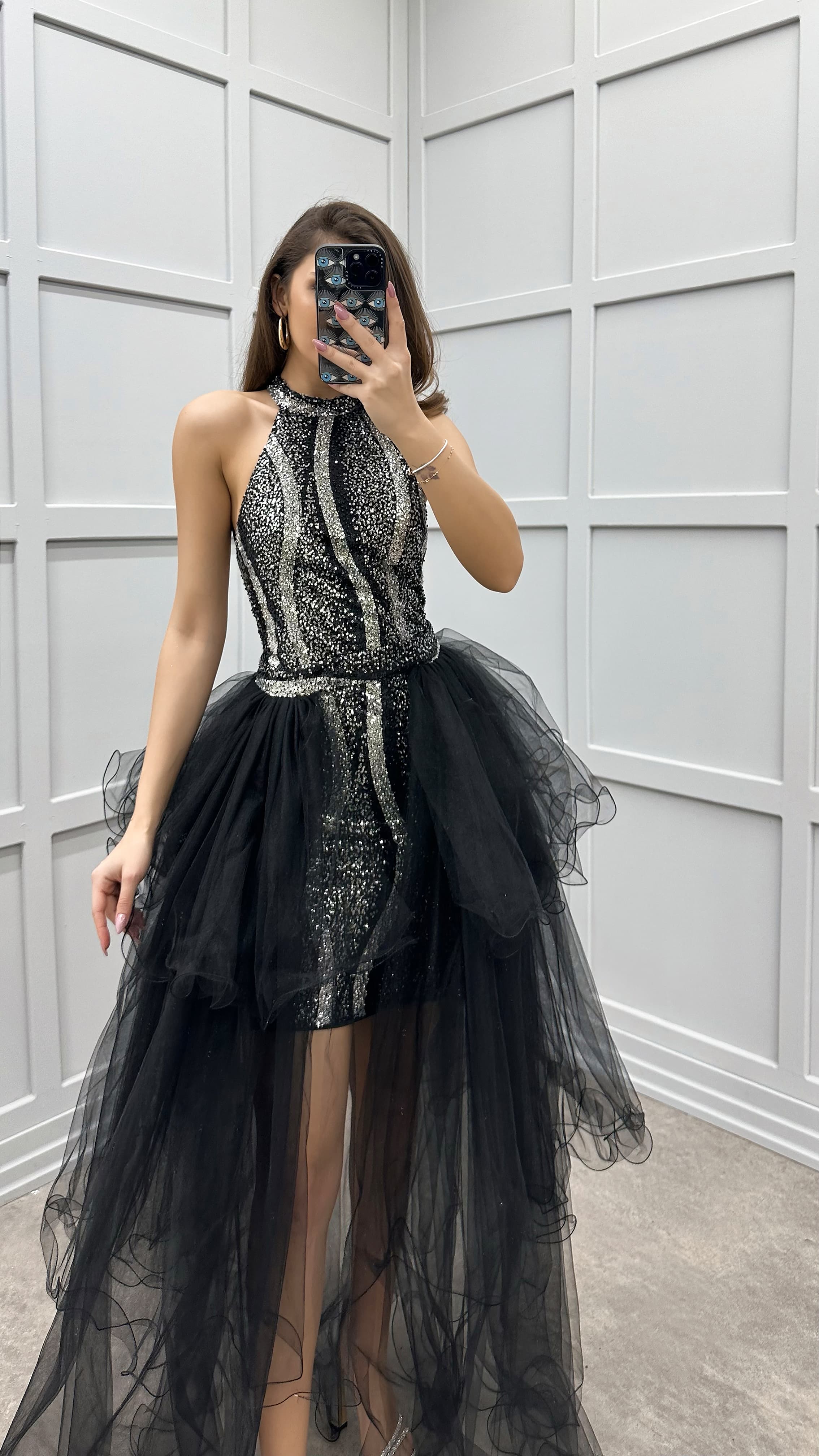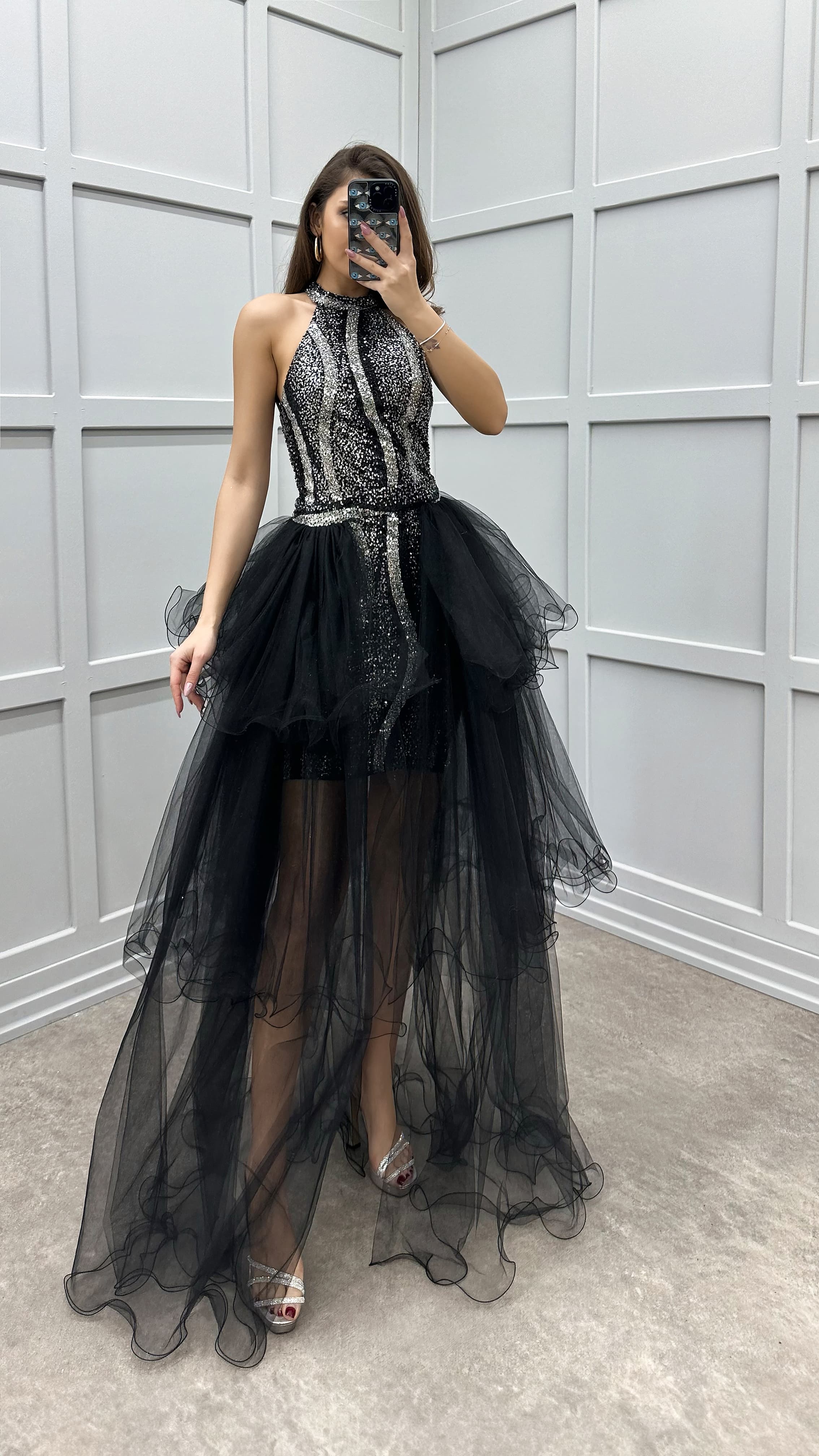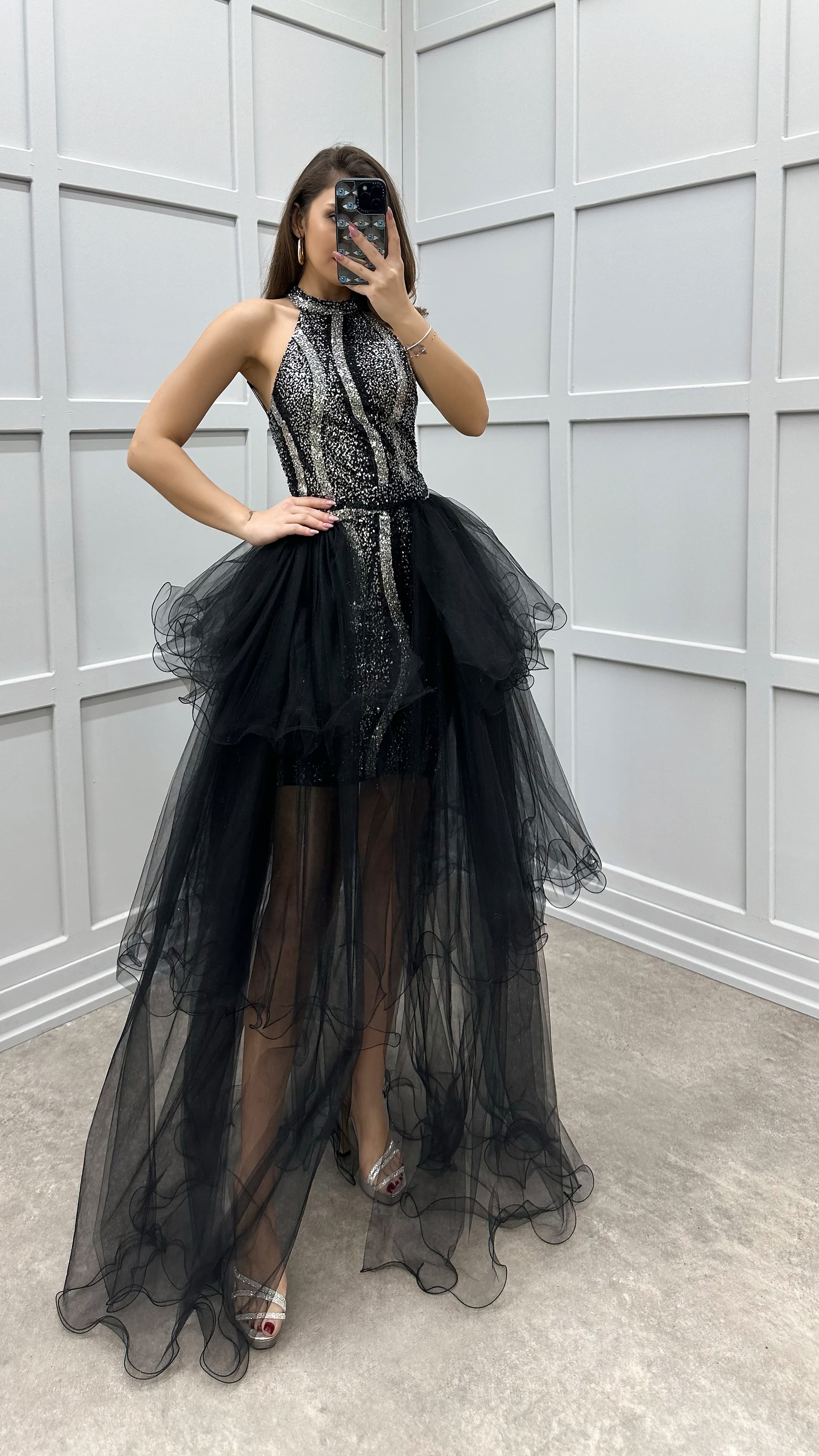 • Siyah Omuz Detay Pul İşlemeli Kat Kat Tasarım Tül Elbise