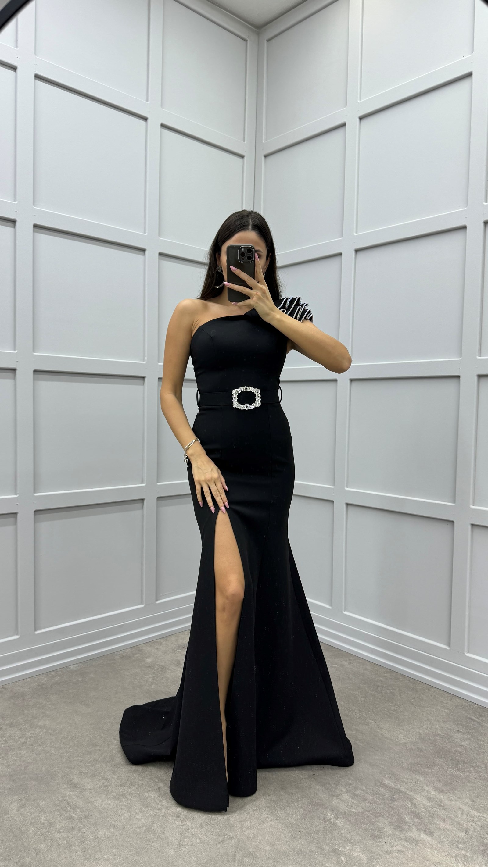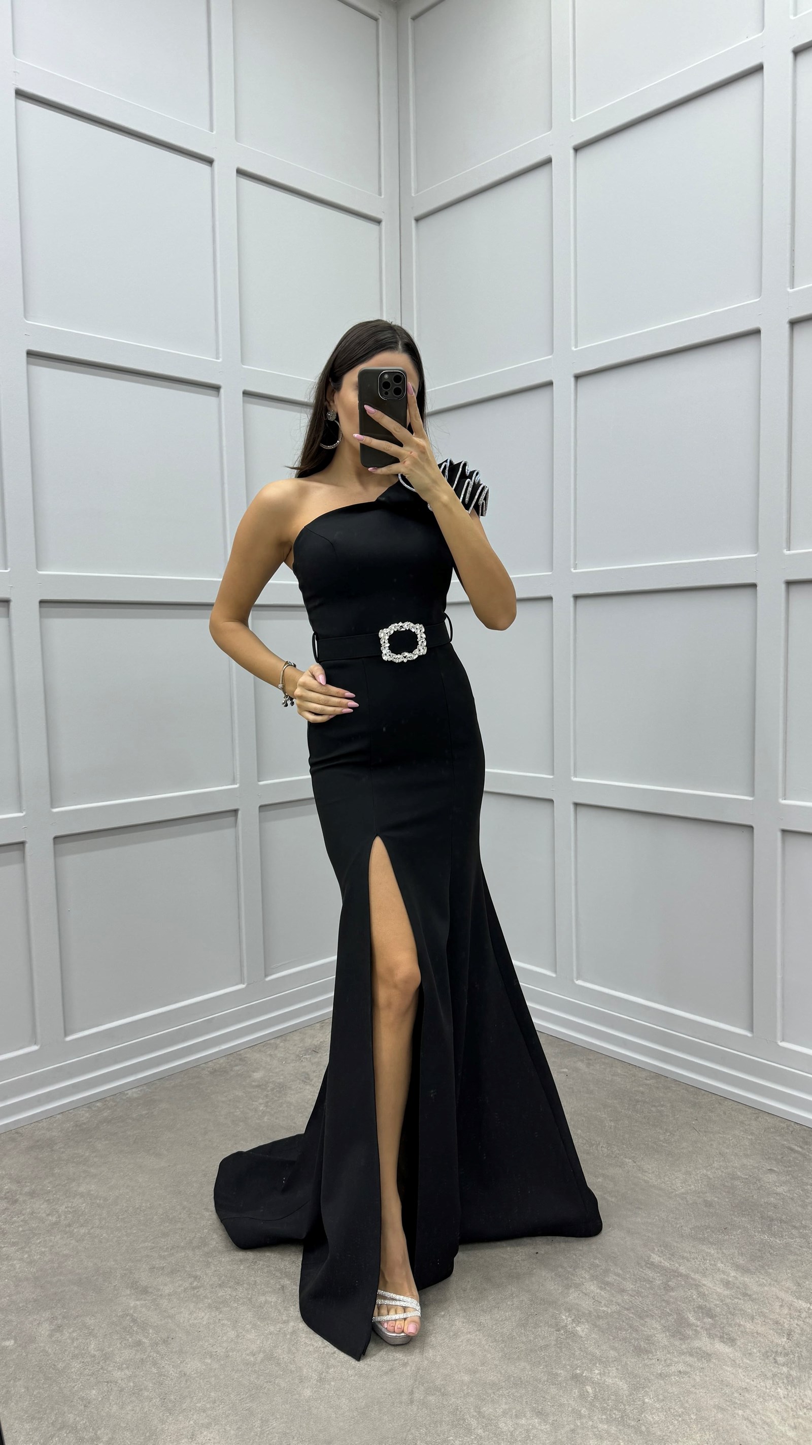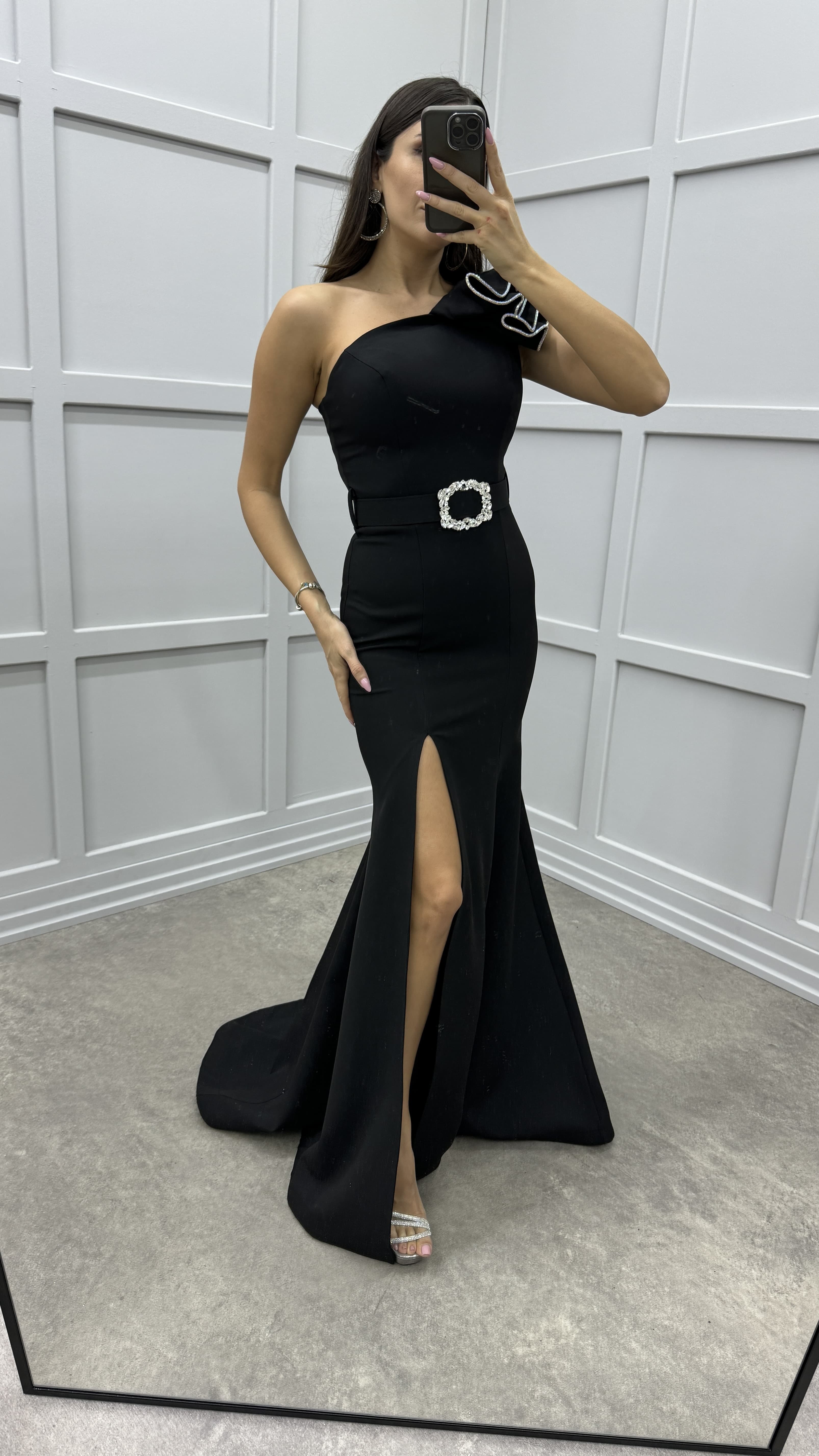 Siyah Omuzu Volanlı Kemerli Tasarım Abiye Elbise