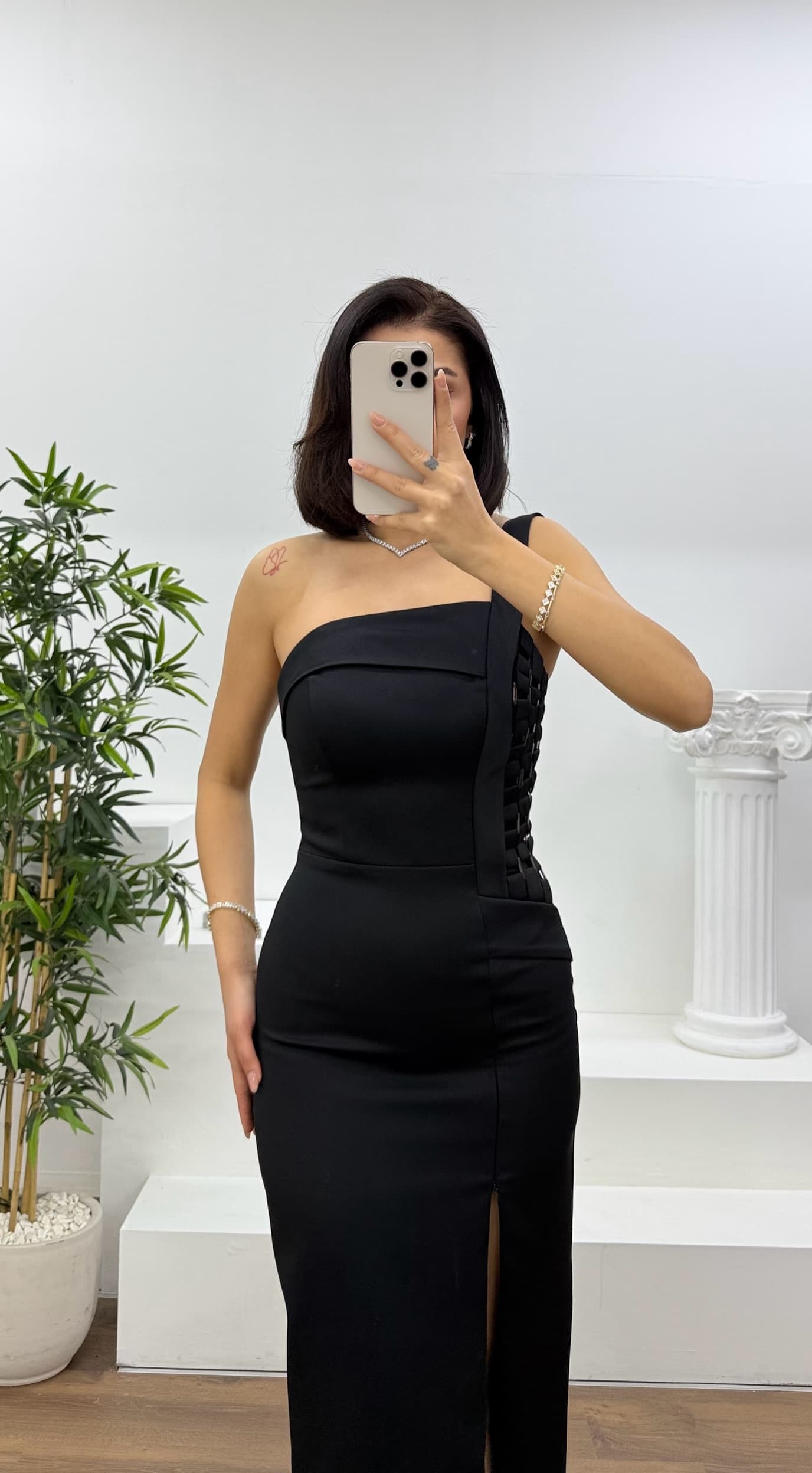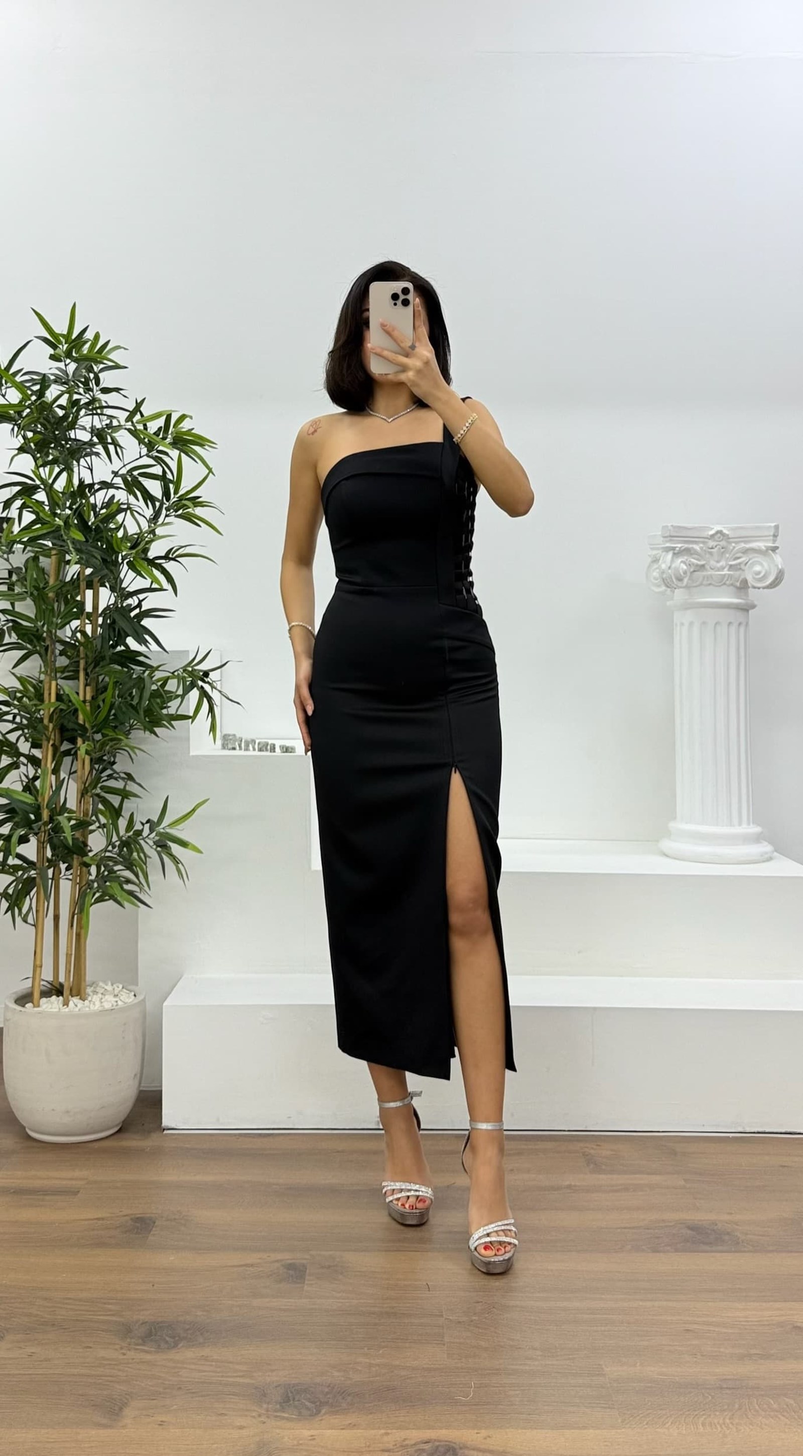 • Siyah Örgü Detaylı Tek Kol Askılı Kalem Abiye Elbise