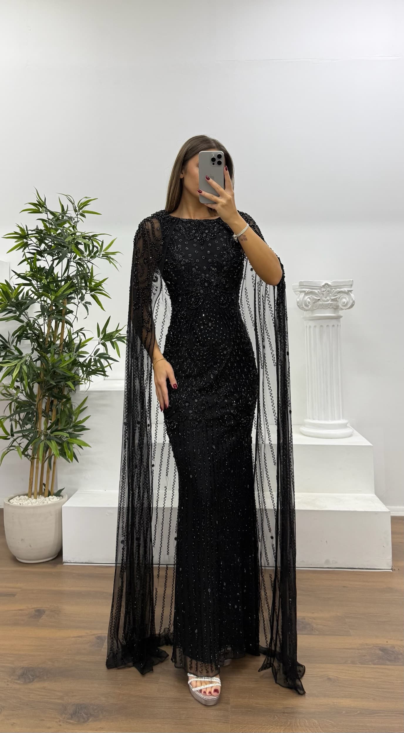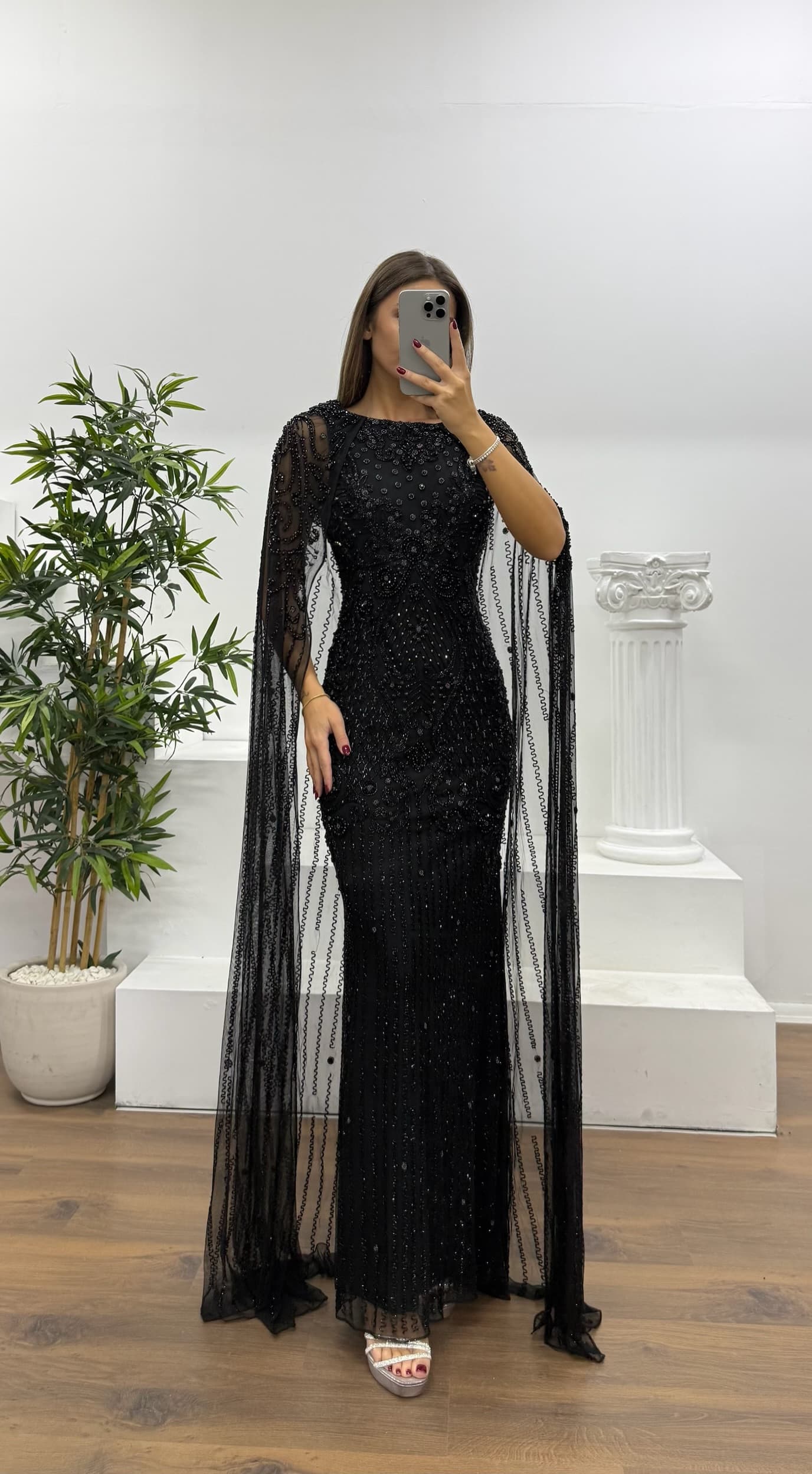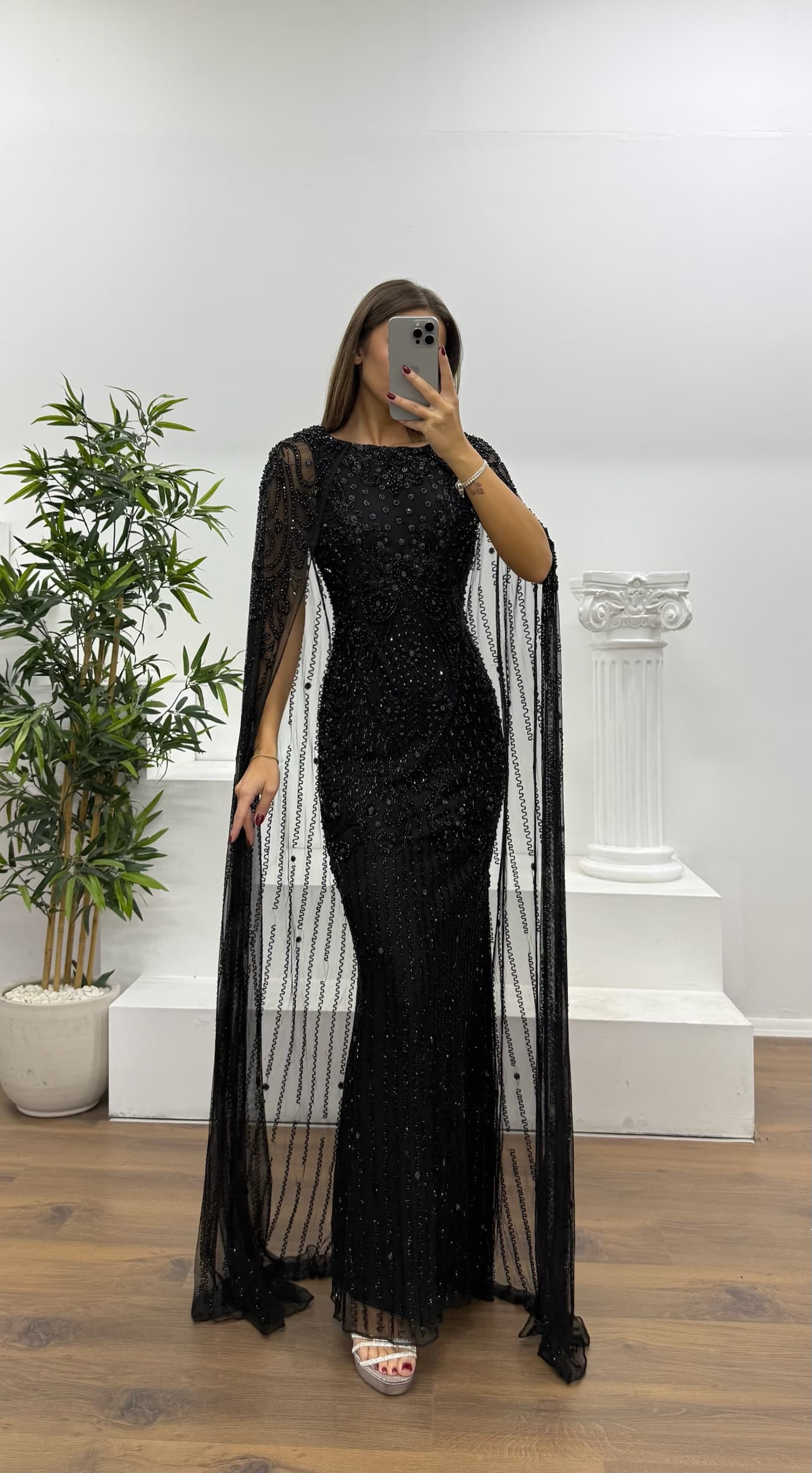 Siyah Pelerin Detay Özel El İşlemesi Abiye Elbise