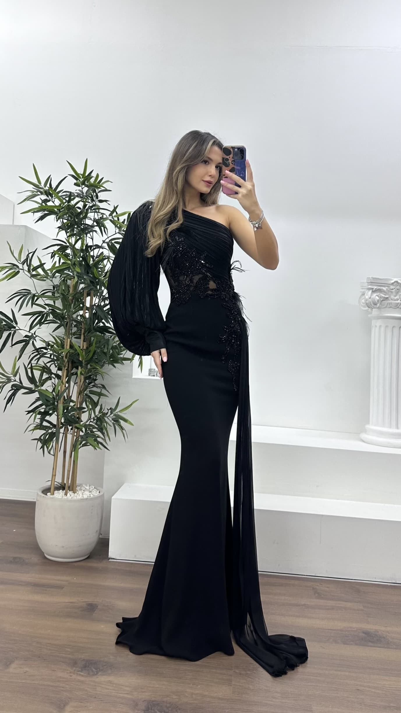 Pileli tek omuz çiçeklerle süslenmiş drapeli abiye elbise