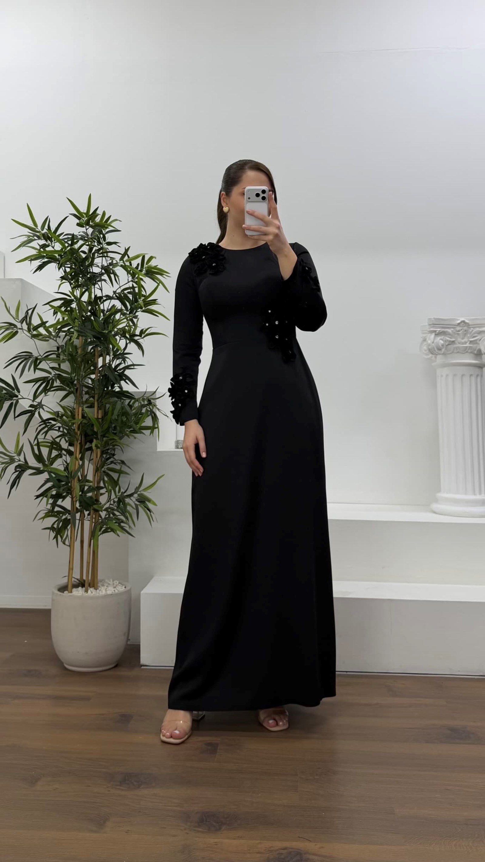 • Siyah Saten Çiçekli Tesettür Büyük Beden Abiye Elbise