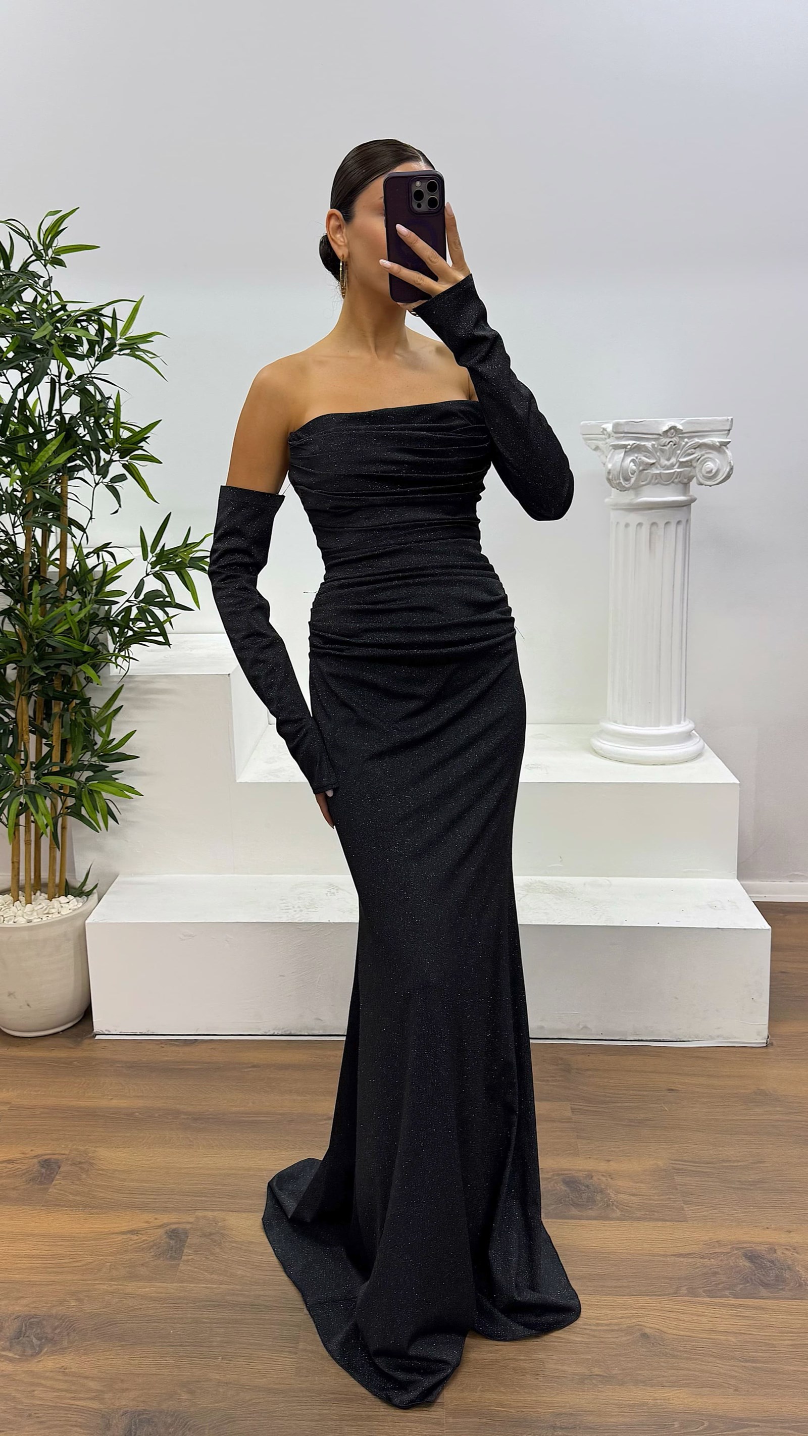 Ürün 36-44 bedene kadar uyumlu, göğüs pedli, astarlı, sırt capraz ip ve fermuar kapamalı, straplez, drapeli, eldivenli abiye olarak tasarlanmıştır.