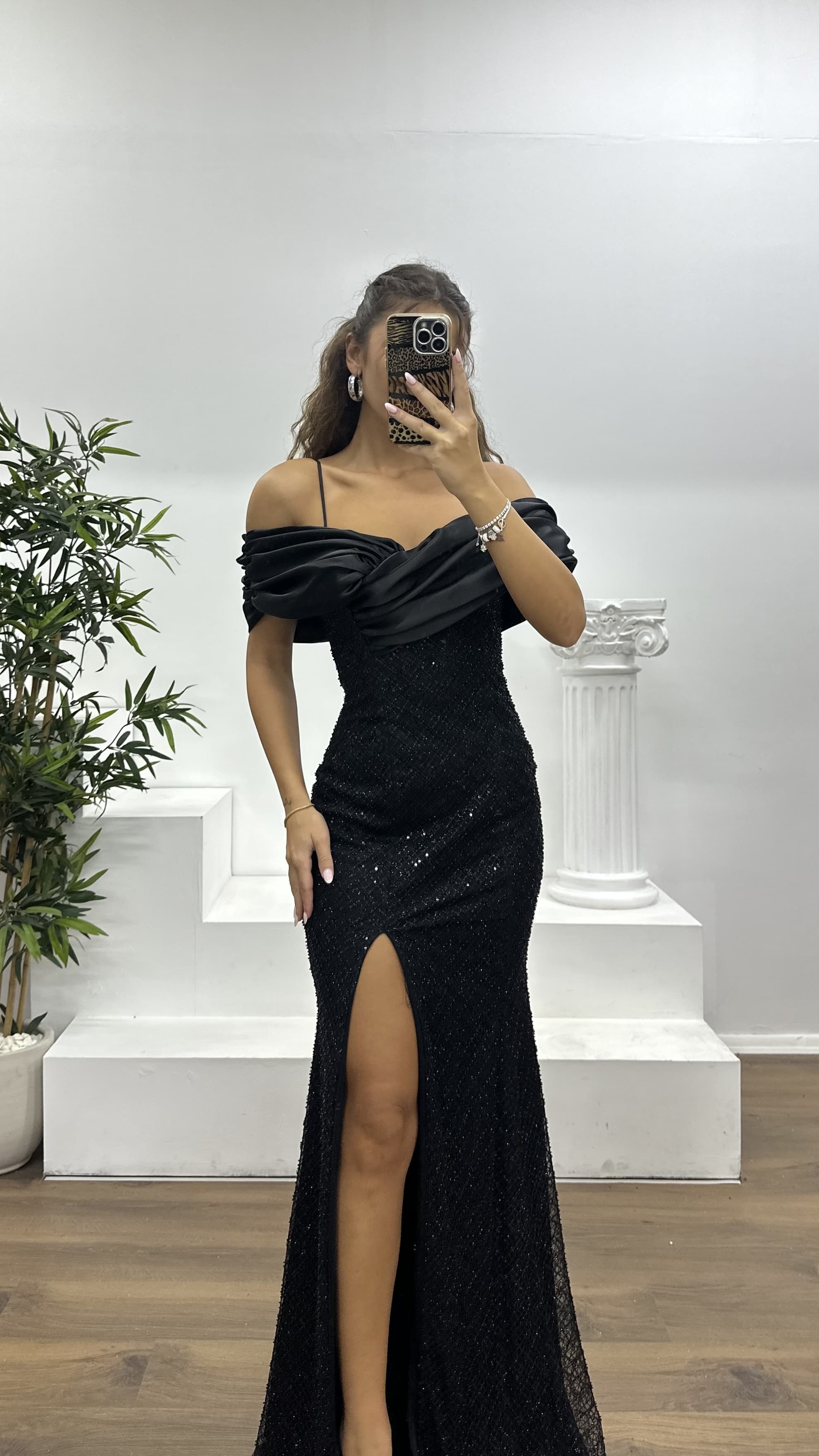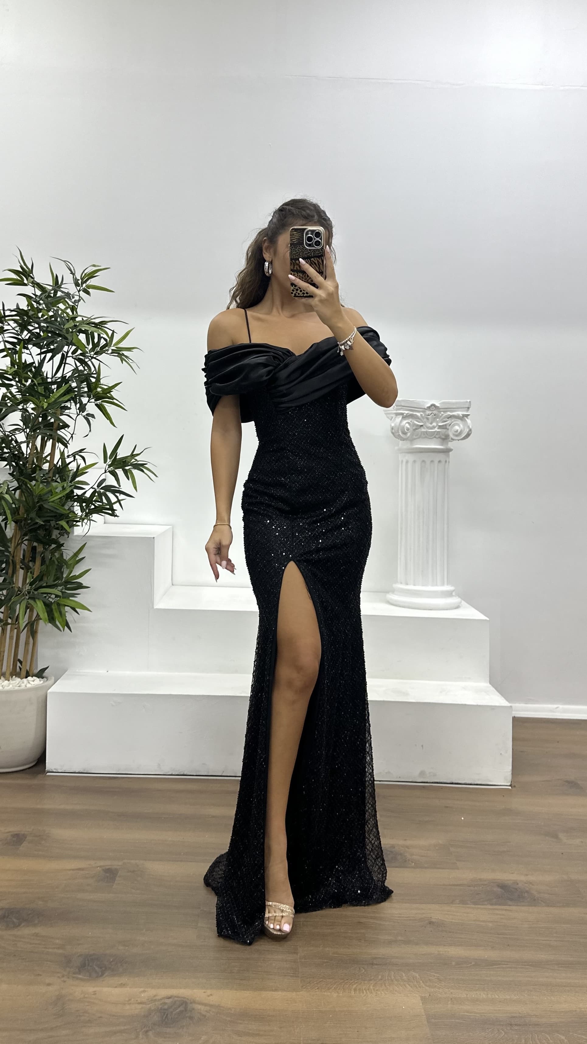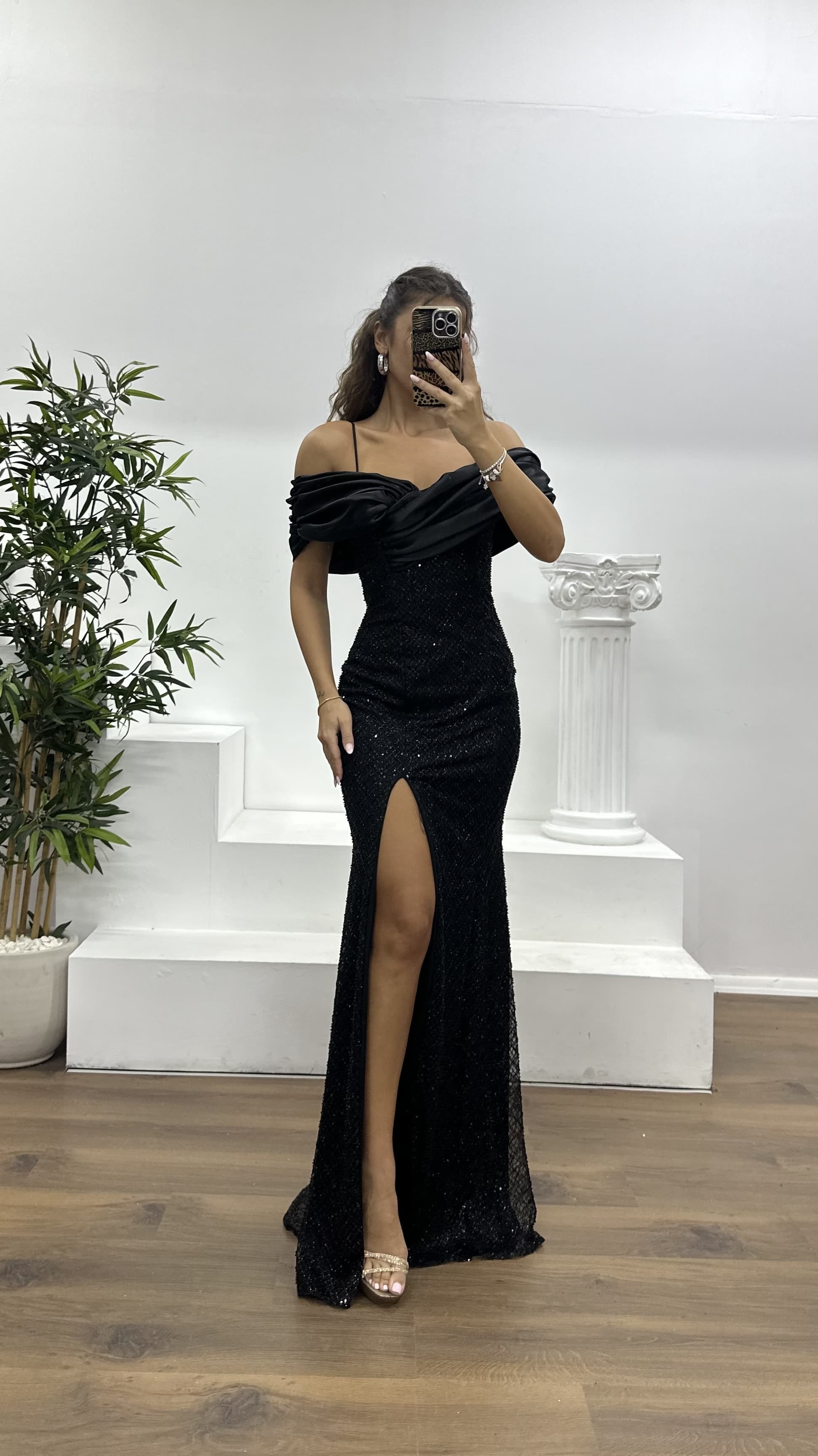 • Siyah Sırt Detay İşlemeli Abiye Elbise