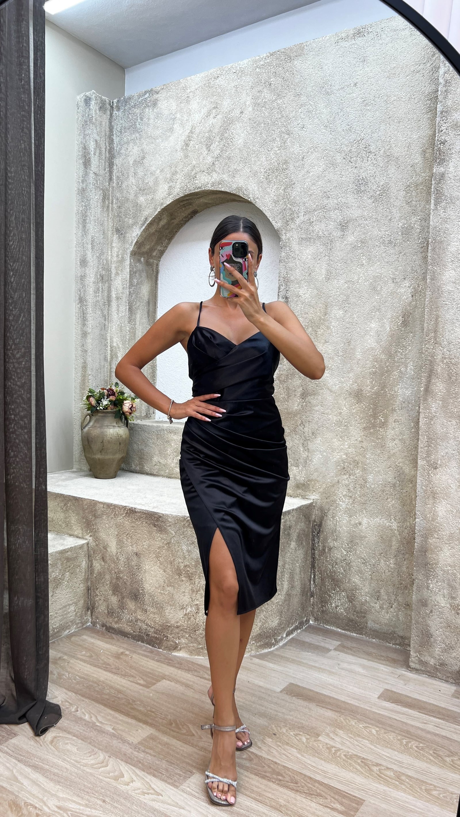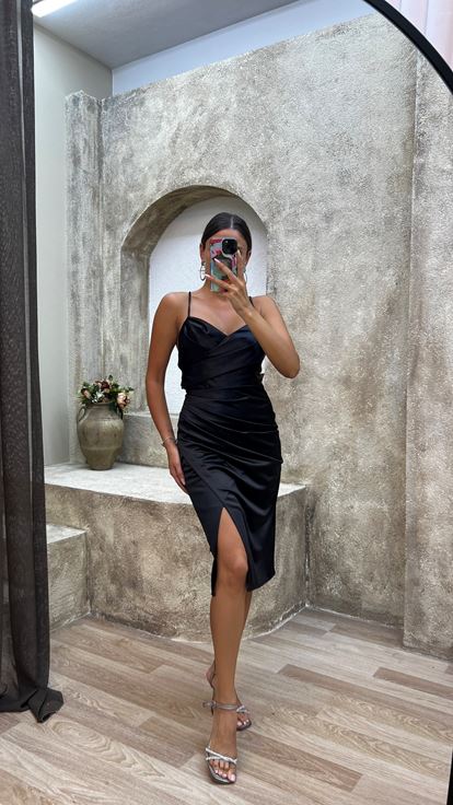 • Siyah Sırtı Çapraz Büzgülü Midi Elbise