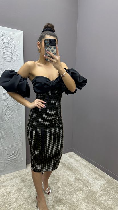 • Siyah Straplez Balon Kol Taş Detay Tasarım Elbise