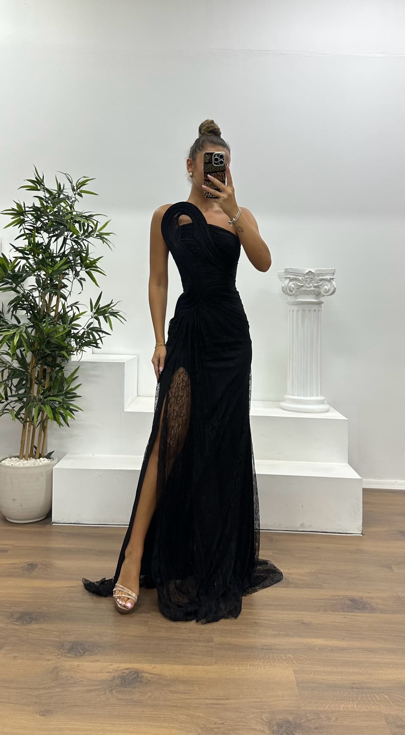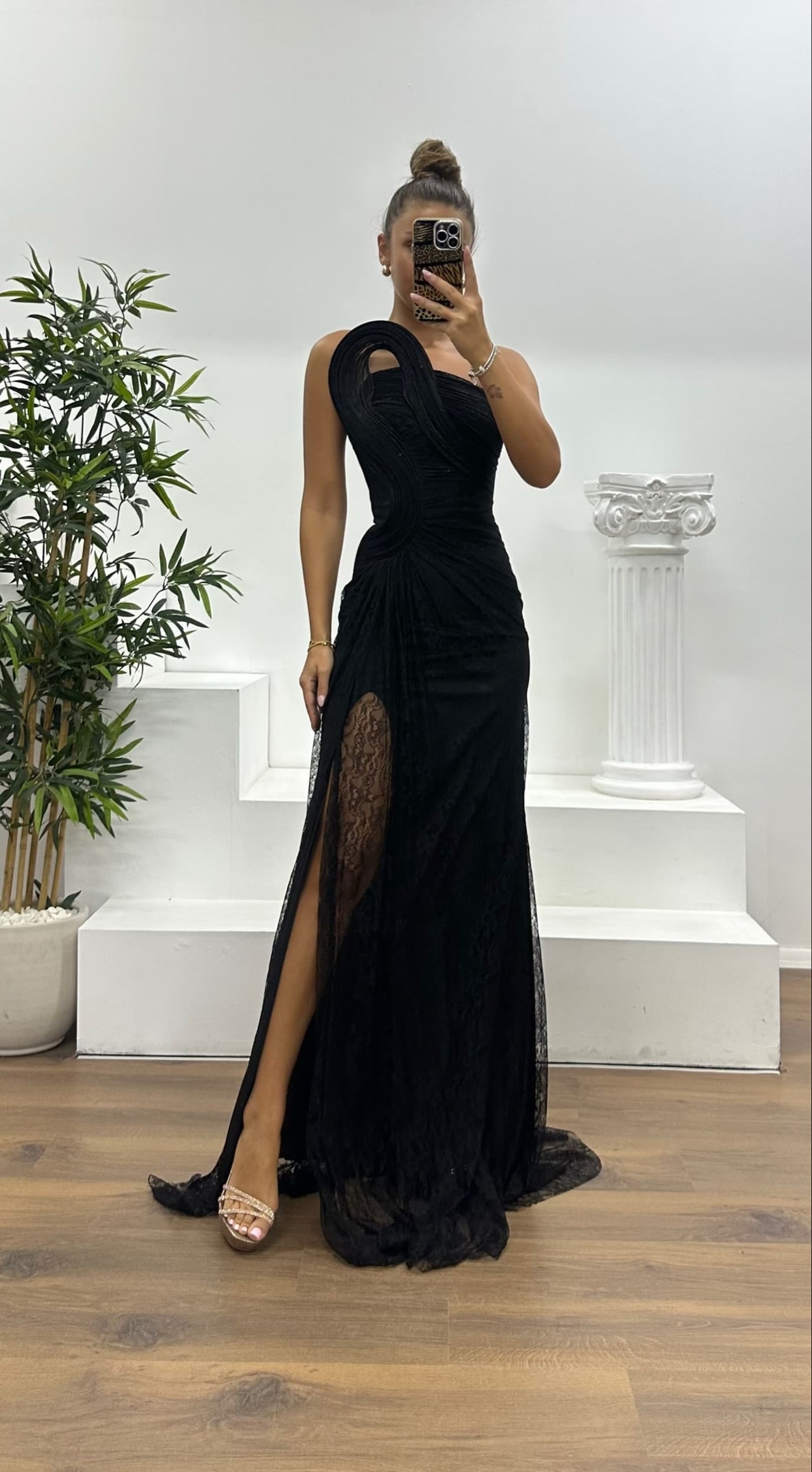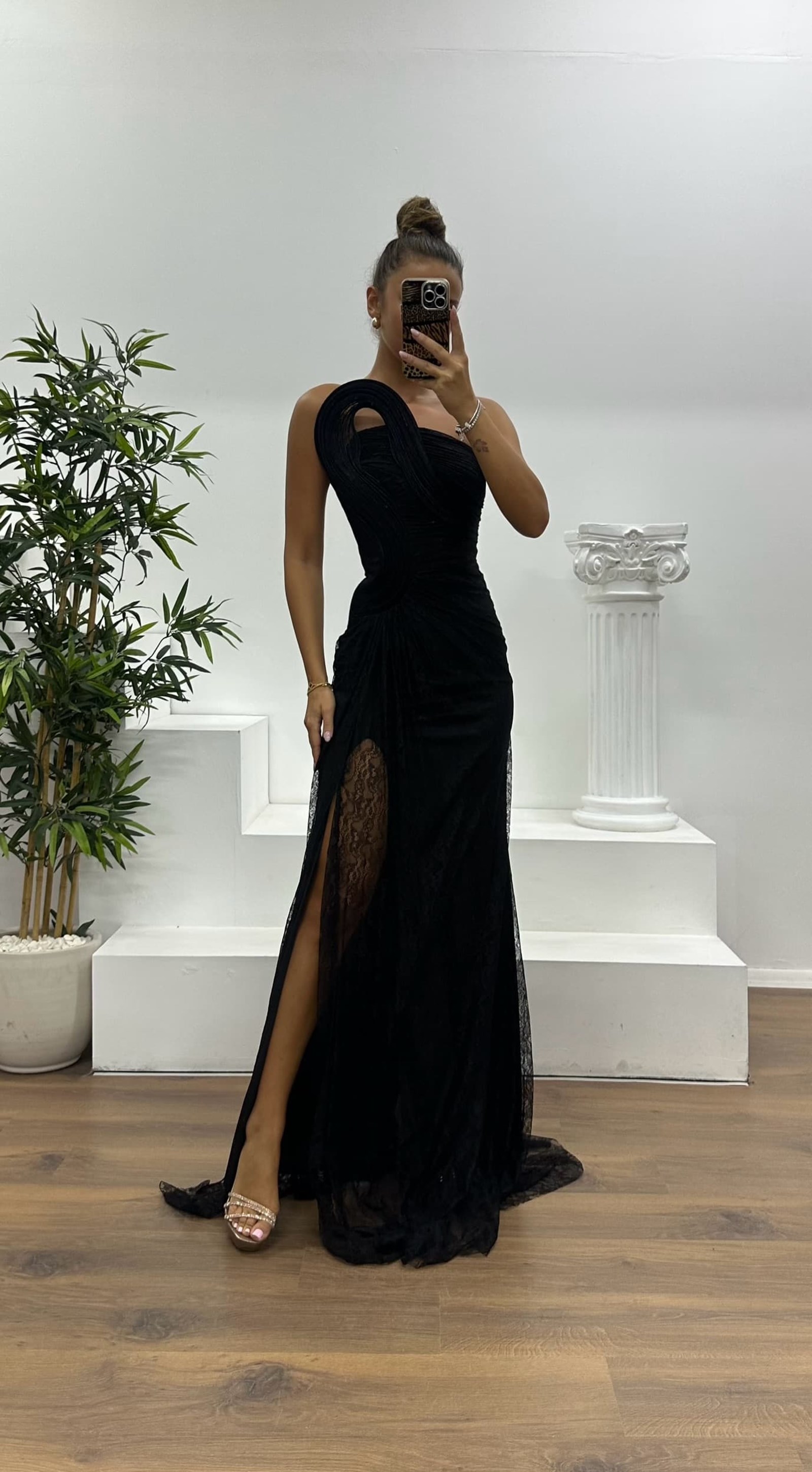 Ürün 36-44 bedene kadar uyumlu, göğüs pedli, astarlı, arka kapama fermuar, yırtmaçlı abiye olarak tasarlanmıştır.