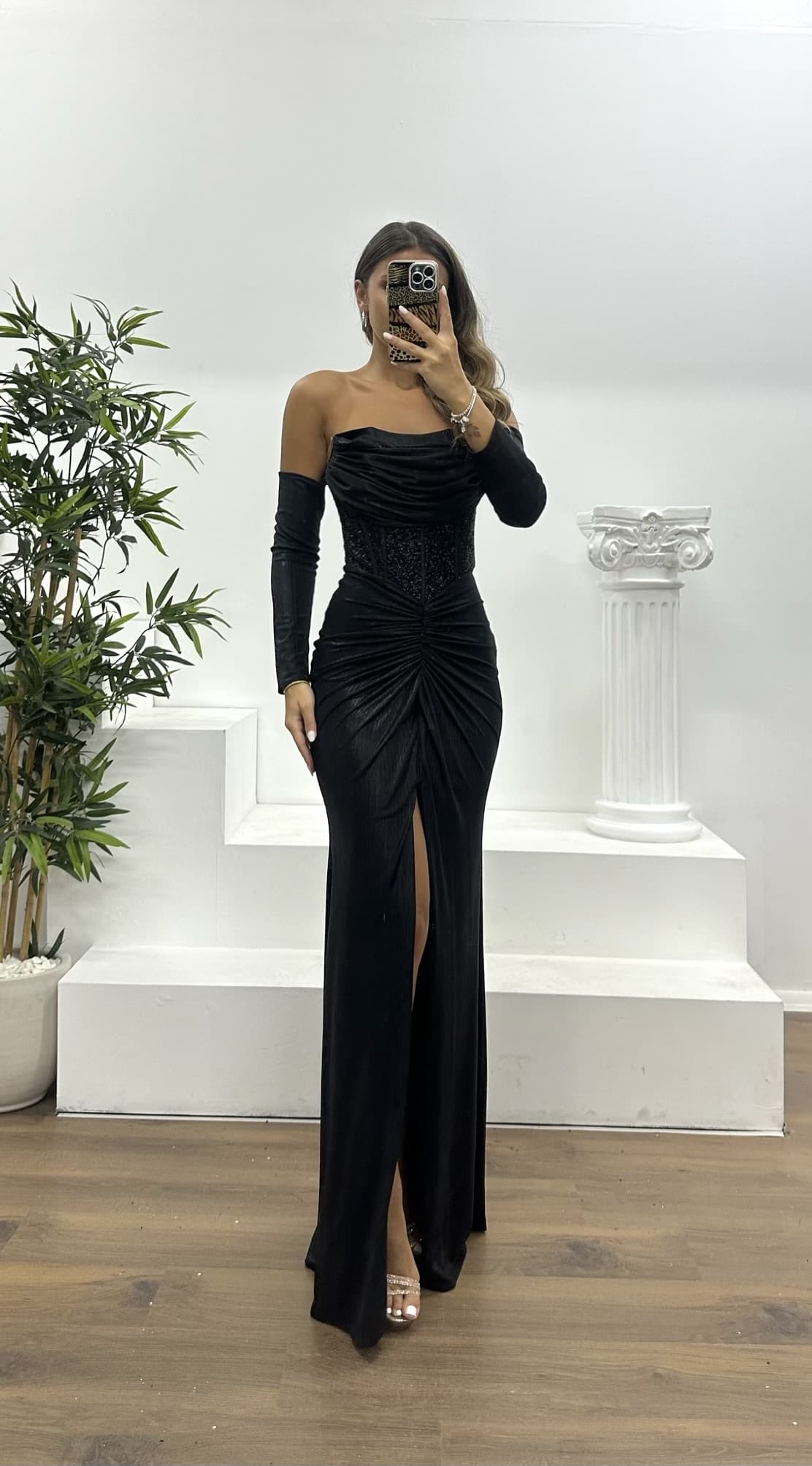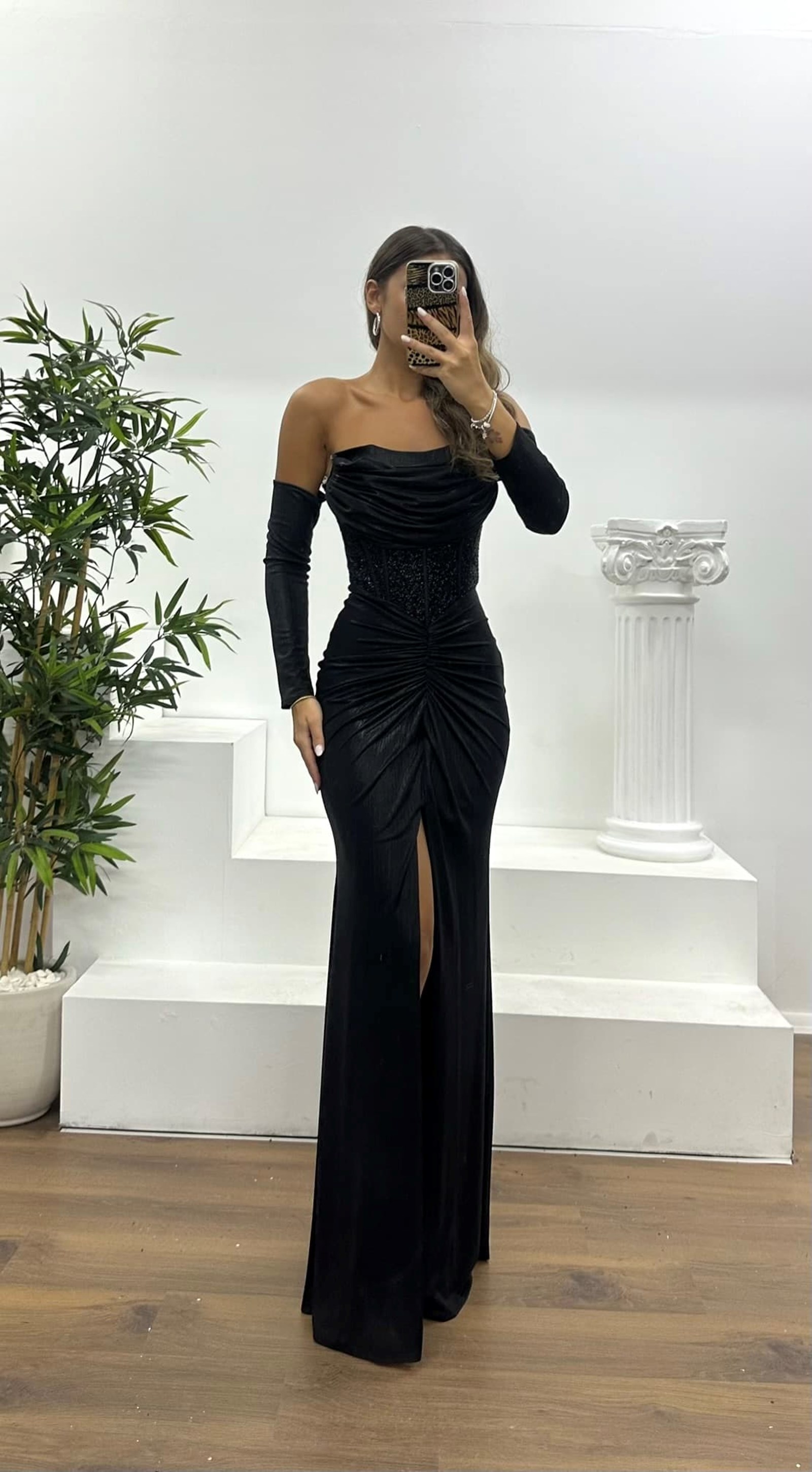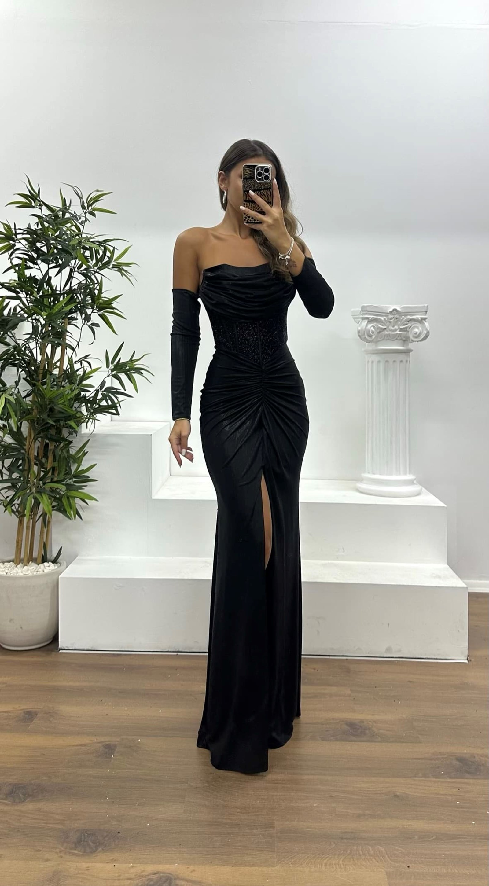 Ürün 36-42 bedene kadar uyumlu, göğüs pedli, astarlı, arka kapama fermuar, yırtmaçlı, eldivenli, bel detay abiye olarak tasarlanmıştır.