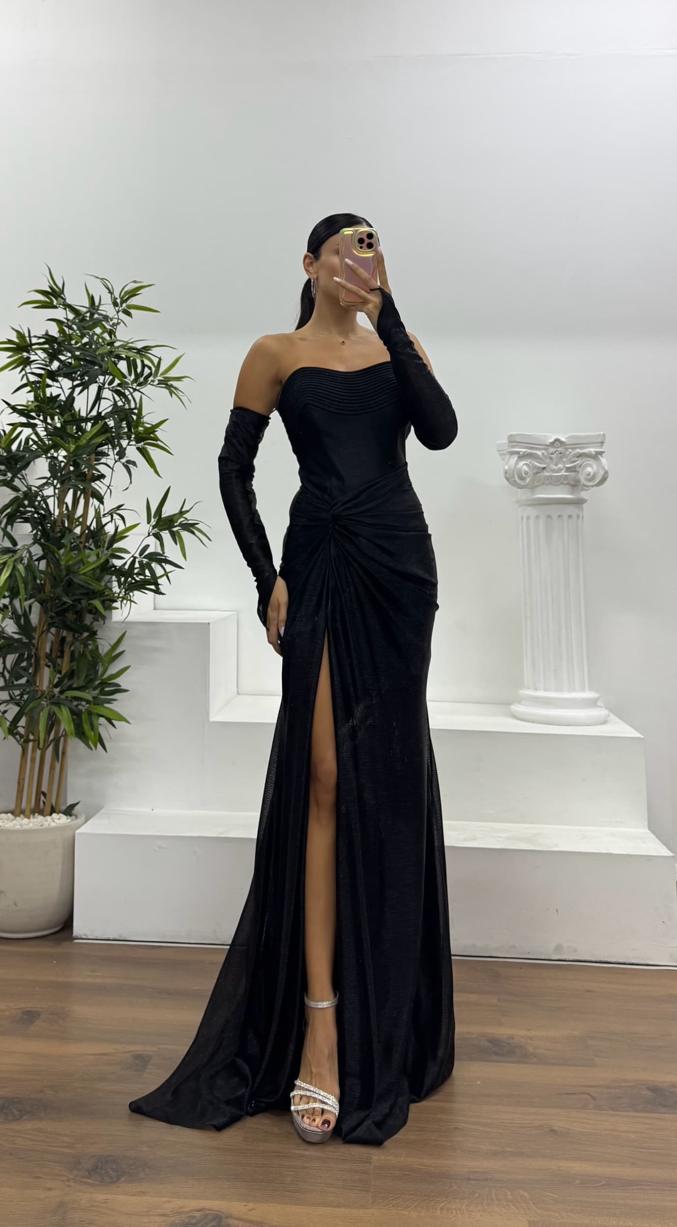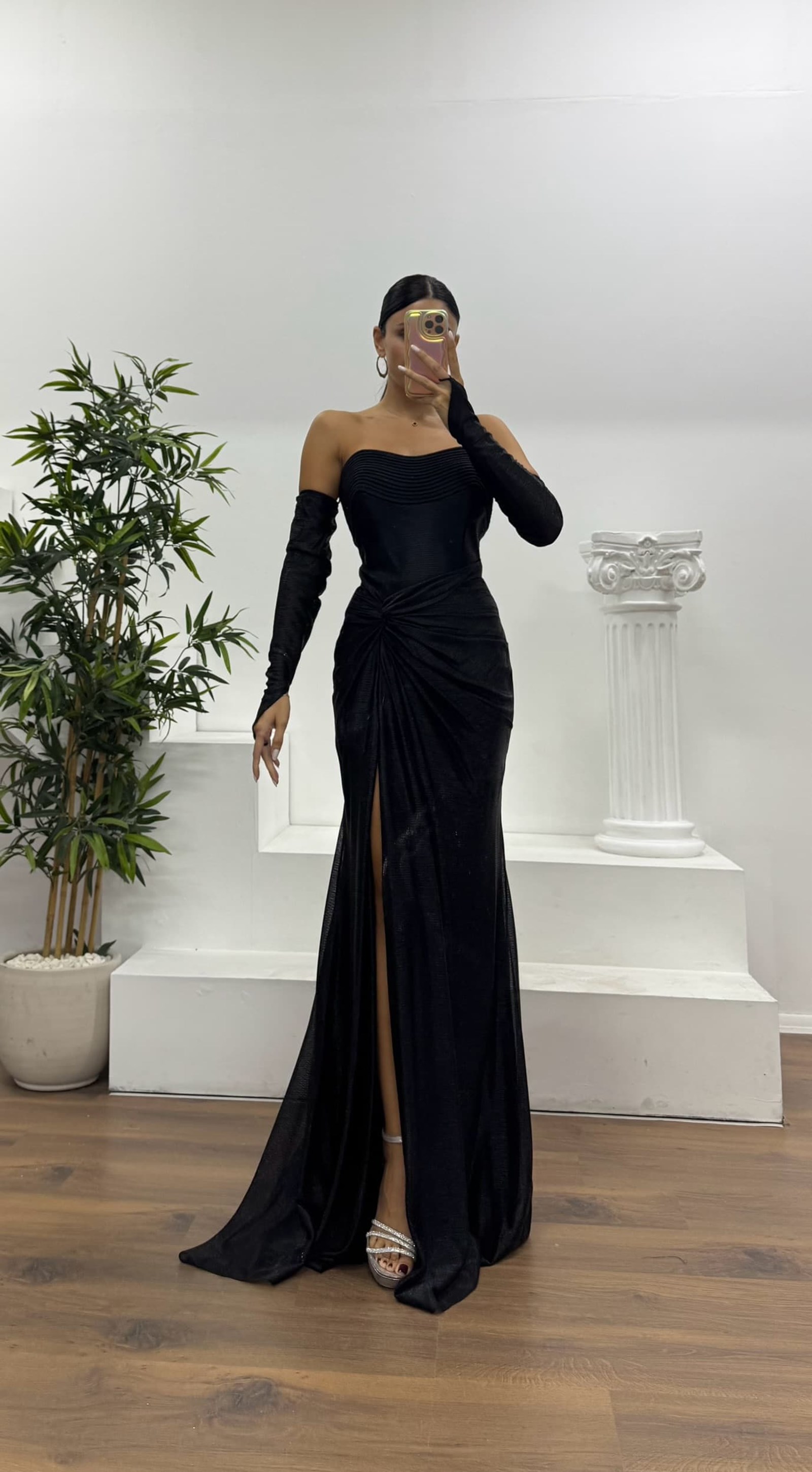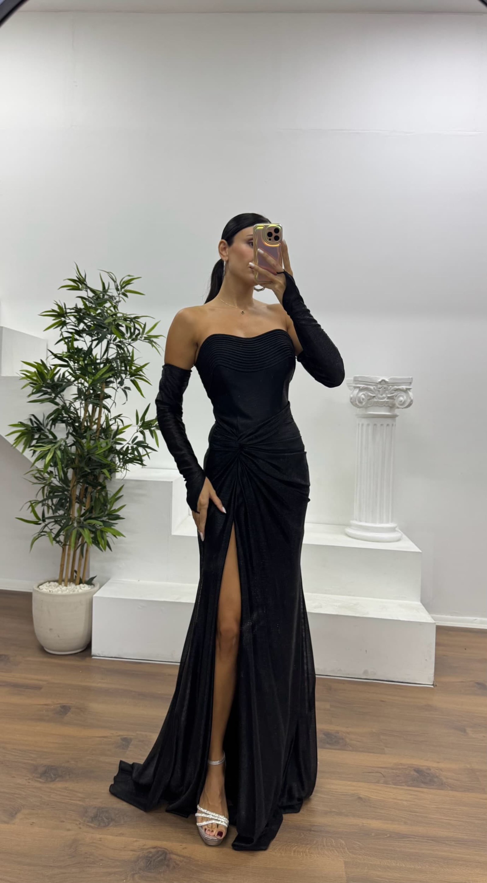 • Siyah-Gold Straplez Eldivenli Abiye Elbise